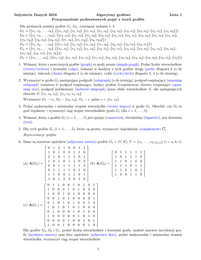 6. Dane są macierze sąsiedztw (adjacency matrix) grafów Gi = (V, E), V = {v1 , . . . , v|V (Gi )| } (i = a, b, c):