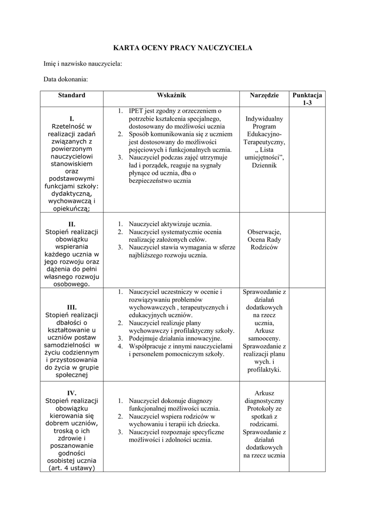 KARTA OCENY PRACY NAUCZYCIELA Imię i nazwisko nauczyciela: Data dokonania: Standard I. Rzetelność w realizacji zadań związanych z powierzonym nauczycielowi stanowiskiem oraz podstawowymi funkcjami szkoły: dydaktyczną, wychowawczą i opiekuńczą; II. Stopień realizacji obowiązku wspierania każdego ucznia w jego rozwoju oraz dążenia do pełni własnego rozwoju osobowego. III. Stopień realizacji dbałości o kształtowanie u uczniów postaw samodzielności w życiu codziennym i przystosowania do życia w grupie społecznej Wskaźnik 1. IPET jest zgodny z orzeczeniem o potrzebie kształcenia specjalnego, dostosowany do możliwości ucznia 2. Sposób komunikowania się z uczniem jest dostosowany do możliwości pojęciowych i funkcjonalnych ucznia. 3. Nauczyciel podczas zajęć utrzymuje ład i porządek, reaguje na sygnały płynące od ucznia, dba o bezpieczeństwo ucznia 1. Nauczyciel aktywizuje ucznia. 2. Nauczyciel systematycznie ocenia realizację założonych celów. 3. Nauczyciel stawia wymagania w sferze najbliższego rozwoju ucznia. 1. Nauczyciel uczestniczy w ocenie i rozwiązywaniu problemów wychowawczych , terapeutycznych i edukacyjnych uczniów. 2. Nauczyciel realizuje plany wychowawczy i profilaktyczny szkoły. 3. Podejmuje działania innowacyjne. 4. Współpracuje z innymi nauczycielami i personelem pomocniczym szkoły. IV. Stopień realizacji obowiązku kierowania się dobrem uczniów, troską o ich zdrowie i poszanowanie godności osobistej ucznia (art. 4 ustawy) 1. Nauczyciel dokonuje diagnozy funkcjonalnej możliwości ucznia. 2. Nauczyciel wspiera rodziców w wychowaniu i terapii ich dziecka. 3. Nauczyciel rozpoznaje specyficzne możliwości i zdolności ucznia. Narzędzie Indywidualny Program EdukacyjnoTerapeutyczny, „ Lista umiejętności”, Dziennik Obserwacje, Ocena Rady Rodziców Sprawozdanie z działań dodatkowych na rzecz ucznia, Arkusz samooceny. Sprawozdanie z realizacji planu wych. i profilaktyki. Arkusz diagnostyczny Protokoły ze spotkań z rodzicami. Sprawozdanie z działań dodatkowych na rzecz ucznia Punktacja 1-3 V. Stopień realizacji w ramach ustalonego czasu pracy (art. 42 ust. 2 ustawy): zajęć dydaktycznych, wychowawczych i opiekuńczych, prowadzonych bezpośrednio z uczniami lub wychowankami albo na ich rzecz, VI. Stopień realizacji w ramach ustalonego czasu pracy (art. 42 ust. 2 ustawy): innych czynności i zajęć wynikających z zadań statutowych szkoły, ze szczególnym uwzględnieniem zajęć edukacyjnych, opiekuńczych i wychowawczych uwzględniających potrzeby i zainteresowania uczniów, VII. Stopień realizacji w ramach ustalonego czasu pracy (art. 42 ust. 2 usta zajęć i czynności związanych z przygotowaniem się do zajęć, 1. Nauczyciel w pełni wykorzystuje czas pracy z uczniem. 2. Przestrzega ustalonych terminów, zgodnych z harmonogramem pracy i nałożonymi obowiązkami dodatkowymi. 3. Terminowo i zgodnie z obowiązującą procedurą wypełnia dokumentację szkolną. 1. Dba o kulturę osobistą w kontaktach z uczniami, rodzicami, pracownikami i innymi osobami. 2. Upowszechnia swoje osiągnięcia i dzieli się nimi z innymi pracownikami szkoły. 3. Promuje szkołę w środowisku. 1. Nauczyciel dokonuje samooceny i planuje swój rozwój zawodowy, zgodny z planem rozwoju placówki. 2. Nauczyciel korzysta z nowości książkowych i artykułów w prasie dotyczących zagadnień autyzmu. 3. Bierze udział w WDN. Wnioski nauczyciela. Dziennik, Obserwacja, Uwagi dyrektora dot. realizacji ustaleń. Obserwacja, Uwagi dyrektora dot. realizacji ustaleń. Obserwacja, Uwagi rodziców, Protokoły z spotkań WDN, Arkusz samooceny. Arkusz samooceny, Zaświadczenia samokształceniem i doskonaleniem zawodowym. o ukończonych kursach i szkoleniach, lista obecności na WDN Razem OCENA WG PUNKTACJI : Uwagi: Punktacja: 66 pkt - 46 pkt. - ocena wyróżniająca 45 pkt - 25 pkt - ocena dobra 24 pkt - 0 pkt - ocena negatywna Data i podpis dyrektora: Data i podpis nauczyciela ocenianego :