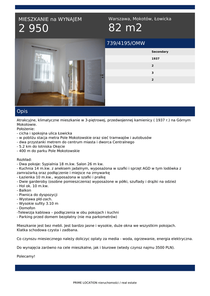 MIESZKANIE na WYNAJEM 2 950 Warszawa, Mokotów, Łowicka 82 m2 739/4195/OMW Secondary 1937 2 3 2 Opis Atrakcyjne, klimatyczne mieszkanie w 3-piętrowej, przedwojennej kamienicy ( 1937 r.) na Górnym Mokotowie. Położenie: - cicha i spokojna ulica Łowicka - w pobliżu stacja metra Pole Mokotowskie oraz sieć tramwajów i autobusów - dwa przystanki metrem do centrum miasta i dworca Centralnego - 5.2 km do lotniska Okęcie - 400 m do parku Pole Mokotowskie Rozkład: - Dwa pokoje: Sypialnia 18 m.kw. Salon 26 m kw. - Kuchnia 14 m.kw. z aneksem jadalnym, wyposażona w szafki i sprzęt AGD w tym lodówka z zamrażarką oraz podłączenie i miejsce na zmywarkę - Łazienka 10 m.kw., wyposażona w szafki i pralkę - Dwie garderoby (osobne pomieszczenia) wyposażone w półki, szuflady i drążki na odzież - Hol ok. 10 m.kw. - Balkon - Piwnica do dyspozycji - Wystawa płd-zach. - Wysokie sufity 3.10 m - Domofon -Telewizja kablowa – podłączenia w obu pokojach i kuchni - Parking przed domem bezpłatny (nie ma parkometrów) Mieszkanie jest bez mebli. Jest bardzo jasne i wysokie, duże okna we wszystkim pokojach. Klatka schodowa czysta i zadbana. Co czynszu miesiecznego należy doliczyc oplaty za media - woda, ogrzewanie, energia elektryczna. Do wynajęcia zarówno na cele mieszkalne, jak i biurowe (wtedy czynsz najmu 3500 PLN). Polecamy! PRIME LOCATION nieruchomości / real estate Katarzyna Friedel-Udarov tel. +48 604 424 605; +4822 389 75 77 tel. +48 604 424 605 email: [email protected] PRIME LOCATION nieruchomości / real estate Powered by TCPDF (www.tcpdf.org)