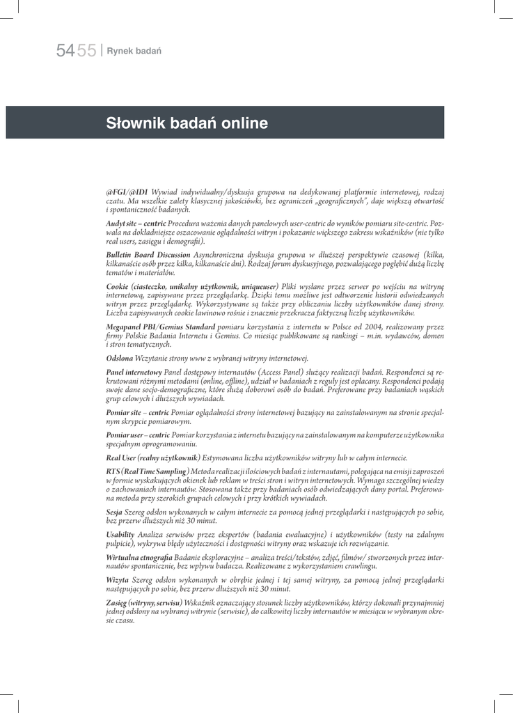 5455 Rynek badań Słownik badań online @FGI/@IDI Wywiad indywidualny/dyskusja grupowa na dedykowanej platformie internetowej, rodzaj czatu. Ma wszelkie zalety klasycznej jakościówki, bez ograniczeń „geograficznych”, daje większą otwartość i spontaniczność badanych. Audyt site – centric Procedura ważenia danych panelowych user-centric do wyników pomiaru site-centric. Pozwala na dokładniejsze oszacowanie oglądalności witryn i pokazanie większego zakresu wskaźników (nie tylko real users, zasięgu i demografii). Bulletin Board Discussion Asynchroniczna dyskusja grupowa w dłuższej perspektywie czasowej (kilka, kilkanaście osób przez kilka, kilkanaście dni). Rodzaj forum dyskusyjnego, pozwalającego pogłębić dużą liczbę tematów i materiałów. Cookie (ciasteczko, unikalny użytkownik, uniqueuser) Pliki wysłane przez serwer po wejściu na witrynę internetową, zapisywane przez przeglądarkę. Dzięki temu możliwe jest odtworzenie historii odwiedzanych witryn przez przeglądarkę. Wykorzystywane są także przy obliczaniu liczby użytkowników danej strony. Liczba zapisywanych cookie lawinowo rośnie i znacznie przekracza faktyczną liczbę użytkowników. Megapanel PBI/Gemius Standard pomiaru korzystania z internetu w Polsce od 2004, realizowany przez firmy Polskie Badania Internetu i Gemius. Co miesiąc publikowane są rankingi – m.in. wydawców, domen i stron tematycznych. Odsłona Wczytanie strony www z wybranej witryny internetowej. Panel internetowy Panel dostępowy internautów (Access Panel) służący realizacji badań. Respondenci są rekrutowani różnymi metodami (online, offline), udział w badaniach z reguły jest opłacany. Respondenci podają swoje dane socjo-demograficzne, które służą doborowi osób do badań. Preferowane przy badaniach wąskich grup celowych i dłuższych wywiadach. Pomiar site – centric Pomiar oglądalności strony internetowej bazujący na zainstalowanym na stronie specjalnym skrypcie pomiarowym. Pomiar user – centric Pomiar korzystania z internetu bazujący na zainstalowanym na komputerze użytkownika specjalnym oprogramowaniu. Real User (realny użytkownik) Estymowana liczba użytkowników witryny lub w całym internecie. RTS (Real Time Sampling) Metoda realizacji ilościowych badań z internautami, polegająca na emisji zaproszeń w formie wyskakujących okienek lub reklam w treści stron i witryn internetowych. Wymaga szczególnej wiedzy o zachowaniach internautów. Stosowana także przy badaniach osób odwiedzających dany portal. Preferowana metoda przy szerokich grupach celowych i przy krótkich wywiadach. Sesja Szereg odsłon wykonanych w całym internecie za pomocą jednej przeglądarki i następujących po sobie, bez przerw dłuższych niż 30 minut. Usability Analiza serwisów przez ekspertów (badania ewaluacyjne) i użytkowników (testy na zdalnym pulpicie), wykrywa błędy użyteczności i dostępności witryny oraz wskazuje ich rozwiązanie. Wirtualna etnografia Badanie eksploracyjne – analiza treści/tekstów, zdjęć, filmów/ stworzonych przez internautów spontanicznie, bez wpływu badacza. Realizowane z wykorzystaniem crawlingu. Wizyta Szereg odsłon wykonanych w obrębie jednej i tej samej witryny, za pomocą jednej przeglądarki następujących po sobie, bez przerw dłuższych niż 30 minut. Zasięg (witryny, serwisu) Wskaźnik oznaczający stosunek liczby użytkowników, którzy dokonali przynajmniej jednej odsłony na wybranej witrynie (serwisie), do całkowitej liczby internautów w miesiącu w wybranym okresie czasu.