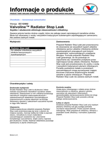 Informacje o produkcie PRODUKT FIRMY ASHLAND CONSUMER MARKETS, ODDZIAŁU HANDLOWEGO ASHLAND INC. Chemikalia — konserwacja samochodów Wersja: EC13/002 Valvoline™ Radiator Stop Leak Szybko i skutecznie eliminuje nieszczelności chłodnicy. Zawiera jedynie bardzo drobne cząstki, które nie zatkają nawet najmniejszych kanalików silnika. Może być stosowany z wodą i wszystkimi tradycyjnymi substancjami zapobiegającymi zamarzaniu. Nie zawiera żadnych metali. Wydajność Radiator Stop Leak Do układów chłodzenia wszystkich silników benzynowych i wysokoprężnych Zastosowania Preparat Radiator Stop Leak jest przeznaczony do stosowania we wszystkich typach układów chłodzenia oprócz układów chłodzenia silników wysokoprężnych pracujących pod dużymi obciążeniami, wykorzystujących urządzenia filtrujące. Formuła preparatu Radiator Stop Leak gwarantuje, że nie powoduje on zapychania się i swobodnie przepływa przez najmniejsze kanały układu chłodzenia. Radiator Stop Leak jest przystosowany do użytku z wodą i wszystkimi tradycyjnymi płynami chłodzącymi. Ponadto podzielone metale w produktach uszczelniających mogą wyczerpywać mające kluczowe znaczenie antykorozyjne dodatki zawarte w płynie chłodzącym. Preparat Radiator Stop Leak nie zawiera żadnych metali. Charakterystyka i zalety Doskonała wydajność Środek Radiator Stop Leak to skuteczna i łatwa metoda uszczelniania niewielkich wycieków układu chłodzenia. Zastosowano w nim unikalną kombinację naturalnych związków wielocząsteczkowych i zaawansowanych składników uszczelniających rozpuszczonych w płynie odpornym na korozję. Stosowany zgodnie z zaleceniami uszczelnia wycieki w ciągu kilku sekund. Ulepszenia Wielkocząsteczkowe składniki preparatu Radiator Stop Leak przemieszczają się wraz z płynem do miejsca wycieku, tworząc siatkę lub matę w poprzek otworu. Umożliwia to innym materiałom uszczelniającym osadzenie się i utworzenie kompletnego uszczelnienia, dzięki czemu naprawa jest skuteczna i trwała. Nadmiar składników pozostaje zawieszony w płynie chłodniczym. Strona 1 z 2 Kontrola osadów Utrata płynu chłodzącego z układu przez drobne nieszczelności w chłodnicy, głowicy cylindra, uszczelce lub zatyczkach rdzeniowych spowodowałaby zanieczyszczenie silnika lub drogi. Preparat Radiator Stop Leak pozwala uniknąć takiego zanieczyszczenia. Łatwy w użyciu Dodawać preparat Radiator Stop Leak przy każdym płukaniu chłodnicy lub gdy wystąpi potrzeba usunięcia nieszczelności. Przed użyciem dobrze wstrząsnąć. Wlać preparat do chłodnicy. Wkręcić z powrotem korek chłodnicy i normalnie użytkować pojazd. Informacje o produkcie PRODUKT FIRMY ASHLAND CONSUMER MARKETS, ODDZIAŁU HANDLOWEGO ASHLAND INC. Bezpieczeństwo Niniejszy produkt prawdopodobnie nie stwarza znaczącego zagrożenia dla zdrowia lub bezpieczeństwa, o ile jest używany prawidłowo w odpowiednim zastosowaniu. Kartę charakterystyki (MSDS) można uzyskać na życzenie od lokalnego dystrybutora lub pobrać ją z witryny pod adresem http://msds.ashland.com Ochrona środowiska Zużyte chemikalia należy oddawać do odpowiedniego punktu zbiórki. Nie spuszczać do ścieków, gleby lub cieków wodnych. Charakterystyczne właściwości Charakterystyka typowych właściwości jest oparta na aktualnie produkowanym preparacie. W przyszłości produkcja będzie zgodna ze specyfikacjami Valvoline, natomiast mogą wystąpić zmiany tej charakterystyki. Radiator Stop Leak Wygląd Kolor PH Ciężar właściwy w temperaturze 15°C. Przechowywanie People Who Know Use Valvoline™ Działając w ponad 100 krajach na całym świecie, firma Valvoline to wiodący sprzedawca, dystrybutor i producent wysokiej jakości produktów i usług samochodowych i przemysłowych. Do produktów tej firmy należą smary samochodowe, m. in. MaxLife™ — pierwszy olej silnikowy o formule przeznaczonej specjalnie do pojazdów o wyższym przebiegu; płyny przekładniowe, oleje przekładniowe, smary hydrauliczne, chemikalia motoryzacyjne, produkty specjalne; smary oraz produkty do układu chłodzenia. Aby uzyskać więcej informacji na temat produktów i usług firmy Valvoline, odwiedź www.valvolineeurope.com Autor: AdG Zastępuje – EC13/001 Brązowy płyn Bezbarwny 9-10 1.02 w suchym i chłodnym miejscu Niniejsze informacje dotyczą wyłącznie produktów wytwarzanych w następujących lokalizacjach: Europa *Znak towarowy będący własnością osoby trzeciej ™ Znak towarowy Ashland lub przedsiębiorstw zależnych, zarejestrowany w różnych krajach © 2012, Ashland Uważa się, że wszelkie informacje oraz dane przedstawione w niniejszym dokumencie są dokładne i wiarygodne, ale nie mogą być traktowane jako gwarancja, gwarancja wyraźna lub dorozumiana, gwarancja przydatności handlowej lub przydatności do określonego celu, lub reprezentacja, wyraźna lub dorozumiana, za którą Ashland Inc. i jej spółki zależne ponoszą odpowiedzialność prawną. Strona 2 z 2