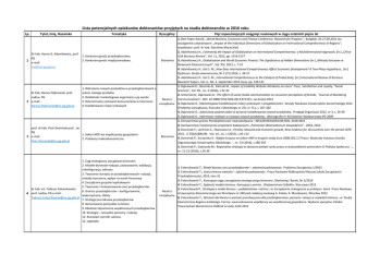 Lista potencjalnych opiekunów doktorantów przyjętych na studia doktoranckie w 2016 roku Lp. Tytuł, Imię, Nazwisko Dr hab. Hanna G. Adamkiewicz, prof. PG 1 e-mail: [email protected] dr hab. Dariusz Dąbrowski, prof. nadzw. PG 2 e-mail: [email protected] Tematyka 1. Konkurencyjność przedsiębiorstwa. 2. Konkurencyjność międzynarodowa. 1. Wdrażanie nowych produktów w przedsiębiorstwach a sukces nowego produktu 2. Działalność marketingowa organizacji a jej wyniki 3. Determinanty zachowań konsumentów w Internecie 4. Kształtowanie relacji rynkowych prof. dr hab. Piotr Dominiak prof. zw. PG 1. Sektor MSP we współczesnej gospodarce 3 e-mail: 2. Problemy makroekonomiczne [email protected] 1. Ciąg strategiczny zarządzania biznesem 2. Modele biznesów-rodzaje, zastosowanie, walidacja, rekonfiguracja, odnowa 3. Tworzenie wartości w przedsiębiorstwach- rodzaje, metody tworzenia, wpływ na wynik finansowy 4. Zarządzanie grupami kapitałowymi 5. Tworzenie i funkcjonowanie sieci przedsiębiorstw dr hab. inż. Tadeusz Falencikowski, 6. Granice przedsiębiorstw – konfigurowanie, 4 prof. nadzw. PG e-mail: wykorzystanie, efekty [email protected] 7. Strategiczna odnowa przedsiębiorstw 8. Generowanie pomysłów na biznes 9. Zdolności dynamiczne współczesnych przedsiębiorstw 10. Strategie – wszystkie poziomy i rodzaje 11. Kluczowe czynniki sukcesu 12. Logistyka Dyscypliny Ekonomia Nauki o zarządzaniu Ekonomia Nauki o zarządzaniu Pięć najważniejszych osiągnięć naukowych w ciągu ostatnich pięciu lat 1. Best Paper Award, „World Business, Economics and Finance Conference: Research for Progress ”, Bangkok, 26-27.09.2011 (za wystąpienie zatytułowane: „Impact of the Individual Dimensions of Globalization on International Competitiveness In Regions”; współautor: prof. dr hab. Stanisław Maciej Kot) 2. Adamkiewicz H., Estimating the Impact of Globalization on International Competitiveness: a Multidimensional Approach, [in:] „ChinaUSA Business Review”, Vol. 11, 2012, pp. 1514-1527 3. Adamkiewicz H., Globalization and World Economic Poverty: The Significance of Hidden Dimenstions [in:] „Metody Ilościowe w Badaniach Ekonomicznych”, Vol. XIV, 2013, s. 7-14 4. Adamkiewicz H., Kot S. M., How Does International Competitiveness Affect Economic Development? A Two-Phase Hypothesis, [in:] Optimum. Studia ekonomiczne, Nr 5 (71) 2014, s. 30-37 5. Adamkiewicz H., Kot S. M., International Competitiveness as the Catalyst of Productivity, [in:] International Review of Business Research Papers, Vol. 6., No. 2. September 2015 Issue, pp. 120-131 1. Dąbrowski D., Basińska B., Sikorski M., Impact of Usability Website Attributes on Users’ Trust, Satisfaction and Loyalty, "Social Sciences", Vol. 85., iss. 3 (2014), s.22-32 2. Schivinski B., Dąbrowski D., The effect of social media communication on consumer perceptions of brands, "Journal of Marketing Communications", DOI: 10.1080/13527266.2013.871323., (w druku) 2014 3. Dąbrowski D., Marketingowe kształtowanie relacji rynkowych z usługobiorcami, Zeszyty Naukowe Uniwersytetu Szczecińskiego 2012 (Problemy Zarządzania, finansów i Marketingu nr 25), nr 711, s. 367-382 4. Dąbrowski D., Jakościowy podział zadań w procesie kształtowania nowych produktów, Przegląd Organizacji 2012, nr 3, s. 36-40 5. Dąbrowski D., Informacje rynkowe w rozwoju nowych produktów, (Monografie nr 93) Gdańsk: Wydawnictwo PG 2009 1. Kierownictwo grantu Przedsiębiorczość nieproduktywna . 3051/B/H03/2010/38 NCN. 2010-2015 2. Kierownictwo merytoryczne projektami badawczymi „Pomorskie Obserwatorium Gospodarcze” , 2010, 2012 3. Dominiak P., Lechman E., Okonowicz A.: Fertility rebound and economic growth. New evidence for 18 countries over the period 19702011. // EQUILIBRIUM. -Vol. 10., iss. 1 (2015), s.91-112 4. Dominiak P., Kurzyńska A.: Wpływ kryzysu na sektor MSP w krajach strefy Euro 2008-2011 // Prace i Materiały Instytutu Handlu Zagranicznego Uniwersytetu Gdańskiego. -., nr. 33 (2014), s.180-195 5. Dominiak P., Gawrycka M.: Regionalna strategia w obszarze polityki rynku pracy w województwie pomorskim // Polityka Społeczna. -., nr. 11-12 (2014), s.34-38 1. Falencikowski T., Model biznesu sieci przedsiębiorstw – założenia podstawowe, Problemy Zarządzania 1/2015 2. Falencikowski T., Istota chmury wartości – założenia podstawowe . Prace Naukowe Wałbrzyskiej Wyższej Szkoły Zarządzania i Przedsiębiorczości, 2015, tom 32 3. Falencikowski T., Koncepcja ciągu zarządzania strategicznego biznesem , Marketing i Rynek, Nr 5/2014 4. Falencikowski T., Spójność modelu biznesu. Koncepcja i pomiar, Wydawnictwo CeDeWu, Warszawa 2013 5. FalencikowskiT., Strategia a model biznesu – podobieństwa i różnice ; w: Zarządzanie strategiczne w praktyce i teorii. Prace Naukowe Uniwersytetu Ekonomicznego we Wrocławiu nr 260 pod redakcją naukową A. Kaleta, K. Moszkowicz, Wrocław 2012 6. Falencikowski T., Wartość dla klienta a wartość przechwycona dla przedsiębiorstwa: postacie i relacje w modelach biznesu ; w: Studia Ekonomiczne Regionu Łódzkiego. Formy i uwarunkowania współpracy we współczesnej gospodarce. Wydanie specjalne. Polskie Towarzystwo Ekonomiczne Oddział w Łodzi, Łódź 2012 dr hab. Małgorzata Gawrycka e-mail: 5 [email protected] 1. Udział pracy i kapitału w dochodzie narodowym 2. Relacje kapitał i praca 3. Sytuacja ludzi młodych i kobiet na rynku pracy 4. Zmiany demograficzne i ich wpływ na rynek pracy 5. Koncepcja flexicurity na przykładzie rynków pracy krajów UE 1. Zarządzanie jakością, normatywne systemy dr hab. inż. Piotr Grudowski, prof. zarządzania 6 nadzw. PG 2. Koncepcje doskonalenia – lean, six sigma, modele e-mail: [email protected] doskonałości – EFQM, CAF,… 1. Kryzys finansowy 2. Kursy walutowe 3. Ocena sytuacji ekonomiczno-finansowej dr hab. inż. Tomasz Korol przedsiębiorstw (prognozowanie) 7 e-mail: [email protected] 4. Zachowania konsumentów w krajach Azji Poł