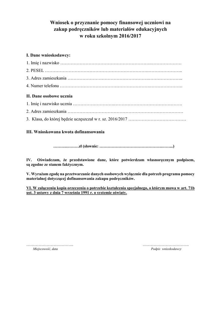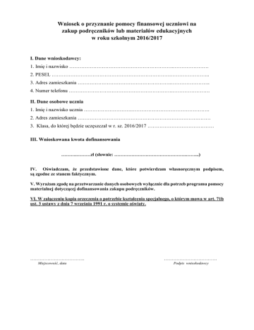 Wniosek o przyznanie pomocy finansowej uczniowi na zakup podręczników lub materiałów edukacyjnych w roku szkolnym 2016/2017 I. Dane wnioskodawcy: 1. Imię i nazwisko …………………………………………………….………………… 2. PESEL …………………………………………………………….………………….. 3. Adres zamieszkania ……………………………………………….………………….. 4. Numer telefonu …………………………………………………….…………………. II. Dane osobowe ucznia 1. Imię i nazwisko ucznia ……………………….………………………………………. 2. Adres zamieszkania …………………………………………………………………… 3. Klasa, do której będzie uczęszczał w r. sz. 2016/2017 ………………………………… III. Wnioskowana kwota dofinansowania ……….………zł (słownie: ……………………………………….……...) IV. Oświadczam, że przedstawione dane, które potwierdzam własnoręcznym podpisem, są zgodne ze stanem faktycznym. V. Wyrażam zgodę na przetwarzanie danych osobowych wyłącznie dla potrzeb programu pomocy materialnej dotyczącej dofinansowania zakupu podręczników. VI. W załączeniu kopia orzeczenia o potrzebie kształcenia specjalnego, o którym mowa w art. 71b ust. 3 ustawy z dnia 7 września 1991 r. o systemie oświaty. …………………………….. Miejscowość, data ……………………………. Podpis wnioskodawcy
