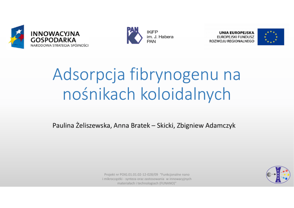 IKiFP im. J. Habera PAN Adsorpcja fibrynogenu na nośnikach koloidalnych Paulina Żeliszewska, Anna Bratek – Skicki, Zbigniew Adamczyk Projekt nr POIG.01.01.02‐12‐028/09 “Funkcjonalne nano i mikrocząstki ‐ synteza oraz zastosowania w innowacyjnych materiałach i technologiach (FUNANO)” F U N A N O Znaczenie fibrynogenu Fibrin polymerization Projekt nr POIG.01.01.02‐12‐028/09 “Funkcjonalne nano i mikrocząstki ‐ synteza oraz zastosowania w innowacyjnych materiałach i technologiach (FUNANO)” Cel pracy Określenie mechanizmu adsorpcji fibrynogenu na cząstkach koloidalnych Projekt nr POIG.01.01.02‐12‐028/09 “Funkcjonalne nano i mikrocząstki ‐ synteza oraz zastosowania w innowacyjnych materiałach i technologiach (FUNANO)” Modele cząsteczki fibrynogenu Projekt nr POIG.01.01.02‐12‐028/09 “Funkcjonalne nano i mikrocząstki ‐ synteza oraz zastosowania w innowacyjnych materiałach i technologiach (FUNANO)” Metody eksperymentalne Spekrofotometr UV‐VIS Charakterystyka w roztworze: Zetasizer Nano ZS from Malvern: o ruchliwość elektroforetyczna o współczynnik dyfuzji Charakterystyka na powierzchni: Mikroskop sił atomowych Monowarstwa fibrynogenu Cząstki lateksu Projekt nr POIG.01.01.02‐12‐028/09 “Funkcjonalne nano i mikrocząstki ‐ synteza oraz zastosowania w innowacyjnych materiałach i technologiach (FUNANO)” Gęstościomierz Charakterystyka fibrynogenu w roztworze 1 2 i.e.p. = 5.8 3 1‐ 10‐3M 2‐ 10‐2M 3‐ 0.15M Projekt nr POIG.01.01.02‐12‐028/09 “Funkcjonalne nano i mikrocząstki ‐ synteza oraz zastosowania w innowacyjnych materiałach i technologiach (FUNANO)” Charakterystyka cząstek lateksu L800 polistyrenowego Zależność potencjału zeta od pH Zależność średnicy hydrodynamicznej od siły jonowej I = 10‐3M Projekt nr POIG.01.01.02‐12‐028/09 “Funkcjonalne nano i mikrocząstki ‐ synteza oraz zastosowania w innowacyjnych materiałach i technologiach (FUNANO)” I = 10‐2M I = 0.15M Schemat metodyki badawczej Projekt nr POIG.01.01.02‐12‐028/09 “Funkcjonalne nano i mikrocząstki ‐ synteza oraz zastosowania w innowacyjnych materiałach i technologiach (FUNANO)” Adsorpcja fibrynogenu na lateksie (I=0.15M) ‐ pomiary elektrokinetyczne pH=3.5 pH=7.4 model elektrokinetyczny 3D Projekt nr POIG.01.01.02‐12‐028/09 “Funkcjonalne nano i mikrocząstki ‐ synteza oraz zastosowania w innowacyjnych materiałach i technologiach (FUNANO)” Wyznaczenie maksymalnego pokrycia fibrynogenu na lateksie (0.15M NaCl) – metoda AFM pH=3.5 pH=7.4 model RSA model RSA Projekt nr POIG.01.01.02‐12‐028/09 “Funkcjonalne nano i mikrocząstki ‐ synteza oraz zastosowania w innowacyjnych materiałach i technologiach (FUNANO)” Adsorpcja fibrynogenu na lateksie kationowym (A800) (pH=7.4) Charakterystyka dodatniego lateksu I=0.15M NaCl, pH=7.4 model 3D 1‐ 10‐2M 2‐ 10‐3M 3‐ 0.15M Projekt nr POIG.01.01.02‐12‐028/09 “Funkcjonalne nano i mikrocząstki ‐ synteza oraz zastosowania w innowacyjnych materiałach i technologiach (FUNANO)” Wyznaczenie maksymalnego pokrycia fibrynogenu na lateksie kationowym (A800) (pH=7.4) 10‐3M, Γ=0.6 mg/m2 I=0.15M NaCl 10‐2M, Γ=1.1 mg/m2 0.15M, Γ=1.3 mg/m2 model RSA Projekt nr POIG.01.01.02‐12‐028/09 “Funkcjonalne nano i mikrocząstki ‐ synteza oraz zastosowania w innowacyjnych materiałach i technologiach (FUNANO)” Zależność maksymalnego pokrycia fibrynogenu na lateksie anionowym (L800) od siły jonowej (pH=3.5) 3D RSA model Fibrinogen monolayer (simulations) I = 10‐3M I = 0.15M Projekt nr POIG.01.01.02‐12‐028/09 “Funkcjonalne nano i mikrocząstki ‐ synteza oraz zastosowania w innowacyjnych materiałach i technologiach (FUNANO)” 60nm Maksymalne pokrycia fibrynogenu na lateksie L800 i A800 pH 3.5 7.4 7.4 Siła jonowa Maksymalne pokrycie [mg m‐2] AFM Teoria RSA [M] Lateks anionowy L800 10‐3 1.8+/‐0.2 1.8 10‐2 2.5+/‐0.2 2.8 0.15 3.6+/‐0.2 3.7 1.9+/‐0.2 2.0 10‐3 2.7+/‐0.2 2.8 10‐2 0.15 3.2+/‐0.2 3.0 Lateks kationowy A800 10‐3 0.6+/‐0.1 0.65 10‐2 1.2+/‐0.1 1.12 0.15 1.3+/‐0.1 1.29 Projekt nr POIG.01.01.02‐12‐028/09 “Funkcjonalne nano i mikrocząstki ‐ synteza oraz zastosowania w innowacyjnych materiałach i technologiach (FUNANO)” Stabilność monowarstw fibrynogenu na cząstkach lateksowych I = 0.15M, pH=3.5 adsorption Adsorpcja pH=7.4 pH reversal pH=3.5 1‐ 0.15M NaCl, Γ = 3.2 [mg m‐2] 2‐ 10‐2M NaCl, Γ = 2.7 [mg m‐2] 3‐ 10‐3M NACl, Γ = 1.9 [mg m‐2] 1‐ bulk fibrinogen 2‐ Γ=3.5 mg/m2 3‐ Γ=2mg/m2 Projekt nr POIG.01.01.02‐12‐028/09 “Funkcjonalne nano i mikrocząstki ‐ synteza oraz zastosowania w innowacyjnych materiałach i technologiach (FUNANO)” Wnioski • Określono mechanizmy adsorpcji fibrynogenu na powierzchniach cząstek lateksowych przy pomocy metod elektrokinetycznych, AFM i DLS. • Wyniki eksperymentalne potwierdzają decydującą rolę oddziaływań elektrostatycznych na mechanizmy adsorpcji zgodne z modelem RSA oraz modelem elektrokinetycznym. • Na podstawie przeprowadzonych badań można opracować procedurę tworzenia monowarstw fibrynogenu o określonej orientacji i pokryciu. Projekt nr POIG.01.01.02‐12‐028/09 “Funkcjonalne nano i mikrocząstki ‐ synteza oraz zastosowania w innowacyjnych materiałach i technologiach (FUNANO)” Dziękuję za uwagę Projekt nr POIG.01.01.02‐12‐028/09 “Funkcjonalne nano i mikrocząstki ‐ synteza oraz zastosowania w innowacyjnych materiałach i technologiach (FUNANO)”