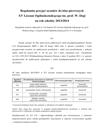 Regulamin przyjęć uczniów do klas pierwszych XV