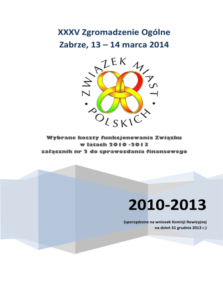 XXXV Zgromadzenie Ogólne Zabrze, 13 – 14 marca 2014 Apo Wybrane koszty funkcjonowania Związku w latach 2010 -2013 załącznik nr 2 do sprawozdania finansowego 2010-2013 (sporządzone na wniosek Komisji Rewizyjnej na dzień 31 grudnia 2013 r.) 1.1. ZGROMADZENIA OGÓLNE ZWIĄZKU MIAST POLSKICH W latach 2010 - 2013 odbyły się 4 Zgromadzenia Ogólne: • XXXI ZO w Poznaniu - 8 marca 2010 (XX-lecie ST) (155 delegatów, frekwencja 51%) • XXXII ZO w Poznaniu - 3 i 4 marca 2011 (sprawozdawczo-wyborcze) (193 delegatów, frekwencja 64%) • XXXIII ZO w Karpaczu - 8-9 marca 2012 (170 Delegatów; frekwencja 57,8%) • XXXIV ZO w Kołobrzegu - 28 lutego/1 marca 2013 r. (168 Delegatów; frekwencja 55,4%) Zgromadzenia Ogólne ZMP - frekwencja 70% 60% 50% 40% 30% 20% 10% 0% 2010 2011 2012 2013 XXXII Zgromadzenie Ogólne (sprawozdawczo-wyborcze) wybrało władze Związku na nową kadencję, zwiększając najpierw w Statucie liczbę członków Zarządu do 25 osób. Zgodnie z ukształtowaną w połowie lat 90. tradycją, dla zapewnienia apolityczności władz, dokonano podziału miejsc w Zarządzie i Komisji Rewizyjnej proporcjonalnie do przynależności delegatów (największą grupą polityczną w ZO są delega ci niezależni, którzy mają bezwzględną większość w składzie ZO). Prezesem Związku został ponownie Ryszard GROBELNY, prezydent Poznania. Członkami Zarządu zostali wybrani: • Jacek MAJCHROWSKI, prezydent Krakowa, wiceprezes, • Marek MIROS, burmistrz Gołdapi, wiceprezes, • Krzysztof ŻUK, prezydent Lublina, wiceprezes, • Andrzej KOSZTOWNIAK, prezydent Radomia, sekretarz, • Andrzej PIETRASIK, burmistrz Płońska, skarbnik, • Bogdan BIENIEK, zastępca prezydenta Mielca, • Ryszard BREJZA, prezydent Inowrocławia, • Jan BRONŚ, burmistrz Oleśnicy, • Andrzej CZAPSKI, prezydent Białej Podlaskiej, • Andrzej DZIUBA, prezydent Tychów, • Arkadiusz GODLEWSKI, przewodniczący RM Katowic (do 24 kwietnia 2013 r.) • Janusz GROMEK, prezydent Kołobrzegu, • Piotr JEDUŃSKI, prezydent Koszalina, • Tomasz KACPRZAK, przewodniczący RM Łodzi (do 23 października 2013 r.) • Jacek UPIŃSKI, burmistrz Aleksandrowa Łódzkiego, • Stanisław MAŁACHWIEJ, burmistrz Sokółki, • Zbigniew PODRAZA, prezydent Dąbrowy Górniczej, • Stanisław SZWABSKI, przewodniczący RM Gdyni, • Anna TOMICKA, burmistrz Swarzędza, 1 • Zofia TRĘBICKA, radna Miasta Stołecznego Warszawy, • Leszek TRĘBSKI, prezydent Skierniewic, • Jarosław WILCZYŃSKI, prezydent Ostrowca Świętokrzyskiego, • Janusz ŻMURKIEWICZ, prezydent Świnoujścia. Członkami Komisji Rewizyjnej zostali wybrani: • Tadeusz KRZAKOWSKI, prezydent Legnicy, • Julian JOKŚ, burmistrz Krotoszyna, • Wojciech KUDELSKI, prezydent Siedlec, • Mirosława LEHMAN, burmistrz Kartuz, • Jacek WALCZAK, prezydent Sieradza. W wyborach uzupełniających do Zarządu Delegaci XXXIII ZO w Karpaczu wybrali Iwonę WIECZOREK prezydent Zgierza. Zgromadzenia Ogólne, po zapoznaniu się z opinią Komisji Rewizyjnej, przyjmują sprawozdania prezesa Związku z działalności Zarządu Związku, sprawozdania finansowe z wykonania budżetu Związku oraz bilans Związku. Ponadto przyjmują założenia programu działania Związku oraz budżet Związku na bieżący rok. Debata merytoryczna skupia się głównie na problematyce finansowej oraz bieżących problemach dotyczących funkcjonowania JST. W jej wyniku przyjmowane są stanowiska i uchwały. W VI kadencji do priorytetów programowych zaliczono: finanse miast, rewitalizację, rozwój przestrzenny miast, zarządza-nie drogami (ulicami) w miastach, transport publiczny, politykę mieszkaniową, a także uznano, że Polska powinna przyjąć i prowadzić politykę miejską. 1.1.1. Koszty posiedzeń Zgromadzeń Ogólnych W latach 2010 -2013 koszty posiedzeń Zgromadzeń Ogólnych wynosiły ogółem 364 147 zł. i w poszczególnych latach kształtowały się następująco: Rok 2010 2011 2012 2013 koszt ZO brutto [PLN] 11356 153 727 110 062 89 002 Koszty posiedzeń Zgromadzeń Ogólnych [PLN] 200000 160000 120000 80000 40000 0 2010 2011 2012 2013 Koszty Zgromadzenia Ogólnego w 2010 roku były najniższe, gdyż odbyło się ono w Poznaniu, w ramach obchodów XX-lecia samorządu terytorialnego, przy innych zasadach finansowania. Najwyższe były koszty Zgromadzenia Ogólnego w 2011 roku (najwyższa frekwencja, obchody XX-lecia Związku Miast Polskich). W następnych latach widać wyraźny spadek kosztów w tej pozycji budżetowej. 2 1.1.2. Struktura członkowska Związku wg liczby mieszkańców i wysokości składki W latach 2010 - 2013 struktura członków Związku wg liczby mieszkańców przedstawiała się następująco: Liczba miast 2010 2011 2012 2013 Ogółem 308 305 303 303 do 50 tys. mieszk. 231 229 229 228 pow. 50 tys. - do 100 tys. 41 40 37 38 pow. 100 tys. 36 36 37 37 Wysokość składki członkowskiej, wnoszonej przez miasta wg liczby mieszkańców, przedstawia poniższa tabela i wykres (wykonanie przekracza co roku 99 %): Wysokość składki 2010 Ogółem 2011 2012 2013 3 326 723 3 602 220 3 678 615 3 785 995 miast do 50 tys. mieszk. 967 130 1 128 897 1 146 786 1 183 205 miast od 50 tys. do 100 tys. 598 746 685 744 656 826 687 313 1 760 847 1 787 579 1 875 003 1 915 476 miast pow. 100 tys. 4 000 000 3 200 000 2 400 000 miasta pow. 100 tys. miasta od 50 tys. do 100 tys. 1 600 000 miasta do 50 tys. mieszk. 800 000 0 2010 2011 2012 2013 3 1.2. ZARZĄD ZWIĄZKU Zarząd poprzedniej kadencji odbył w 2010 r. 7 posiedzeń: • 19 lutego w Jaśle • 23 kwietnia w Mielcu • 14 maja w Sochaczewie • 17 czerwca w Sopocie • 27 sierpnia w Ustce • 22 października w Gdyni • 10 grudnia w Ostrowcu Świętokrzyskim Ponadto Zarząd zebrał się podczas obrad ZO w Poznaniu (8 marca) i Kongresu Miast w Kaliszu (16 września). Nowy Zarząd spotkał się w roku 2011 na 10 posiedzeniach: • 4 marca w Poznaniu, • 15 kwietnia w Wieliczce, • 17 maja w Katowicach, • 10 czerwca w Nys