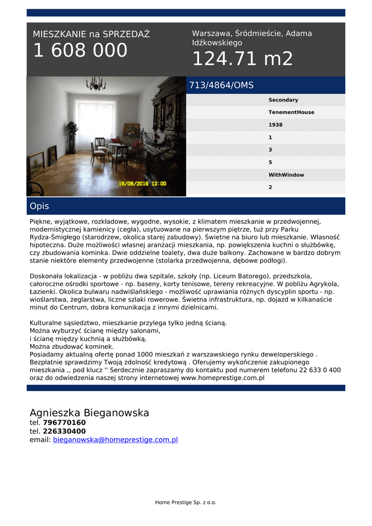 Warszawa, Śródmieście, Adama Idźkowskiego MIESZKANIE na SPRZEDAŻ 1 608 000 124.71 m2 713/4864/OMS Secondary TenementHouse 1938 1 3 5 WithWindow 2 Opis Piękne, wyjątkowe, rozkładowe, wygodne, wysokie, z klimatem mieszkanie w przedwojennej, modernistycznej kamienicy (cegła), usytuowane na pierwszym piętrze, tuż przy Parku Rydza-Śmigłego (starodrzew, okolica starej zabudowy). Świetne na biuro lub mieszkanie. Własność hipoteczna. Duże możliwości własnej aranżacji mieszkania, np. powiększenia kuchni o służbówkę, czy zbudowania kominka. Dwie oddzielne toalety, dwa duże balkony. Zachowane w bardzo dobrym stanie niektóre elementy przedwojenne (stolarka przedwojenna, dębowe podłogi). Doskonała lokalizacja - w pobliżu dwa szpitale, szkoły (np. Liceum Batorego), przedszkola, całoroczne ośrodki sportowe - np. baseny, korty tenisowe, tereny rekreacyjne. W pobliżu Agrykola, Łazienki. Okolica bulwaru nadwiślańskiego - możliwość uprawiania różnych dyscyplin sportu - np. wioślarstwa, żeglarstwa, liczne szlaki rowerowe. Świetna infrastruktura, np. dojazd w kilkanaście minut do Centrum, dobra komunikacja z innymi dzielnicami. Kulturalne sąsiedztwo, mieszkanie przylega tylko jedną ścianą. Można wyburzyć ścianę między salonami, i ścianę między kuchnią a służbówką. Można zbudować kominek. Posiadamy aktualną ofertę ponad 1000 mieszkań z warszawskiego rynku deweloperskiego . Bezpłatnie sprawdzimy Twoją zdolność kredytową . Oferujemy wykończenie zakupionego mieszkania ,, pod klucz '' Serdecznie zapraszamy do kontaktu pod numerem telefonu 22 633 0 400 oraz do odwiedzenia naszej strony internetowej www.homeprestige.com.pl Agnieszka Bieganowska tel. 796770160 tel. 226330400 email: [email protected] Home Prestige Sp. z o.o. Powered by TCPDF (www.tcpdf.org)