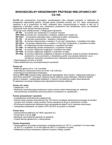 WODOSZCZELNY KIESZONKOWY PRZYRZĄD WIELOFUNKCYJNY CX-105 CX-105 jest uniwersalnym przyrządem umożliwiającym kilka rodzajów pomiarów w zależności od podłączenia odpowiedniej głowicy. Komplet głowic umożliwia pomiary: pH, mV, redox, przewodności, zasolenia w g/l w przeliczeniu na NaCl, zawartości tlenu rozpuszczonego w wodzie w mg/l lub %, wilgotności z odczytem punktu rosy, temperatury powierzchni oraz temperatury cieczy lub powietrza. Użytkownik może wybrać potrzebne głowice. • Przyrząd może współpracować z następującymi głowicami: GP-105 - do pomiaru pH i temperatury w czystych cieczach GPX-105s do pomiaru pH i temperatury w ściekach, półpłynnych masach itp. GR-105 k - do pomiarów potencjału redox z elektrodą na kablu i temperatury. GC-105 - -do pomiaru przewodności, zasolenia i temperatury. GO-105 - do pomiaru stężenia tlenu w wodzie w % lub mg/l i temperatury, z czujnikiem bez kabla. GO-105 k - do pomiaru stężenia tlenu w wodzie w % lub mg/l i temperatury, z czujnikiem na kablu GT-105 - do dokładnego pomiaru temperatury z czujnikiem bez kabla GT-105k - do dokładnego pomiaru temperatury z czujnikiem na kablu. GH-105 - do pomiaru wilgotności względnej z czujnikiem bez kabla. GH-105k - do pomiaru wilgotności względne z czujnikiem na kablu. GH-105p - do pomiaru wilgotności względnej ze złączem na dotykowy czujnik do pomiaru temperatury powierzchni, co po porównaniu z temperaturą punktu rosy pozwala stwierdzić, czy w określonych warunkach atmosferycznych malowanie powierzchni jest celowe. • Wykorzystywany do prac w terenie. • Dobra dokładność przy zminimalizowanych wymiarach. Pomiar pH • Kalibracja głowicy pH w 1 do 3 punktów. • Automatyczne wykrywanie buforu pH (4,00, 7,00, 9,00 pH). • Automatyczna kompensacja temperatury . Głowica GPX-105s posiada trwałą, elektrodę pH australijskiej firmy Ionode o nietypowej konstrukcji z „łącznikiem pośrednim” chroniącym właściwy łącznik elektrody przed zatkaniem. Zapewnia stabilny pomiar w ściekach i substancjach półstałych, w których inne elektrody szybko tracą sprawność. W zależności od potrzeb dobierana jest odpowiednia końcówka elektrody. Pomiar mV, redox • Dokładność 1 mV. • Możliwość automatycznego przeliczenia wyniku pomiaru redox odniesionego do elektrody chlorosrebrowej na elektrodę wodorową (ważne w pomiarach na pływalniach). Pomiar przewodności i zasolenia • 5 podzakresów automatycznie przełączanych. • Szeroki zakres pomiaru przewodności (do 100 mS/cm) umożliwia zastosowanie przyrządu do pomiaru czystych wód, ścieków i wody morskiej. Pomiar zasolenia do 60 g/l w przeliczeniu na NaCl. • W pomiarze przewodności kalibracja przez wprowadzenie stałej K lub w roztworze wzorcowym. • Temperatura odniesienia do wyboru: 25ºC lub 20ºC do pomiaru w miodach. Pomiar tlenu • Jednopunktowa kalibracja (na 100% nasycenia O2). • Pomiar tlenu w % lub mg/l. • Możliwość wprowadzenia poprawki na zasolenie. • Czujnik tlenowy galwaniczny o dobrej jakości. Pomiar temperatury • Osobna głowica do pomiaru temperatury umożliwia pomiary do 150 ºC z czujnikiem 3 cm bez kabla, do 200 ºC z czujnikiem 12 cm bez kabla lub 400 ºC z czujnikiem na kablu. • Dokładność pomiaru temperatury zależna od wyboru rodzaju czujnika. Inne • W pełni wodoszczelny przyrząd, utrzymujący się na powierzchni wody. • Zasilanie bateryjnie (3 x LR44). • Długotrwała praca bez wymiany baterii. • Automatyczne wyłączanie uniemożliwia przypadkowe rozładowanie baterii. • Gwarancja na przyrząd 24 miesiące. Dane techniczne Pomiar pH mV Zakresy 0.00 ¸14.00 pH ±1200 mV O2 199.9% 19.99 mg/l Przewodność 0 ¸ 100 mS/cm 0 ÷ 60 g/l NaCl Wilgotność* Temperatura** 0 ÷100 RH -70 ÷ 400 ºC 10 ÷90%: ±3% RH ±0.8 ºC, ±0,3 ºC*** Dokładność ±3 % poza tym ±1 cyfra zakresem: ±4% RH Zakres temperatury -5 ÷ 60 / 90 ºC 0 ÷ 40 ºC 0 ÷ 50 ºC -40 ÷ 70 ºC — Kompensacja temp. -5 ¸ 60 / 90 ºC** — 0 ÷ 40 ºC — 0 ¸ 50 ºC Impedancja wejśc. — — — 1012 W — — — 2 %/ºC — Współczynnik a Wymiary / Masa L =160mm, = 26mm, z głowicą GP-105s: L= 235 mm = 26mm /ok. 70 g zależnie od rodzaju głowicy * Pozostałe dane w opisie PWT-105 ** dane dla głowicy GT-105k pozostałe dane w opisie PT-105 *** 0,8 ºC z rezystorem Pt-1000B w zakresie 0 ÷ 100 ºC , 0,3 ºC z rezystorem Pt-1000S w zakresie 0 ÷ 100 ºC. ±0.02 pH ±1 cyfra ±1 mV ±1 cyfra do 50 mS/cm ±1%, >50 mS/cm ±5% Przyrząd CX-105 z głowicami GH-105p GO-105 GC-105 GH-105 GT-105 GP-105 GPX-105s 41-814 ZABRZE ul. W. Witosa 10 tel. 32 273 81 06, fax 32 273 81 14 [email protected] www.elmetron.pl