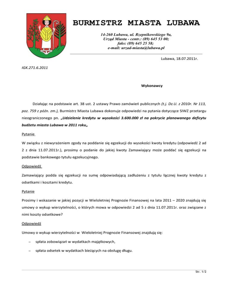 BURMISTRZ MIASTA LUBAWA 14-260 Lubawa, ul. Rzepnikowskiego 9a, Urząd Miasta - centr.: (89) 645 53 00; faks: (89) 645 25 58; e-mail: [email protected] Lubawa, 18.07.2011r. IGK.271.6.2011 Wykonawcy Działając na podstawie art. 38 ust. 2 ustawy Prawo zamówień publicznych (t.j. Dz.U. z 2010r. Nr 113, poz. 759 z późn. zm.), Burmistrz Miasta Lubawa dokonuje odpowiedzi na pytania dotyczące SIWZ przetargu nieograniczonego pn. „Udzielenie kredytu w wysokości 3.600.000 zł na pokrycie planowanego deficytu budżetu miasta Lubawa w 2011 roku„ Pytanie W związku z niewyrażeniem zgody na poddanie się egzekucji do wysokości kwoty kredytu (odpowiedź 2 ad 2 z dnia 11.07.2011r.), prosimy o podanie do jakiej kwoty Zamawiający może poddać się egzekucji na podstawie bankowego tytułu egzekucyjnego. Odpowiedź Zamawiający podda się egzekucji na sumę odpowiadającą zadłużeniu z tytułu łącznej kwoty kredytu z odsetkami i kosztami kredytu. Pytanie Prosimy i wskazanie w jakiej pozycji w Wieloletniej Prognozie Finansowej na lata 2011 – 2020 znajdują się umowy o wykup wierzytelności, o których mowa w odpowiedzi 2 ad 5 z dnia 11.07.2011r. oraz związane z nimi koszty odsetkowe? Odpowiedź Umowy o wykup wierzytelności w Wieloletniej Prognozie Finansowej znajdują się: – spłata zobowiązań w wydatkach majątkowych, – spłata odsetek w wydatkach bieżących na obsługę długu. Str. 1/2 Pytanie Prosimy o podanie nr uchwał zmieniającej WPF oraz budżet na 2011r. z dnia 25 mają, gdyż pliki umieszczone na stronie BIP ich nie zawierają. Odpowiedź – Uchwała Nr VII/83/2011 Rady Miasta Lubawa z dnia 25 maja 2011r. w sprawie zmiany Wieloletniej Prognozy Finansowej Miasta Lubawa na lata 2011-2020, – Uchwała Nr VII/84/2011 Rady Miasta Lubawa z dnia 25 maja 2011r. w sprawie zmian w sprawie zmian w budżecie miasta na 2011 rok. Pytanie Prosimy o ponowne umieszczenie sprawozdania opisowego z wykonania budżetu 2009r. gdyż pliki umieszczone na stronie BIP ich nie zawierają. Odpowiedź Pliki zamieszczone w BIP Urzędu Miasta zawierają sprawozdanie opisowe z wykonania budżetu 2009r. zakładka „Ważniejsze akty prawne regulujące pracę samorządu”, „Sprawozdania z wykonania z Budżetu Miasta” (http://lubawa.bip-wm.pl/public/?id=56846). Należy otworzyć archiwum RAR np. Programem WIN RAR dostępnym na stronie producenta – http://www.winrar.pl/. Pytanie Prosimy o dostarczenie Uchwały w sprawie uchwalenie WPF wraz z załącznikami. Odpowiedź W załączeniu Uchwał w sprawie uchwalenie Wieloletniej Prognozy Finansowej. Pytanie Ponownie prosimy i dostarczenie Rb-NDS za I kwartał 2010r., gdyż nie został podłączony do załączników umieszczonych w dniu 11.07.2011r. Odpowiedź Sprawozdanie Rb-NDS za I kwartał 2010r. zostało zamieszczone w odpowiedzi z dnia 11.07.2011r. papierowo oraz elektronicznie - załącznik nr 4, strona 32 (ostatnia). Dodatkowo sprawozdanie Rb-NDS za I kwartał 2010r. w załączeniu do niniejszego pisma. Otrzymują: 1. Wykonawcy 2. a/a (S.J.) Str. 2/2