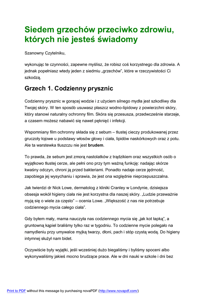 Siedem grzechów przeciwko zdrowiu, których nie jesteś świadomy Szanowny Czytelniku, wykonując te czynności, zapewne myślisz, że robisz coś korzystnego dla zdrowia. A jednak popełniasz wtedy jeden z siedmiu „grzechów”, które w rzeczywistości Ci szkodzą. Grzech 1. Codzienny prysznic Codzienny prysznic w gorącej wodzie i z użyciem silnego mydła jest szkodliwy dla Twojej skóry. W ten sposób usuwasz płaszcz wodno-lipidowy z powierzchni skóry, który stanowi naturalny ochronny film. Skóra się przesusza, przedwcześnie starzeje, a czasem możesz nabawić się nawet pęknięć i infekcji. Wspomniany film ochronny składa się z sebum – tłustej cieczy produkowanej przez gruczoły łojowe u podstawy włosów głowy i ciała, lipidów naskórkowych oraz z potu. Ale ta warstewka tłuszczu nie jest brudem. To prawda, że sebum jest zmorą nastolatków z trądzikiem oraz wszystkich osób o wyjątkowo tłustej cerze, ale pełni ono przy tym ważną funkcję: nadając skórze kwaśny odczyn, chroni ją przed bakteriami. Ponadto nadaje cerze jędrność, zapobiega jej wysychaniu i sprawia, że jest ona względnie nieprzepuszczalna. Jak twierdzi dr Nick Lowe, dermatolog z kliniki Cranley w Londynie, dzisiejsza obsesja wokół higieny ciała nie jest korzystna dla naszej skóry. „Ludzie przeważnie myją się o wiele za często” – ocenia Lowe. „Większość z nas nie potrzebuje codziennego mycia całego ciała”. Gdy byłem mały, mama nauczyła nas codziennego mycia się „jak kot łapką”, a gruntowną kąpiel braliśmy tylko raz w tygodniu. To codzienne mycie polegało na namydleniu przy umywalce myjką twarzy, dłoni, pach i stóp czystą wodą. Do higieny intymnej służył nam bidet. Oczywiście były wyjątki, jeśli wcześniej dużo biegaliśmy i byliśmy spoceni albo wykonywaliśmy jakieś mocno brudzące prace. Ale w dni nauki w szkole i dni bez Print to PDF without this message by purchasing novaPDF (http://www.novapdf.com/) większego wysiłku fizycznego oszczędzaliśmy ciepłą wodę, a przy tym… naszą skórę. Jeśli masz tendencję do suchej skóry, obniż temperaturę wody pod prysznicem i używaj żelu bez dodatku mydła. Zauważ, że skłonność skóry i włosów do przetłuszczania się może być wywołana ich zbyt częstym myciem, co rozregulowuje pracę gruczołów łojowych. Możesz wtedy spróbować myć ciało i włosy rzadziej, ale okres przejściowy przed powrotem do normalności będzie trudnym doświadczeniem. Grzech 2. Ośmiogodzinny sen w nocy Błyskawiczna drzemka trwająca od 5 do 15 minut zapewnia taki sam odpoczynek jak dodatkowa godzina snu w nocy. Zalecenie głębokiego, ośmiogodzinnego snu każdej nocy to „nowoczesna konwencja”, która może nawet zwiększać nasze poczucie niewyspania – uważa prof. Jim Horne ze Sleep Research Centre na Uniwersytecie w Loughborough w Anglii. Według profesora, człowiek w toku ewolucji nauczył się wypoczywać bardzo elastycznie. Spanie partiami (w tym drzemki w ciągu dnia) wygląda na naprawdę odpowiednie dla naszego organizmu. „Jeszcze kilkaset lat temu spało się wczesnym wieczorem przez jakieś dwie godziny. Ludzie budzili się, aby zjeść kolację i spędzić czas z rodziną i znajomymi. Wracało się do łóżka w okolicach północy, by obudzić się po trzech-czterech godzinach na poranną modlitwę (jutrznię) i aby dorzucić do pieca. Następnie kładziono się na jakieś dwie godziny i wstawano o świcie – w sumie dawało to mniej więcej 7 godzin snu”. Prof. Horne dodaje: „Dzisiejsze przekonanie o tym, że wstawanie w nocy jest niewłaściwe, może odbijać się na jakości naszego snu. Na przykład wtedy, gdy budzimy się o trzeciej nad ranem i niepokoimy się, że nie możemy spać. Tymczasem można zwyczajnie wstać i zająć umysł czymś rozrywkowym, ale relaksującym – na przykład czytaniem książki czy rozwiązywaniem krzyżówki – aż nasze ciało da sygnał, że znów jest gotowe do zaśnięcia”. „Gdyby jaskiniowcy głęboko przesypiali całą noc, to wszyscy zostaliby zjedzeni żywcem”. A więc, kiedy następnym razem obudzisz się w środku nocy, a domownicy obok Ciebie będą spokojnie chrapać, możesz pomyśleć, że gdyby żyli w erze prehistorycznej, biedaczyska nie dożyliby starości. Print to PDF without this message by purchasing novaPDF (http://www.novapdf.com/) Grzech 3. Płukanie zębów po szczotkowaniu W czasie płukania jamy ustnej zmywasz fluorową warstwę ochronną pozostawioną przez pastę do zębów. Tymczasem ta warstwa mogłaby chronić Twoje zęby jeszcze przez wiele godzin. Jak radzi stomatolog Phil Stemmer z londyńskiego The Fresh Breath Centre, warto oprzeć się pokusie płukania zębów po ich umyciu. „Co najmniej przez pół godziny po szczotkowaniu zębów próbuję powstrzymać się od picia jakichkolwiek płynów. Na początku odczucia są dziwne, ale szybko można się przyzwyczaić”. „Nawet na początku nie zwilżam szczoteczki – to osłabia działanie pasty do zębów. Wnętrze jamy ustnej jest wystarczająco wilgotne, a dodatkowa woda jest tam zbędna”. Tak czy inaczej, nie myj zębów bezpośrednio po jedzeniu. Zaczekaj z tym co najmniej pół godziny, ponieważ pod wpływem kwasów pochodzących z pokarmów i napojów ochronna warstwa szkliwa na zębach staje się tymczasowo miękka i porowata. Gdy myjesz zęby po zbyt krótkim czasie po posiłku, szkliwo jest ścierane, zanim w ogóle ponownie stwardnieje. Dr Stemmer proponuje jeszcze dalej idące zmiany. Uważa, że najlepiej byłoby szczotkować zęby przed posiłkami, a po posiłkach tylko je odświeżyć bezalkoholowym płynem do płukania. Grzech 4. Siadanie na sedesie Badania naukowe sugerują, że dzisiejsze toalety mają niekorzystny wpływ na nasze zdrowie. Wyniki badania izraelskich naukowców, opublikowane w czasopiśmie Digestive Diseases and Sciences, wskazują, że kucanie jest pozycją bardziej naturalną niż siedzenie
