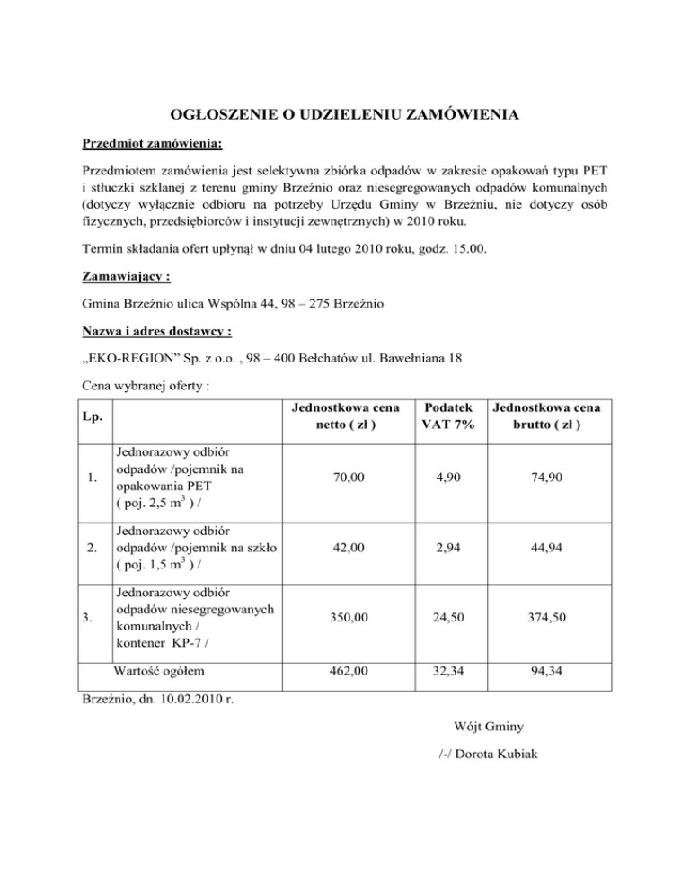 OGŁOSZENIE O UDZIELENIU ZAMÓWIENIA Przedmiot zamówienia: Przedmiotem zamówienia jest selektywna zbiórka odpadów w zakresie opakowań typu PET i stłuczki szklanej z terenu gminy Brzeźnio oraz niesegregowanych odpadów komunalnych (dotyczy wyłącznie odbioru na potrzeby Urzędu Gminy w Brzeźniu, nie dotyczy osób fizycznych, przedsiębiorców i instytucji zewnętrznych) w 2010 roku. Termin składania ofert upłynął w dniu 04 lutego 2010 roku, godz. 15.00. Zamawiający : Gmina Brzeźnio ulica Wspólna 44, 98 – 275 Brzeźnio Nazwa i adres dostawcy : „EKO-REGION” Sp. z o.o. , 98 – 400 Bełchatów ul. Bawełniana 18 Cena wybranej oferty : Jednostkowa cena netto ( zł ) Podatek VAT 7% Jednostkowa cena brutto ( zł ) 1. Jednorazowy odbiór odpadów /pojemnik na opakowania PET ( poj. 2,5 m3 ) / 70,00 4,90 74,90 2. Jednorazowy odbiór odpadów /pojemnik na szkło ( poj. 1,5 m3 ) / 42,00 2,94 44,94 Jednorazowy odbiór odpadów niesegregowanych komunalnych / kontener KP-7 / 350,00 24,50 374,50 Wartość ogółem 462,00 32,34 94,34 Lp. 3. Brzeźnio, dn. 10.02.2010 r. Wójt Gminy /-/ Dorota Kubiak