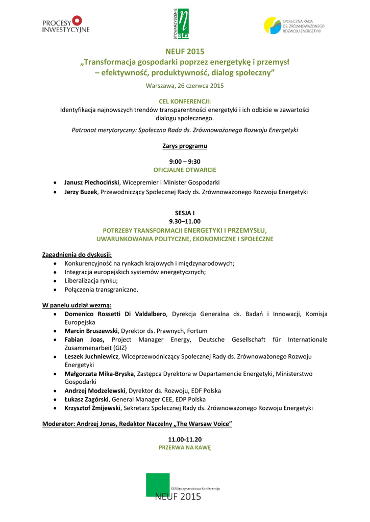 NEUF 2015 „Transformacja gospodarki poprzez energetykę i przemysł – efektywność, produktywność, dialog społeczny” Warszawa, 26 czerwca 2015 CEL KONFERENCJI: Identyfikacja najnowszych trendów transparentności energetyki i ich odbicie w zawartości dialogu społecznego. Patronat merytoryczny: Społeczna Rada ds. Zrównoważonego Rozwoju Energetyki Zarys programu 9:00 – 9:30 OFICJALNE OTWARCIE Janusz Piechociński, Wicepremier i Minister Gospodarki Jerzy Buzek, Przewodniczący Społecznej Rady ds. Zrównoważonego Rozwoju Energetyki SESJA I 9.30–11.00 POTRZEBY TRANSFORMACJI ENERGETYKI I PRZEMYSŁU, UWARUNKOWANIA POLITYCZNE, EKONOMICZNE I SPOŁECZNE Zagadnienia do dyskusji: Konkurencyjność na rynkach krajowych i międzynarodowych; Integracja europejskich systemów energetycznych; Liberalizacja rynku; Połączenia transgraniczne. W panelu udział wezmą: Domenico Rossetti Di Valdalbero, Dyrekcja Generalna ds. Badań i Innowacji, Komisja Europejska Marcin Bruszewski, Dyrektor ds. Prawnych, Fortum Fabian Joas, Project Manager Energy, Deutsche Gesellschaft für Internationale Zusammenarbeit (GIZ) Leszek Juchniewicz, Wiceprzewodniczący Społecznej Rady ds. Zrównoważonego Rozwoju Energetyki Małgorzata Mika-Bryska, Zastępca Dyrektora w Departamencie Energetyki, Ministerstwo Gospodarki Andrzej Modzelewski, Dyrektor ds. Rozwoju, EDF Polska Łukasz Zagórski, General Manager CEE, EDP Polska Krzysztof Żmijewski, Sekretarz Społecznej Rady ds. Zrównoważonego Rozwoju Energetyki Moderator: Andrzej Jonas, Redaktor Naczelny „The Warsaw Voice” 11.00-11.20 PRZERWA NA KAWĘ SESJA II 11.20-12.50 PRAKTYCZNE ROZWIĄZANIA PROCESU TRANSFORMACJI Zagadnienia do dyskusji: Aktywność innowacyjna w energetyce i przemyśle; Bezpieczeństwo energetyczne i komfort energetyczny; Procesy inwestycyjne – jak skutecznie przeprowadzać; Niskoemisyjna energetyka rozproszona; Niskoemisyjna energetyka węglowa. W panelu udział wezmą: Kjell Arne Nielsen, Doradca Handlowy w Ambasadzie Królestwa Norwegii w Warszawie Maher Chebbo, General Manager Energy and Natural Resources for EMEA, SAP Mieczysław Borowski, Prezes Urzędu Dozoru Technicznego Maciej Burny, Dyrektor ds. Regulacji, PGE Polska Grupa Energetyczna Mirosław Kowalik, Dyrektor ds. Sprzedaży i Marketingu, Alstom Power Włodzimierz Kędziora, Wiceprezes Zarządu, Veolia Energia Polska, Grzegorz Onichimowski, Przedstawiciel na Polskę, Enernoc Sławomir Śliwiński, Członek Zarządu ds. inwestycji, GAZ-SYSTEM Bożena Wróblewska, Ekspert Forum Rozwoju Efektywnej Energii (FREE) oraz Szefowa działu Innowacji, GASPOL ENERGY Moderator: Wojciech Jakóbik, Redaktor Naczelny, BiznesAlert.pl 12:50-13.10 PRZERWA NA POCZĘSTUNEK SESJA III 13.10-14.40 panel specjalny: DOSTOSOWANIE SYSTEMU PRZESYŁOWEGO I DYSTRYBUCYJNEGO DO TRANSFORMACJI SEKTORA ENERGETYCZNEGO* (sesja naukowo-badawcza) Zagadnienia do dyskusji: Dynamiczny przesył; Dynamiczne zarządzanie warunkiem rozwoju źródeł nieprogramowalnych (wiatr, słońce); Dynamiczne zarządzanie jako element „uinteligentniania” sieci przesyłowych i dystrybucyjnych; DSM, DSR; Przyszłość sieci. W panelu udział wezmą: Michał Ajchel, Wiceprezes Rynku Energetyki, Schneider Electric Krzysztof Kołodziejczyk, Dyrektor Sprzedaży i Wdrożeń – Utilities, Globema Bolesław Mostowski, Koordynator Operacyjny Projektu SDZP Włodzimierz Mucha, Dyrektor Departamentu Rozwoju Systemu, PSE Grzegorz Nowaczewski, Prezes Zarządu, Virtual Power Plant Wiesław Nowak, Profesor AGH Andrzej Szymański, Prezes Zarządu, LandisGyr Moderator: Bartłomiej Derski, Wydawca, „Wysokie Napięcie” 14.40-15.00 PRZERWA NA KAWĘ SESJA IV 15.00-16.30 warsztat towarzyszący projektu MILESECURE 2050: SPOŁECZNE ASPEKTY TRANSFORMACJI ENERGETYKI Zagadnienia do dyskusji: Możliwości dostosowania się do zmian zachodzących w sektorze; Społeczna transformacja energetyczna – utopia czy realna wizja? Społeczne aspekty transformacji energetycznej w Polsce i Europie – mocne i słabe strony oraz szanse i zagrożenia w procesie zmian; Bezpieczeństwo energetyczne w procesie społecznej transformacji energetycznej ; Zmiany reguł i ról oraz modeli biznesowych w energetyce i jej otoczeniu; Krajowe i międzynarodowe doświadczenia transformacji energetycznej – modele i podejścia; Socjologiczny wymiar transformacji. W panelu udział wezmą: Domenico Rossetti Di Valdalbero, Dyrekcja Generalna ds. Badań i Innowacji, Komisja Europejska Erik Bichard, Salford University, UK Jacopo Toniolo, Politecnico di Torino (POLITO), Włochy Krzysztof Chlebowski, PGE Bełchatów Leszek Drogosz, Dyrektor Biura Infrastruktury, Urząd Miasta St. Warszawy Zygmunt Parczewski, Instytut Energetyki Andrzej Sławiński, Pełnomocnik Dyrektora ds. Współpracy Międzynarodowej i Działalności Statutowej, Instytut Energetyki Adam Umer, Ekspert, Energsys Moderator: Bartłomiej Derski, Wydawca, „Wysokie Napięcie” *Panel jest realizowany w ramach Projektu SDZP dofinansowanego ze środków Narodowego Centrum Badań i Rozwoju oraz Narodowego Funduszu Ochrony Środowiska i Gospodarki Wodnej w ramach programu „Gekon”.