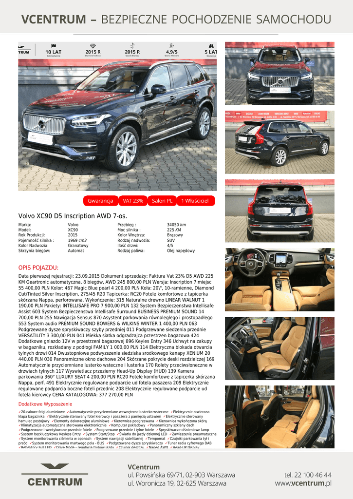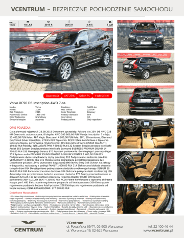 Volvo XC90 D5 Inscription AWD 7-os. Marka: Model: Rok Produkcji: Pojemność silnika : Kolor Nadwozia: Skrzynia biegów: Volvo XC90 2015 1969 cm3 Granatowy Automat Przebieg : Moc silnika : Kolor Wnętrza: Rodzaj nadwozia: Ilość drzwi: Rodzaj paliwa: 34050 km 225 KM Brązowy SUV 4/5 Olej napędowy OPIS POJAZDU: Data pierwszej rejestracji: 23.09.2015 Dokument sprzedaży: Faktura Vat 23% D5 AWD 225 KM Geartronic automatyczna, 8 biegów, AWD 245 800,00 PLN Wersja: Inscription 7 miejsc 55 400,00 PLN Kolor: 467 Magic Blue pearl 4 200,00 PLN Koła: 20\", 10-ramienne, Diamond Cut/Tinted Silver Inscription, 275/45 R20 Tapicerka: RC20 Fotele komfortowe z tapicerka skórzana Nappa, perforowana. Wykończenie: 315 Naturalne drewno LINEAR WALNUT 1 190,00 PLN Pakiety: INTELLISAFE PRO 7 900,00 PLN 132 System Bezpieczenstwa Intellisafe Assist 603 System Bezpieczenstwa Intellisafe Surround BUSINESS PREMIUM SOUND 14 700,00 PLN 255 Nawigacja Sensus 870 Asystent parkowania równoległego i prostopadłego 553 System audio PREMIUM SOUND BOWERS & WILKINS WINTER 1 400,00 PLN 063 Podgrzewane dysze spryskiwaczy szyby przedniej 011 Podgrzewane siedzenia przednie VERSATILITY 3 300,00 PLN 041 Miekka siatka odgradzajca przestrzen bagazowa 424 Dodatkowe gniazdo 12V w przestrzeni bagazowej 896 Keyles Entry 346 Uchwyt na zakupy w bagazniku, rozkładany z podłogi FAMILY 1 000,00 PLN 114 Elektryczna blokada otwarcia tylnych drzwi 014 Dwustopniowe podwyzszenie siedziska srodkowego kanapy XENIUM 20 440,00 PLN 030 Panoramiczne okno dachowe 204 Skórzane pokrycie deski rozdzielczej 169 Automatycznie przyciemniane lusterko wsteczne i lusterka 170 Rolety przeciwsłoneczne w drzwiach tylnych 117 Wyswietlacz przezierny Head-Up Display (HUD) 139 Kamera parkowania 360° LUXURY SEAT 4 200,00 PLN RC20 Fotele komfortowe z tapicerka skórzana Nappa, perf. 491 Elektrycznie regulowane podparcie ud fotela pasazera 209 Elektrycznie regulowane podparcia boczne foteli przednic 208 Elektrycznie regulowane podparcie ud fotela kierowcy CENA KATALOGOWA: 377 270,00 PLN Dodatkowe Wyposażenie ✓20-calowe felgi aluminiowe ✓Automatycznie przyciemniane wewnętrzne lusterko wsteczne ✓Elektrycznie otwierana klapa bagażnika ✓Elektrycznie sterowany fotel kierowcy i pasażera z pamięcią ustawień ✓Elektrycznie sterowany hamulec postojowy ✓Elementy dekoracyjne aluminiowe ✓Kierownica podgrzewana ✓Kierownica wykończona skórą ✓Klimatyzacja automatyczna sterowana elektronicznie ✓Komputer pokładowy ✓Panoramiczny szklany dach ✓Podgrzewane i wentylowane przednie fotele ✓Podgrzewane przednie i tylne fotele ✓Spryskiwacze ciśnieniowe lamp ✓System bezkluczykowy Keyless Entry ✓System Start/Stop ✓Światła do jazdy dziennej LED ✓Zawieszenie pneumatyczne ✓System monitorowania ciśnienia w oponach ✓System nawigacji satelitarnej ✓Tempomat ✓Czujniki parkowania tył i przód ✓System monitorowania martwego pola - BLIS ✓Podgrzewane dysze spryskiwaczy ✓Tuner radia cyfrowego DAB ✓Reflektory Full LED ✓Drive Mode - regulacja trybów jazdy ✓Czujnik deszczu ✓Napęd AWD ✓Head-UP Display ✓Elektryczne szyby ✓Automatyczna skrzynia biegów ✓Skórzana tapicerka ✓Przyciemniane szyby ✓Trzeci rząd siedzeń Systemy Bezpieczeństwa ✓Servotronic ✓System City Safety ✓System kontroli zjazdu ze wzniesienia ✓Asystent pasa ruchy ✓Zintegrowane podwyższenie dla dziecka na tylnej kanapie ✓Poduszka powietrzna kierowcy i pasażera ✓Poduszki przednie boczne ✓Poduszki tylne boczne ✓ISOFIX ✓Centralny zamek Multimedia ✓Kamera 360 stopni ✓Kamera wspomagająca parkowanie ✓Gniazdo AUX ✓Gniazdo USB / iPod® ✓Zestaw głośnomówiący Bluetooth ✓Radio CD ✓Kierownica wielofunkcyjna ✓Zestaw audio Bowers&Wilkins FINANSOWANIE I UBEZPIECZENIA: Przykładowa rata miesięczna, wpłata 20%, okres leasingu/kredytu 48 miesięcy, 10% wykupu. Rata leasingu jest wartością netto bez vat. Rata: 2 293 Cena: 295 900 PLN PLN Niniejsza treść nie stanowi oferty w rozumieniu przepisów Kodeksu Cywilnego oraz opisu towaru ani zapewnienia w rozumieniu art. 4 Ustawy z dnia 27 lipca 2002r o szczególnych warunkach sprzedaży konsumenckiej. Powered by TCPDF (www.tcpdf.org)