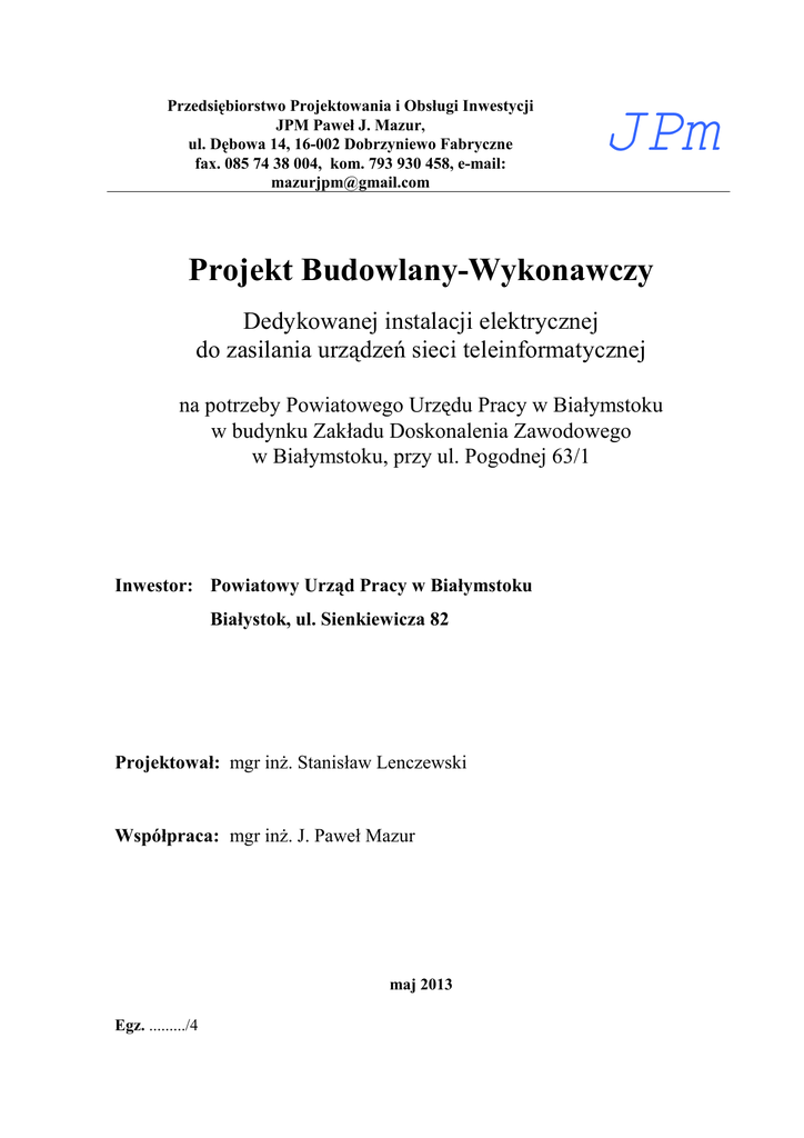 Przedsiębiorstwo Projektowania i Obsługi Inwestycji JPM Paweł J. Mazur, ul. Dębowa 14, 16-002 Dobrzyniewo Fabryczne fax. 085 74 38 004, kom. 793 930 458, e-mail: [email protected] JPm Projekt Budowlany-Wykonawczy Dedykowanej instalacji elektrycznej do zasilania urządzeń sieci teleinformatycznej na potrzeby Powiatowego Urzędu Pracy w Białymstoku w budynku Zakładu Doskonalenia Zawodowego w Białymstoku, przy ul. Pogodnej 63/1 Inwestor: Powiatowy Urząd Pracy w Białymstoku Białystok, ul. Sienkiewicza 82 Projektował: mgr inż. Stanisław Lenczewski Współpraca: mgr inż. J. Paweł Mazur maj 2013 Egz. ........./4 Projekt budowlany wykonawczy dedykowanej instalacji elektrycznej do zasilania urządzeń sieci teleinformatycznej na potrzeby Powiatowego Urzędu Pracy w Białymstoku w budynku Zakładu Doskonalenia Zawodowego w Białymstoku przy ul. Pogodnej 63/1. SPIS TREŚCI: Oświadczenie o zgodności z przepisami. ............................................................................3 Zaświadczenie o przynależności do POIIB. ........................................................................4 Stwierdzenie przygotowania zawodowego. .........................................................................5 1. Podstawa opracowania. ....................................................................................................6 2. Przedmiot opracowania.....................................................................................................6 3. Zakres opracowania. .........................................................................................................6 4. Opis techniczny. .................................................................................................................6 4.1. Założenia projektowe. ................................................................................................. 6 4.2. Stan istniejący............................................................................................................. 7 4.3. Zabezpieczenia dedykowanej sieci elektrycznej w rozdzielni RG. ............................... 7 4.4. Główna rozdzielnica komputerowa GRK. .................................................................... 7 4.5. WLZ-y do rozdzielnic kondygnacyjnych. ..................................................................... 8 4.6. Rozdzielnice komputerowe RKx w części ”głównej”. ................................................... 8 4.7. Rozdzielnica komputerowa RKx w części ”łącznik”. .................................................... 9 4.8. Obwody odbiorcze gniazd wtyczkowych. .................................................................... 9 4.9. Połączenia wyrównawcze. Instalacja uziemiająca. ...................................................... 9 4.10. Ochrona przed prądem przetężeniowym................................................................. 10 4.11. Ochrona przeciwporażeniowa. ................................................................................ 10 4.12. Ochrona przeciwpożarowa...................................................................................... 10 4.13. Ochrona przeciwprzepięciowa................................................................................. 10 4.14. Badania i pomiary pomontażowe. ........................................................................... 11 4.15. Ogólne zalecenia instalacyjne................................................................................. 11 5. Obliczenia techniczne.......................................................................................................12 5.1. Bilans mocy. ............................................................................................................. 13 5.2. Dobór przewodów i zabezpieczeń. ............................................................................ 14 6. Zestawienie materiałów zasadniczych...........................................................................18 7. Plany i schematy dedykowanej instalacji elektrycznej. ...............................................20 8. Informacja dotycząca bezpieczeństwa i ochrony zdrowia..........................................31 Strona 2 z 32 Projekt budowlany wykonawczy dedykowanej instalacji elektrycznej do zasilania urządzeń sieci teleinformatycznej na potrzeby Powiatowego Urzędu Pracy w Białymstoku w budynku Zakładu Doskonalenia Zawodowego w Białymstoku przy ul. Pogodnej 63/1. Oświadczenie o zgodności z przepisami. Białystok, dn. 31.05.2013 r. OŚWIADCZENIE Oświadczam, że projekt budowlany wykonawczy dedykowanej instalacji elektrycznej do zasilania urządzeń sieci teleinformatycznej na potrzeby Powiatowego Urzędu Pracy w Białymstoku w budynku Zakładu Doskonalenia Zawodowego w Białymstoku przy ul. Pogodnej 63/1 został sporządzony zgodnie z obowiązującymi przepisami oraz zasadami wiedzy technicznej. Projektant: Stanisław Lenczewski Strona 3 z 32 Projekt budowlany wykonawczy dedykowanej instalacji elektrycznej do zasilania urządzeń sieci teleinformatycznej na potrzeby Powiatowego Urzędu Pracy w Białymstoku w budynku Zakładu Doskonalenia Zawodowego w Białymstoku przy ul. Pogodnej 63/1. Zaświadczenie o przynależności do POIIB. Strona 4 z 32 Projekt budowlany wykonawczy dedykowanej instalacji elektrycznej do zasilania urządzeń sieci teleinformatycznej na potrzeby Powiatowego Urzędu Pracy w Białymstoku w budynku Zakładu Doskonalenia Zawodowego w Białymstoku przy ul. Pogodnej 63/1. Stwierdzenie przygotowania zawodowego. Strona 5 z 32 Projekt budowlany wykonawczy dedykowanej instalacji elektrycznej do zasilania urządzeń sieci teleinformatycznej na potrzeby Powiatowego Urzędu Pracy w Białymstoku w budynku Zakładu Doskonalenia Zawodowego w Białymstoku przy ul. Pogodnej 63/1. 1. Podstawa opracowania. Przedmiotem niniejszego opracowania jest projekt budowlany wykonawczy dedykowanej instalacji elektrycznej do zasilania urządzeń