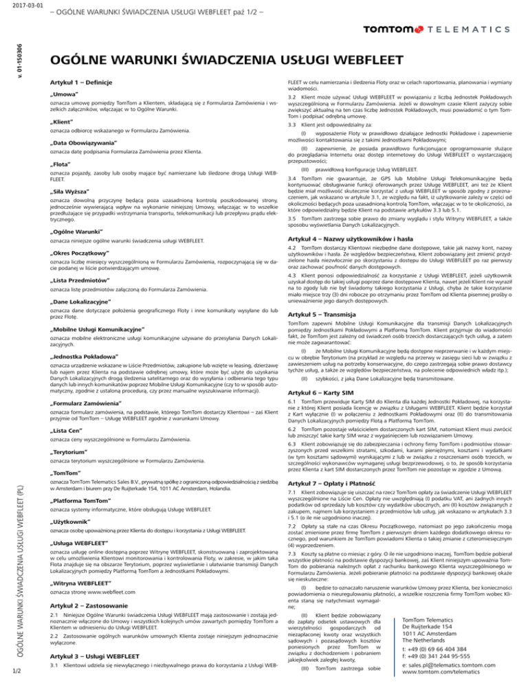 v. 01-150306 2017-03-01 – OGÓLNE WARUNKI ŚWIADCZENIA USŁUGI WEBFLEET paź 1/2 – OGÓLNE WARUNKI ŚWIADCZENIA USŁUGI WEBFLEET Artykuł 1 – Definicje „Umowa” oznacza umowę pomiędzy TomTom a Klientem, składającą się z Formularza Zamówienia i wszelkich załączników, włączając w to Ogólne Warunki. „Klient” oznacza odbiorcę wskazanego w Formularzu Zamówienia. „Data Obowiązywania” oznacza datę podpisania Formularza Zamówienia przez Klienta. „Flota” oznacza pojazdy, zasoby lub osoby mające być namierzane lub śledzone drogą Usługi WEBFLEET. „Siła Wyższa” oznacza dowolną przyczynę będącą poza uzasadnioną kontrolą poszkodowanej strony, jednocześnie wywierającą wpływ na wykonanie niniejszej Umowy, włączając w to wszelkie przedłużające się przypadki wstrzymania transportu, telekomunikacji lub przepływu prądu elektrycznego. FLEET w celu namierzania i śledzenia Floty oraz w celach raportowania, planowania i wymiany wiadomości. 3.2 Klient może używać Usługi WEBFLEET w powiązaniu z liczbą Jednostek Pokładowych wyszczególnioną w Formularzu Zamówienia. Jeżeli w dowolnym czasie Klient zażyczy sobie zwiększyć aktualną na ten czas liczbę Jednostek Pokładowych, musi powiadomić o tym TomTom i podpisać odrębną umowę. 3.3 Klient jest odpowiedzialny za: (I) wyposażenie Floty w prawidłowo działające Jednostki Pokładowe i zapewnienie możliwości kontaktowania się z takimi Jednostkami Pokładowymi; (II) zapewnienie, że posiada prawidłowo funkcjonujące oprogramowanie służące do przeglądania Internetu oraz dostęp internetowy do Usługi WEBFLEET o wystarczającej przepustowości; (III) prawidłową konfigurację Usług WEBFLEET. 3.4 TomTom nie gwarantuje, że GPS lub Mobilne Usługi Telekomunikacyjne będą kontynuować obsługiwanie funkcji oferowanych przez Usługę WEBFLEET, ani też że Klient będzie miał możliwość skutecznie korzystać z usługi WEBFLEET w sposób zgodny z przeznaczeniem, jak wskazano w artykule 3.1, ze względu na fakt, iż użytkowanie zależy w części od okoliczności będących poza uzasadnioną kontrolą TomTom, włączając w to te okoliczności, za które odpowiedzialny będzie Klient na podstawie artykułów 3.3 lub 5.1. 3.5 TomTom zastrzega sobie prawo do zmiany wyglądu i stylu Witryny WEBFLEET, a także sposobu wyświetlania Danych Lokalizacyjnych. „Ogólne Warunki” oznacza niniejsze ogólne warunki świadczenia usługi WEBFLEET. „Okres Początkowy” oznacza liczbę miesięcy wyszczególnioną w Formularzu Zamówienia, rozpoczynającą się w dacie podanej w liście potwierdzającym umowę. „Dane Lokalizacyjne” oznacza dane dotyczące położenia geograficznego Floty i inne komunikaty wysyłane do lub przez Flotę. Artykuł 5 – Transmisja oznacza listę przedmiotów załączoną do Formularza Zamówienia. „Mobilne Usługi Komunikacyjne” oznacza mobilne elektroniczne usługi komunikacyjne używane do przesyłania Danych Lokalizacyjnych. „Jednostka Pokładowa” oznacza urządzenie wskazane w Liście Przedmiotów, zakupione lub wzięte w leasing, dzierżawę lub najem przez Klienta na podstawie odrębnej umowy, które może być użyte do uzyskania Danych Lokalizacyjnych drogą śledzenia satelitarnego oraz do wysyłania i odbierania tego typu danych lub innych komunikatów poprzez Mobilne Usługi Komunikacyjne (czy to w sposób automatyczny, zgodnie z ustaloną procedurą, czy przez manualne wyszukiwanie informacji). „Formularz Zamówienia” oznacza formularz zamówienia, na podstawie, którego TomTom dostarczy Klientowi – zaś Klient przyjmie od TomTom – Usługę WEBFLEET zgodnie z warunkami Umowy. „Lista Cen” oznacza ceny wyszczególnione w Formularzu Zamówienia. „Terytorium” oznacza terytorium wyszczególnione w Formularzu Zamówienia. „TomTom” OGÓLNE WARUNKI ŚWIADCZENIA USŁUGI WEBFLEET (PL) 4.2 TomTom dostarczy Klientowi niezbędne dane dostępowe, takie jak nazwy kont, nazwy użytkowników i hasła. Ze względów bezpieczeństwa, Klient zobowiązany jest zmienić przydzielone hasła niezwłocznie po skorzystaniu z dostępu do Usługi WEBFLEET po raz pierwszy oraz zachować poufność danych dostępowych. 4.3 Klient ponosi odpowiedzialność za korzystanie z Usługi WEBFLEET, jeżeli użytkownik uzyskał dostęp do takiej usługi poprzez dane dostępowe Klienta, nawet jeżeli Klient nie wyraził na to zgody lub nie był świadomy takiego korzystania z Usługi, chyba że takie korzystanie miało miejsce trzy (3) dni robocze po otrzymaniu przez TomTom od Klienta pisemnej prośby o unieważnienie jego danych dostępowych. „Lista Przedmiotów” 1/2 Artykuł 4 – Nazwy użytkowników i hasła oznacza TomTom Telematics Sales B.V., prywatną spółkę z ograniczoną odpowiedzialnością z siedzibą w Amsterdam i biurem przy De Ruijterkade 154, 1011 AC Amsterdam, Holandia. „Platforma TomTom” oznacza systemy informatyczne, które obsługują Usługę WEBFLEET. „Użytkownik” oznacza osobę upoważnioną przez Klienta do dostępu i korzystania z Usługi WEBFLEET. „Usługa WEBFLEET” oznacza usługę online dostępną poprzez Witrynę WEBFLEET, skonstruowaną i zaprojektowaną w celu umożliwienia Klientowi monitorowania i kontrolowania Floty, w zakresie, w jakim taka Flota znajduje się na obszarze Terytorium, poprzez wyświetlanie i ułatwianie transmisji Danych Lokalizacyjnych pomiędzy Platformą TomTom a Jednostkami Pokładowymi. „Witryna WEBFLEET” oznacza stronę www.webfleet.com Artykuł 2 – Zastosowanie 2.1 Niniejsze Ogólne Warunki świadczenia Usługi WEBFLEET mają zastosowanie i zostają jednoznacznie włączone do Umowy i wszystkich kolejnych umów zawartych pomiędzy TomTom a Klientem w odniesieniu do Usługi WEBFLEET. 2.2 Zastosowanie ogólnych warunków umownych Klienta zostaje niniejszym jednoznacznie wyłączone. Artykuł 3 – Usługi WEBFLEET 3.1 Klientowi udziela się niewyłącznego i niezbywal