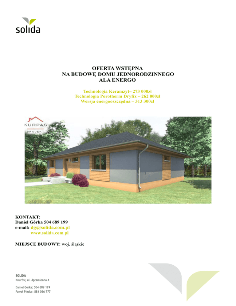 OFERTA WSTĘPNA NA BUDOWĘ DOMU JEDNORODZINNEGO ALA ENERGO Technologia Keramzyt– 273 000zł Technologia Porotherm Dryfix – 262 000zł Wersja energooszczędna – 313 300zł KONTAKT: Daniel Górka 504 689 199 e-mail: [email protected] www.solida.com.pl MIEJSCE BUDOWY: woj. śląskie Zalety naszej oferty, które mogą zadecydować o podjęciu przez Państwa decyzji o rozpoczęciu własnej inwestycji to: • • • • fachowa obsługa i doradztwo techniczne profesjonalne, sprawne i sprawdzone ekipy budowlane terminowe rozpoczęcie i zakończenie prac budowlanych na życzenie klienta, pomoc w wyborze projektu tak, aby był on zgodny z wyznaczonym budżetem na budowę domu. WARUNKI REALIZACJI W cenie budowy zostały ujęte: • prowadzenie dokumentacji budowlanej, • nadzór Kierownika Budowy, • wywóz nieczystości. Podane ceny są cenami netto (należy doliczyć 8% VAT). PŁYTA FUNDAMENTOWA Zakres prac obejmuje: · badanie geotechniczne gruntu, · wytyczenie geodezyjne budynku, · wykonanie projektu zamiennego płyty fundamentowej, · usunięcie warstwy nienośnej gruntu o grubości 30 cm z odwozem do 20 m, · wykonanie odpowiednio zagęszczonej podbudowy płyty fundamentowej z podsypki piaskowej (zgodnie z projektem płyty) w uprzednio przygotowanym wykopie, · wykonanie podkładu z chudego betonu, · wykonanie izolacji przeciwwilgociowej z podwójnej warstwy folii ochronnej, · wykonanie zewnętrznego krawędziowego docieplenia płyty ze styropianu EPS 200 o grub. 10 cm, · wykonanie zewnętrznego obwodowego docieplenia (opaski) płyty ze styropianu EPS 200 o grub. 10 cm, · wykonanie uszczelnienia styropianowych elementów brzegowych pianką uszczelniającą, · ułożenie podejść kanalizacyjnych (do 5szt.) i wyprowadzenie instalacji kanalizacyjnej poza obręb płyty (ok.1,0m), · ułożenie i wyprowadzenie instalacji powietrznej kominka poza obręb płyty (1 szt.), · ułożenie i wyprowadzenie przepustu instalacji przyłącza wody w płycie wraz z wyprowadzeniem instalacji poza obręb płyty (1 szt.), · ułożenie i wyprowadzenie przepustu instalacji elektrycznej i multimedialnej w płycie (1 szt.), · wbudowanie betonu za pomocą pompy, · zawibrowanie powierzchni listwą wibracyjną i wyrównanie powierzchni płyty fundamentowej; · pielęgnacja płyty poprzez zabezpieczenie folią (zależnie od warunków atmosferycznych) Do oferty przyjęto posadowienie płyty na gruntach zaliczanych do I kategorii geotechnicznej. Nie uwzględniono zabezpieczeń na szkody górnicze. Przyjęto 50 cm grubości podbudowy pod fundamentem, w przypadku warunków gruntowych wymagających grubszej podbudowy, np. na skutek znacznego nachylenia terenu, koszty etapu mogą wzrosnąć. Koszt dodatkowej podbudowy 75zł/m3. ŚCIANY ZEWNĘTRZNE i WEWNĘTRZNE Zakres prac obejmuje: · adaptacja ścian do projektu budowlanego, · prefabrykacja ścian wraz z transportem na plac budowy, · montaż prefabrykatów, · zazbrojenie konstrukcji wraz z wypełnieniem zamków betonem C16/20, · wykonanie kosmetyki połączeń (wykonywana po zamknięciu budynku). GWARANCJA NA ŚCIANY 50 LAT DACH WRAZ Z ORYNNOWANIEM, KOMINY SPALINOWE I WENTYLACYJNE Zakres prac obejmuje: · wykonanie konstrukcji drewnianej dachu · pokrycie połaci folią dachową, łacenie, · wykonanie przewodów spalinowych (2 sztuki – do kotła i kominka) i wentylacyjnych z systemowych kształtek kominowych SCHIEDEL i kominków wentylacyjnych DuroVent, · wykonanie czapek kominowych, · wykończenie kominów płytkami klinkierowymi ponad połacią dachu, · pokrycie dachówką cementową BRAAS, typ Celtycka w jednym z 5 podstawowych kolorów, · obróbki: wykonanie koszy, pasa nadrynnowego i opierzenia komina, · montaż ławy kominiarskiej i wyłazu dachowego wg projektu, · orynnowanie z PCV w jednym z podstawowych kolorów oferowanych przez producenta oraz montaż rur spustowych pionowych, zakończonych na dole kolanem jednokielichowym, · wykonanie podbitek z listew drewnianych sosnowych lub świerkowych, malowanych gr. 12 mm. (wykonywane na etapie elewacji ) PRODUCENT UDZIELA 30 LETNIEJ GWARANCJI NA DACHÓWKĘ. DACH WYKONANY NA PEŁNYM SYSTEMIE BRAAS (bez zamienników). Zakres prac nie obejmuje odprowadzenia deszczówki spod rur spustowych. STOLARKA OKIENNA Z PVC Zakres prac obejmuje: · dostawa i montaż okien według projektu: stolarka okienna PVC firmy EUROCOLOR, w kolorze 1-str okleinowanym: profil 7-komorowy, DRZWI ZEWNĘTRZNE Zakres prac obejmuje: · dostawa i montaż drzwi wejściowych PVC EUROCOLOR U=0,7, z pełnym wyposażeniem, kolorystyka wg palety producenta (wymiary standardowe, bez doświetleń bocznych i górnych). INSTALACJA WOD-KAN Zakres prac obejmuje: · wykonanie podejść kanalizacyjnych i wodociągowych wg projektu za wodomierzem, wewnątrz budynku rurami PP i PCV. Uwaga: Zakres prac nie obejmuje wykonania przyłącza wody do budynku oraz „białego montażu”. INSTALACJA ELEKTRYCZNA I TELETECHNICZNA Zakres prac obejmuje: · wykonanie punktów instalacji elektrycznej (gniazd 230v) wewnątrz budynku wg projektu, · wykonanie punktów instalacji oświetlenia wewnątrz budynku wg projektu, · wyprowadzenie instalacji pod dzwonek · wykonanie w obrębie domu instalacji telewizyjnej i teletechnicznej 4 punkty wraz z wyprowadzeniem na zewnątrz budynku · wykonanie jednego gniazda siłowego 400V zabezpieczonego samodzielnie, · dodatkowe zabezpieczenie kuchni, łazienek, garażu linką 4 mm2 (listwa ekwipotencjalna) · wykonanie uziemienia instalacji za pomocą bednarki lub szpilki uziemiającej, · wykonanie tablicy bezpiecznikowej (wyłączniki różnicowoprądowe- 2 szt., zabezpieczenie nadprądowe -1 szt. na max. 8 punktów) Wycena obejmuje osprzęt firmy MOELLER lub LEGRAND. Zakres prac nie obejmuje wykonania przyłącza energii elektrycznej do budynku oraz przyłącza telefonii oraz „białego montażu”. Zakres prac nie obejmuje wykonania instalacji odgromowej. INSTALACJA C.O. Zakres prac obejmuje: · wykonanie ins