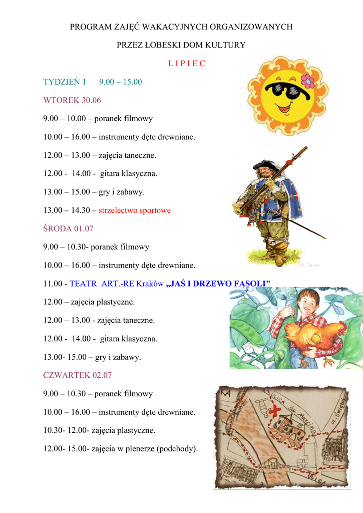 PROGRAM ZAJĘĆ WAKACYJNYCH ORGANIZOWANYCH PRZEZ ŁOBESKI DOM KULTURY LIPIEC TYDZIEŃ 1 9.00 – 15.00 WTOREK 30.06 9.00 – 10.00 – poranek filmowy 10.00 – 16.00 – instrumenty dęte drewniane. 12.00 – 13.00 – zajęcia taneczne. 12.00 - 14.00 - gitara klasyczna. 13.00 – 15.00 – gry i zabawy. 13.00 – 14.30 – strzelectwo sportowe ŚRODA 01.07 9.00 – 10.30- poranek filmowy 10.00 – 16.00 – instrumenty dęte drewniane. 11.00 - TEATR ART.-RE Kraków „JAŚ I DRZEWO FASOLI" 12.00 – zajęcia plastyczne. 12.00 – 13.00 - zajęcia taneczne. 12.00 - 14.00 - gitara klasyczna. 13.00- 15.00 – gry i zabawy. CZWARTEK 02.07 9.00 – 10.30 – poranek filmowy 10.00 – 16.00 – instrumenty dęte drewniane. 10.30- 12.00- zajęcia plastyczne. 12.00- 15.00- zajęcia w plenerze (podchody). PIĄTEK 03.07 9.00- 10.30 – poranek filmowy 10.00 – 16.00 – instrumenty dęte drewniane. 13.00 – zajęcia taneczno-rytmiczne „ZUMBA” TYDZIEŃ 2 9.00 – 15.00 WTOREK 07.07 9.00-10.30 – poranek filmowy 10.00 – 16.00 – instrumenty dęte drewniane. 10.30 -12.00 – zajęcia plastyczne. 12.00 – 13.00 – zajęcia taneczne. 12.00 - 14.00 - gitara klasyczna. 13.00 – 14.30 – strzelectwo sportowe 13.00 – 15.00 – gry i zabawy. ŚRODA 08.07 9.00 – 10.30- zajęcia rękodzielnicze 10.00 – 16.00 – instrumenty dęte drewniane. 10.30 – 12.00 – Karaoke. 12.00 – 13.00 - zajęcia taneczne. 12.00 - 14.00 - gitara klasyczna. 13.00- 15.00 – gry i zabawy. CZWARTEK 09.07 9.00 – 10.30 – poranek filmowy 10.00 – 16.00 – instrumenty dęte drewniane. 10.30- 12.00- zajęcia plastyczne. 12.00- 15.00- zajęcia w plenerze – park miejski PIĄTEK 10.07 9.00- 10.30 – poranek filmowy 10.00 – 16.00 – instrumenty dęte drewniane. 10.30 – 11.30 –zajęcia plastyczne 11.30 – 13.00 – zajęcia kulinarne – domowe wypieki 13.00 – zajęcia taneczno-rytmiczne - ZUMBA TYDZIEŃ 3 9.00 – 15.00 WTOREK 14.07 9.00-10.30 – poranek filmowy 10.00 – 16.00 – instrumenty dęte drewniane. 10.30 -12.00 – zajęcia plastyczne. 12.00 – 13.00 – zajęcia taneczne. 12.00 - 14.00 - gitara klasyczna. 13.00 – 14.30 – strzelectwo sportowe 13.00 – 15.00 – gry i zabawy. ŚRODA 15.07 10.00 – 11.00 –TEATR ART-RE Z KRAKOWA „BOCIAN I ŻABKA" 10.00 – 16.00 – instrumenty dęte drewniane. 11.00 – 13.00 – zajęcia plastyczne. 12.00 - 14.00 - gitara klasyczna. 13.00- 15.00 – gry i zabawy. CZWARTEK 16.07 9.00 – 10.30 – Poranek filmowy 10.00 – 16.00 – instrumenty dęte drewniane. 10.30- 12.00- karaoke. 12.00- 15.00- zajęcia w plenerze (podchody). PIĄTEK 17.07 9.00- 10.30 – poranek filmowy 10.00 – 16.00 – instrumenty dęte drewniane. 13.00 – zajęcia taneczno-rytmiczne - ZUMBA TYDZIEŃ 4 9.00 - 15.00 WTOREK 21.07 9.00-10.30 – poranek filmowy – projekcja filmów 10.00 – 16.00 – instrumenty dęte drewniane. Reich 10.30 -12.00 – zajęcia plastyczne. 12.00 – 13.00 – zajęcia taneczne. 12.00 - 14.00 - gitara klasyczna. 13.00 – 14.30 – strzelectwo sportowe 13.00 – 15.00 – gry i zabawy. ŚRODA 22.07 9.00 – 10.30- poranek filmowy 10.00 – 16.00 – instrumenty dęte drewniane. 10.30 – 12.00 – zajęcia plastyczne. 12.00 – 13.00 - zajęcia taneczne. 12.00 - 14.00 - gitara klasyczna. 13.00- 15.00 – gry i zabawy sportowe CZWARTEK 23.07 9.00 – 10.30 – poranek filmowy 10.00 – 16.00 – instrumenty dęte drewniane. 10.30- 12.00 - zajęcia rękodzielnicze 12.00- 15.00- zajęcia w plenerze (poszukiwacze skarbów). PIĄTEK 24.07 9.00- 10.30 – poranek filmowy 10.30 – 12.00 – zgaduj zgadula „Jaka to bajka…?” 10.00 – 16.00 – instrumenty dęte drewniane. 13.00 – zajęcia taneczno-rytmiczne - ZUMBA TYDZIEŃ 5 9.00 – 15.00 WTOREK 28.07 9.00 – 10.30 – poranek filmowy 10.00 – 16.00 – instrumenty dęte drewniane. 11.00 -13.00 – zajęcia plastyczne. 12.00 - 14.00 - gitara klasyczna. 13.00 – 14.30 – strzelectwo sportowe – TURNIEJ STRZELECKI 13.00 – 15.00 – gry i zabawy. ŚRODA 29.07 9.00 – 10.30- poranek filmowy 10.00 – 16.00 – instrumenty dęte drewniane. 10.30 – 12.00 – zajęcia plastyczne. 12.00 - 14.00 - gitara klasyczna. 12.00 – 13.00 - zajęcia taneczne. 13.00- 15.00 – gry i zabawy. CZWARTEK 30.07 9.00 – 10.30 – poranek filmowy 10.00 – 16.00 – instrumenty dęte drewniane. 10.30 - 12.30 - zajęcia rękodzielnicze 12.30- 15.00- zajęcia w plenerze – zabytki Łobza . PIĄTEK 31.07 9.00- 10.30 – poranek filmowy 10.00 – 11.30 – wielkie malowanie kredą na chodniku 10.00 – 16.00 – instrumenty dęte drewniane. 12.00 – 13.00 – rozgrywki sportowe – park miejski 13.00 – zajęcia taneczno-rytmiczne - ZUMBA