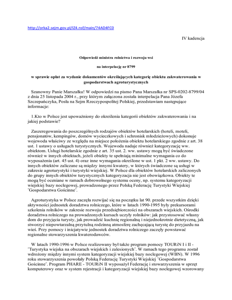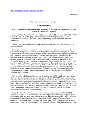 http://orka2.sejm.gov.pl/IZ4.nsf/main/74AD4FC0 IV kadencja Odpowiedź ministra rolnictwa i rozwoju wsi na interpelację nr 8799 w sprawie opłat za wydanie dokumentów określających kategorię obiektu zakwaterowania w gospodarstwach agroturystycznych Szanowny Panie Marszałku! W odpowiedzi na pismo Pana Marszałka nr SPS-0202-8799/04 z dnia 25 listopada 2004 r., przy którym załączona została interpelacja Pana Józefa Szczepańczyka, Posła na Sejm Rzeczypospolitej Polskiej, przedstawiam następujące informacje: 1.Kto w Polsce jest upoważniony do określenia kategorii obiektów zakwaterowania i na jakiej podstawie? Zaszeregowania do poszczególnych rodzajów obiektów hotelarskich (hoteli, moteli, pensjonatów, kempingów, domów wycieczkowych i schronisk młodzieżowych) dokonuje wojewoda właściwy ze względu na miejsce położenia obiektu hotelarskiego zgodnie z art. 38 ust. 1 ustawy o usługach turystycznych. Wojewoda nadaje również kategoryzację ww. obiektom. Usługi hotelarskie zgodnie z art. 35 ust. 2. ww. ustawy mogą być świadczone również w innych obiektach, jeżeli obiekty te spełniają minimalne wymagania co do wyposażenia (art. 45 ust. 4) oraz inne wymagania określone w ust. 1 pkt. 2 ww. ustawy. Do innych obiektów zaliczane są między innymi kwatery, w których świadczone są usługi w zakresie agroturystyki i turystyki wiejskiej. W Polsce dla obiektów hotelarskich zaliczonych do grupy innych obiektów turystycznych kategoryzacja nie jest obowiązkowa. Obiekty te mogą być oceniane w ramach dobrowolnego systemu oceny, np. systemu kategoryzacji wiejskiej bazy noclegowej, prowadzonego przez Polską Federację Turystyki Wiejskiej ˝Gospodarstwa Gościnne˝. Agroturystyka w Polsce zaczęła rozwijać się na początku lat 90. przede wszystkim dzięki aktywności jednostek doradztwa rolniczego, które w latach 1990-1995 były prekursorami szkolenia rolników w zakresie rozwoju przedsiębiorczości na obszarach wiejskich. Ośrodki doradztwa rolniczego na prowadzonych kursach uczyły rolników: jak przystosować własny dom do przyjęcia turysty, jak prowadzić kuchnię regionalną i niejednokrotnie dietetyczną, jak stworzyć niepowtarzalną przytulną rodzinną atmosferę zachęcającą turystę do przyjazdu na wieś. Przy pomocy i inicjatywie jednostek doradztwa rolniczego zaczęły powstawać regionalne stowarzyszenia kwaterodawców. W latach 1990-1996 w Polsce realizowany był także program pomocy TOURiN I i II ˝Turystyka wiejska na obszarach wiejskich i zalesionych˝. W ramach tego programu został wdrożony między innymi system kategoryzacji wiejskiej bazy noclegowej (WBN). W 1996 roku stowarzyszenia powołały Polską Federację Turystyki Wiejskiej ˝Gospodarstwa Gościnne˝. Program PHARE - TOURiN II wyposażył Federację i stowarzyszenia w sprzęt komputerowy oraz w system rejestracji i kategoryzacji wiejskiej bazy noclegowej wzorowany na systemach i kryteriach przyjętych w krajach Unii Europejskiej. W programie pilotażowym zostało skategoryzowanych około 1000 gospodarstw (można było poddać kategoryzacji tylko jeden pokój w gospodarstwie). Została wykształcona kadra inspektorów nadających kategoryzację. W chwili obecnej upoważnionych do przeprowadzenia kategoryzacji jest 85 inspektorów (około 60 % z nich to pracownicy jednostek doradztwa rolniczego). W roku 1999 decyzją Urzędu Kultury Fizycznej i Turystyki przekazano na własność system kategoryzacji wiejskiej bazy noclegowej (WBN) Polskiej Federacji Turystyki Wiejskiej ˝Gospodarstwa Gościnne˝. Aktualnie rekomendację PFTW ˝GG˝ posiada niewiele ponad 500 obiektów na ogólną szacowaną liczbę 8 500 kwater agroturystycznych funkcjonujących w czynnych gospodarstwach rolnych. 2. Czy właściciele już funkcjonujących gospodarstw oraz rolnicy zamierzają podjąć taką działalność, za wydanie certyfikatu lub promesy będą ponosić opłaty, a jeżeli tak, to w jakiej wysokości, kto i na jakiej podstawie określa? Osoby już prowadzące lub zamierzające podjąć działalność związaną z wynajmem pokoi z przeznaczeniem na świadczenie usług turystycznych na obszarach wiejskich nie muszą ubiegać się o kategoryzację. Kategoryzacja obiektów turystyki wiejskiej nawet dla gospodarstw zrzeszonych w stowarzyszeniach jest dobrowolna. Obowiązek kategoryzacji obiektów agroturystycznych został wprowadzony tylko na potrzeby Sektorowego Programu Operacyjnego ˝Restrukturyzacja sektora żywnościowego oraz rozwój obszarów wiejskich˝ dla działania ˝Różnicowanie działalności rolniczej i zbliżonej do rolnictwa w celu zapewnienia różnorodności działań lub alternatywnych źródeł dochodów˝. W zasadach ubiegania się o pomoc ze środków publicznych (UE i budżetu państwa) na realizację przedsięwzięć z zakresu agroturystyki w ww. działaniu wprowadzono obowiązek kategoryzacji. Agencja Restrukturyzacji i Modernizacji Rolnictwa nawiązała współpracę z Polską Federacją Turystyki Wiejskiej ˝GG˝. Przed złożeniem wniosku o pomoc w ramach ww. działania do Oddziałów ARiMR ubiegający się o dofinansowanie w zakresie agroturystyki ma obowiązek przedłożyć opinię inspektora, czy planowane przedsięwzięcie spełnia kryteria określone w zasadach kategoryzacji. Opinia ta wydawana jest bezpłatnie przez inspektora zarówno dla osób stowarzyszonych w Federacji, jak i niezrzeszonych. Inspektorzy podpisali stosowne oświadczenia w tym zakresie. Przy ostatnim wniosku o płatność składanym do ARiMR, po zrealizowaniu całego zadania, ubiegający się o dofinansowanie z zakresu agroturystyki ma obowiązek przedłożyć również dokument określający przyznaną kategorię. Za przeprowadzenie inspekcji i nadanie kategorii pobierana jest opłata, zgodnie z regulaminem kategoryzacji Polskiej Federacji Turystyki Wiejskiej ˝GG˝. Opłata ta przy korzystaniu z pomocy publicznej w ramach funduszy SPO jest kosztem kwalifikowanym (podlega częściowej refun