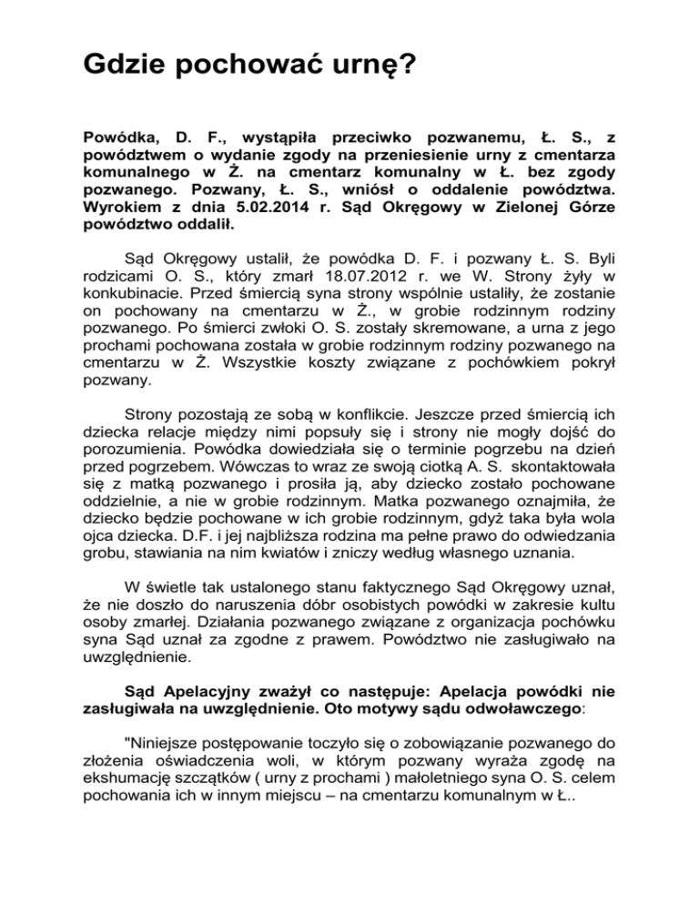 Gdzie pochować urnę? Powódka, D. F., wystąpiła przeciwko pozwanemu, Ł. S., z powództwem o wydanie zgody na przeniesienie urny z cmentarza komunalnego w Ż. na cmentarz komunalny w Ł. bez zgody pozwanego. Pozwany, Ł. S., wniósł o oddalenie powództwa. Wyrokiem z dnia 5.02.2014 r. Sąd Okręgowy w Zielonej Górze powództwo oddalił. Sąd Okręgowy ustalił, że powódka D. F. i pozwany Ł. S. Byli rodzicami O. S., który zmarł 18.07.2012 r. we W. Strony żyły w konkubinacie. Przed śmiercią syna strony wspólnie ustaliły, że zostanie on pochowany na cmentarzu w Ż., w grobie rodzinnym rodziny pozwanego. Po śmierci zwłoki O. S. zostały skremowane, a urna z jego prochami pochowana została w grobie rodzinnym rodziny pozwanego na cmentarzu w Ż. Wszystkie koszty związane z pochówkiem pokrył pozwany. Strony pozostają ze sobą w konflikcie. Jeszcze przed śmiercią ich dziecka relacje między nimi popsuły się i strony nie mogły dojść do porozumienia. Powódka dowiedziała się o terminie pogrzebu na dzień przed pogrzebem. Wówczas to wraz ze swoją ciotką A. S. skontaktowała się z matką pozwanego i prosiła ją, aby dziecko zostało pochowane oddzielnie, a nie w grobie rodzinnym. Matka pozwanego oznajmiła, że dziecko będzie pochowane w ich grobie rodzinnym, gdyż taka była wola ojca dziecka. D.F. i jej najbliższa rodzina ma pełne prawo do odwiedzania grobu, stawiania na nim kwiatów i zniczy według własnego uznania. W świetle tak ustalonego stanu faktycznego Sąd Okręgowy uznał, że nie doszło do naruszenia dóbr osobistych powódki w zakresie kultu osoby zmarłej. Działania pozwanego związane z organizacja pochówku syna Sąd uznał za zgodne z prawem. Powództwo nie zasługiwało na uwzględnienie. Sąd Apelacyjny zważył co następuje: Apelacja powódki nie zasługiwała na uwzględnienie. Oto motywy sądu odwoławczego: "Niniejsze postępowanie toczyło się o zobowiązanie pozwanego do złożenia oświadczenia woli, w którym pozwany wyraża zgodę na ekshumację szczątków ( urny z prochami ) małoletniego syna O. S. celem pochowania ich w innym miejscu – na cmentarzu komunalnym w Ł.. W wypadku sporu między osobami, którym przysługuje prawo ekshumacji, osoba uprawniona do niej, może skutecznie domagać się zobowiązania innej uprawnionej osoby do złożenia stosownego oświadczenia woli dopiero wtedy, gdy dobro osobiste osoby domagającej się ekshumacji (sfera kultu dla zmarłego) zostaje zagrożona cudzym działaniem bezprawnym w takim stopniu, że samo zaniechanie tego działania, przedstawia się jako niewystraczające. Wynika z tego, że obowiązkiem Sądu w pierwszej kolejności było ustalenie, czy doszło do naruszenia dóbr osobistych powódki odnoszących się do sfery kultu osoby zmarłej. Negatywna odpowiedź na tak postawione pytanie winna prowadzić do oddalenia powództwa. Trafnie wskazał Sąd pierwszej instancji, że kult pamięci zmarłego polega na przysługujących człowiekowi uprawnieniach, wypływających ze sfery uczuć i odczuć odnoszących się do postaci osoby zmarłej, okazywania szacunku dla wspomnień i pamięci o niej, urządzenia pogrzebu oraz nagrobka i decydowania o jego wystroju, załatwiania spraw z zarządem cmentarza, ochronie przed naruszeniami, składania kwiatów, palenia zniczy itp. Ostatecznie Sąd Okręgowy uznał, że w niniejszym przypadku nie doszło do naruszenia dóbr osobistych powódki odnoszących się do sfery kultu osoby zmarłej. Sąd Apelacyjny to ustalenie w pełni podziela. To, iż między powódką a pozwanym oraz najbliższymi członkami jego rodziny istnieje konflikt jest bezsporne. Jednakże pierwotnym źródłem tego konfliktu były nieporozumienia w konkubinacie D. F. i Ł. S., które doprowadziły do rozpadu tegoż konkubinatu, co miało miejsce jeszcze przed śmiercią ich syna O. w lipcu 2012 r. Nie było to więc związane w żaden sposób z pochówkiem małoletniego syna na cmentarzu w Ż.. Sąd Apelacyjny podziela stanowisko Sądu I instancji, że pochowanie szczątków syna O. w grobie rodzinnym rodziny pozwanego, ojca dziecka, na cmentarzu w Ż. nie stanowiło naruszenia dóbr osobistych powódki. Również forma upamiętnienia pochówku O. S. w postaci tablicy informacyjnego umieszczonej na grobowcu w żaden sposób nie uwłacza godności zmarłego i tym samym nie mogła prowadzić do naruszenia dóbr osobistych powódki odnoszących się do kultu zmarłego syna. Sąd Apelacyjny nie podziela zastrzeżeń skarżącej co do błędnego ustalenia stanu faktycznego oraz dowolnej oceny zebranych dowodów. Podkreślić trzeba, że najistotniejsze kwestie znajdują oparcie w zeznaniach samej powódki, zwłaszcza co do okoliczności towarzyszących podjęciu decyzji o pochówku w przedmiotowym grobie oraz możliwości oddawania czci zmarłemu poprzez składanie kwiatów i palenia zniczy na grobie syna. Nie można pomijać faktu, że obie strony, a więc zarówno powódka jak i pozwany byli rodzicami małoletniego O. i każdy z rodziców ma równe prawo czcić pamięć zmarłego syna, a zatem wbrew oczekiwaniom powódki nie miałaby ona całkowitej swobody np. w kwestii wystawienia nagrobka na nowej mogile. Powódka nie kwestionuje także faktu bliskiego związku emocjonalnego dziadków po stronie pozwanego, zwłaszcza babci, ze zmarłym wnukiem, skoro to właśnie babcia przebywała z małoletnim w szpitalu we W. w ostatnim okresie życia dziecka. Małoletni O. nie został zatem pochowany w „obcej” mogile, ale w grobie rodzinnym należącym do rodziny pozwanego, w którym pochowani są również jego przodkowie ze strony ojca. Skoro powódka nie wykazała, że doszło do naruszenia jej dóbr osobistych dotyczących kultu zmarłego syna O., to nie było podstaw do zobowiązywania pozwanego do złożenia stosownego oświadczenia woli zezwalającego na ekshumację szczątków ( urny z prochami ) małoletniego syna O. S. celem pochowania ich w innym miejscu – na cme