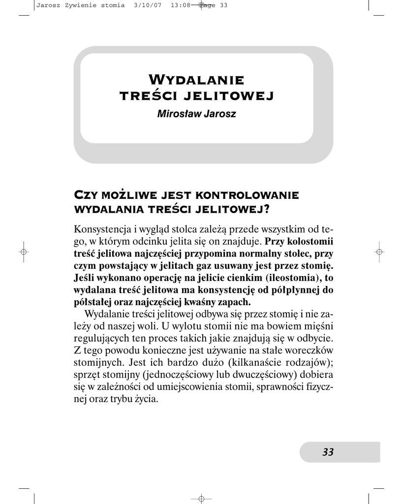 Jarosz Zywienie stomia 3/10/07 13:08 Page 33 Wydalanie treÊci jelitowej Miros∏aw Jarosz Czy mo˝liwe jest kontrolowanie wydalania treÊci jelitowej? Konsystencja i wyglàd stolca zale˝à przede wszystkim od tego, w którym odcinku jelita si´ on znajduje. Przy kolostomii treÊç jelitowa najcz´Êciej przypomina normalny stolec, przy czym powstajàcy w jelitach gaz usuwany jest przez stomi´. JeÊli wykonano operacj´ na jelicie cienkim (ileostomia), to wydalana treÊç jelitowa ma konsystencj´ od pó∏p∏ynnej do pó∏sta∏ej oraz najcz´Êciej kwaÊny zapach. Wydalanie treÊci jelitowej odbywa si´ przez stomi´ i nie zale˝y od naszej woli. U wylotu stomii nie ma bowiem mi´Êni regulujàcych ten proces takich jakie znajdujà si´ w odbycie. Z tego powodu konieczne jest u˝ywanie na sta∏e woreczków stomijnych. Jest ich bardzo du˝o (kilkanaÊcie rodzajów); sprz´t stomijny (jednocz´Êciowy lub dwucz´Êciowy) dobiera si´ w zale˝noÊci od umiejscowienia stomii, sprawnoÊci fizycznej oraz trybu ˝ycia. 33 Jarosz Zywienie stomia 3/10/07 13:08 Page 34 Czy mo˝liwe jest wp∏ywanie na cz´stotliwoÊç wydalania stolca? Czy sposób od˝ywiania odgrywa tu jakàÊ rol´? W przypadku kolostomii mo˝na w istotny sposób wp∏ynàç na cz´stotliwoÊç wydalania stolca, a tak˝e na jego obj´toÊç i konsystencj´. Poprawia to zdecydowanie komfort ˝ycia, zapobiegajàc niekontrolowanym wypró˝nieniom. Poza tym w okresie pomi´dzy wypró˝nieniami nie ma prawie ˝adnego wyp∏ywu treÊci jelitowej, co umo˝liwia stosowanie miniworeczków lub nawet tylko specjalnej zatyczki. Takie rozwiàzania pozwalajà na utrzymanie pe∏nej aktywnoÊci ˝yciowej. Osiàgni´cie tego celu jest mo˝liwe dzi´ki stosowaniu irygacji, uprawianiu gimnastyki mi´Êni brzucha oraz przestrzeganiu wskazówek dietetycznych. Irygacja Irygacja to metoda polegajàca na codziennym, wymuszonym oczyszczaniu jelit. Mo˝e byç wykonywana przez osoby z kolostomià – wytwarza odruch wydalania stolca o tej samej porze. Zabieg ten mo˝e byç przeprowadzany raz dziennie lub raz na 2 dni. Irygacja polega na bardzo wolnym wprowadzeniu przez otwór stomijny kilkuset mililitrów (przeci´tnie 600–1000 ml) letniej wody (o temperaturze do 30°C). Powtórzenie tej czynnoÊci o okreÊlonych porach dnia pozwala na wytworzenie odruchu regularnego wydalania treÊci ka∏owej. W celu przyspieszenia opró˝nienia jelita mo˝na wypiç szklank´ wody lub wykonaç delikatny masa˝ brzucha. Ca∏à procedur´ irygacji nale˝y wykonywaç zgodnie z instrukcjà, po przeçwiczeniu jej z piel´gniarkà stomijnà. 34 Jarosz Zywienie stomia 3/10/07 13:08 Page 35 Gimnastyka mi´Êni brzucha Mocne mi´Ênie brzucha u∏atwiajà wypró˝nienie, poniewa˝ lepiej dzia∏a tzw. t∏ocznia brzuszna. åwiczenia mi´Êni brzucha wymagajà systematycznoÊci. Aby osiàgnàç zamierzone efekty, powinno si´ je wykonywaç co najmniej 2 razy dziennie przez oko∏o 30 minut. Sà to çwiczenia izometryczne, polegajàce na napinaniu mi´Êni, bez wykonywania gwa∏townych ruchów. Wi´kszoÊç çwiczeƒ mi´Êni brzucha powinno byç poprzedzonych g∏´bokim wdechem przez nos. Podczas wykonywania çwiczenia wypuszcza si´ powietrze, liczàc do 6. Uwaga: po wykonaniu ka˝dego çwiczenia mi´Êni brzucha sk∏adajàcego si´ z 6 (rzadziej 3) powtórzeƒ, nale˝y wykonaç çwiczenie oddechowe. Liczàc do 3, wykonuje si´ wdech nosem, a liczàc dalej, od 4 do 6 – wydech. åwiczenie oddechowe nale˝y powtórzyç 6 razy i przejÊç do nast´pnego çwiczenia mi´Êni. åwiczenie mi´Êni brzucha 1. Le˝enie na plecach, nogi ugi´te, stopy na materacu. Na wdechu „wciàgni´cie” mi´Êni krocza z jednoczesnym napi´ciem mi´Êni brzucha i poÊladków. Wydychanie powietrza z odliczaniem do 6. 6 powtórzeƒ 2. Le˝enie na lewym boku, nogi ugi´te. Na wdechu „wciàgni´cie” mi´Êni krocza z jednoczesnym napi´ciem mi´Êni brzucha i poÊladków. Wydychanie powietrza z odliczaniem do 6. 6 powtórzeƒ 3. Le˝enie na prawym boku, nogi ugi´te. Na wdechu „wciàgni´cie” mi´Êni krocza z jednoczesnym napi´ciem 35 Jarosz Zywienie stomia 4. 5. 6. 7. 8. 36 3/10/07 13:08 Page 36 mi´Êni brzucha i poÊladków. Wydychanie powietrza z odliczaniem do 6. 6 powtórzeƒ Le˝enie na plecach, nogi ugi´te, stopy na materacu. Na wdechu uniesienie bioder z jednoczesnym „wciàgni´ciem” mi´Êni krocza, napi´ciem mi´Êni brzucha i poÊladków. Wydychanie powietrza z odliczaniem do 6. Powrót do pozycji wyjÊciowej – le˝enia na plecach. 6 powtórzeƒ Le˝enie na plecach, nogi ugi´te, stopy na materacu. Na wdechu uniesienie bioder z jednoczesnym „wciàgni´ciem” mi´Êni krocza, napi´ciem mi´Êni brzucha i poÊladków. Wydychanie powietrza z odliczaniem do 5. Na 6 odwiedzenie i ponowne z∏àczenie nóg (podczas wykonywania serii powtórzeƒ çwiczenia biodra ca∏y czas uniesione). 6 powtórzeƒ Siad skrzy˝ny, d∏onie na wewn´trznej stronie kolan. Na wdechu „wciàgni´cie” mi´Êni krocza z jednoczesnym napi´ciem mi´Êni brzucha i poÊladków. Podczas rozpychania d∏oƒmi kolan („mocowanie” si´ z kolanami) wydychanie powietrza z odliczaniem do 6. 6 powtórzeƒ Siad prosty. Swobodne oddychanie. Marsz na poÊladkach z odliczaniem do 10. 3 powtórzenia Le˝enie na plecach, nogi ugi´te w kolanach. Swobodne oddychanie. Przyciàgni´cie kolan do klatki piersiowej, uniesienie ràk równolegle do pod∏ogi i przyciàgni´cie brody do mostka. Wykonywanie rowerka z odliczaniem do 10. 3 powtórzenia Jarosz Zywienie stomia 3/10/07 13:08 Page 37 9. Siad na krzeÊle, d∏onie na wewn´trznej stronie kolan. Na wdechu „wciàgni´cie” mi´Êni krocza z jednoczesnym napi´ciem mi´Êni brzucha i poÊladków. Podczas rozpychania d∏oƒmi kolan („mocowanie” si´ z kolanami) wydychanie powietrza z odliczaniem do 6. 6 powtórzeƒ 10. Stanie obunó˝ przy stole z podparciem. Na wdechu wspi´cie na palce, „wciàgni´cie” mi´Êni krocza z jednoczesny