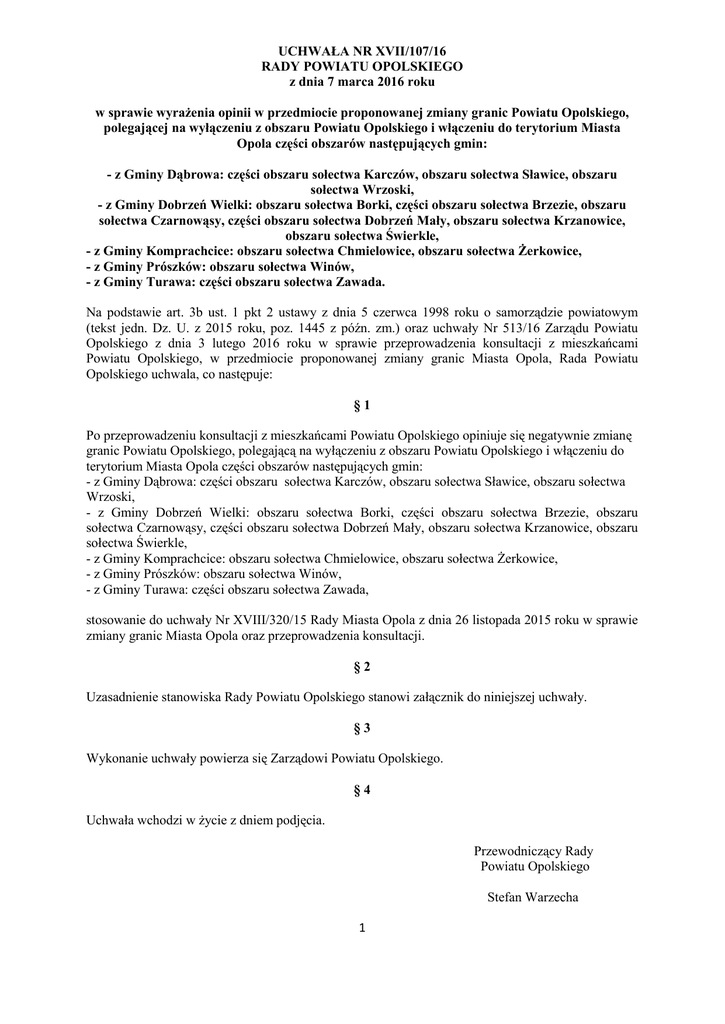 UCHWAŁA NR XVII/107/16 RADY POWIATU OPOLSKIEGO z dnia 7 marca 2016 roku w sprawie wyrażenia opinii w przedmiocie proponowanej zmiany granic Powiatu Opolskiego, polegającej na wyłączeniu z obszaru Powiatu Opolskiego i włączeniu do terytorium Miasta Opola części obszarów następujących gmin: - z Gminy Dąbrowa: części obszaru sołectwa Karczów, obszaru sołectwa Sławice, obszaru sołectwa Wrzoski, - z Gminy Dobrzeń Wielki: obszaru sołectwa Borki, części obszaru sołectwa Brzezie, obszaru sołectwa Czarnowąsy, części obszaru sołectwa Dobrzeń Mały, obszaru sołectwa Krzanowice, obszaru sołectwa Świerkle, - z Gminy Komprachcice: obszaru sołectwa Chmielowice, obszaru sołectwa Żerkowice, - z Gminy Prószków: obszaru sołectwa Winów, - z Gminy Turawa: części obszaru sołectwa Zawada. Na podstawie art. 3b ust. 1 pkt 2 ustawy z dnia 5 czerwca 1998 roku o samorządzie powiatowym (tekst jedn. Dz. U. z 2015 roku, poz. 1445 z późn. zm.) oraz uchwały Nr 513/16 Zarządu Powiatu Opolskiego z dnia 3 lutego 2016 roku w sprawie przeprowadzenia konsultacji z mieszkańcami Powiatu Opolskiego, w przedmiocie proponowanej zmiany granic Miasta Opola, Rada Powiatu Opolskiego uchwala, co następuje: §1 Po przeprowadzeniu konsultacji z mieszkańcami Powiatu Opolskiego opiniuje się negatywnie zmianę granic Powiatu Opolskiego, polegającą na wyłączeniu z obszaru Powiatu Opolskiego i włączeniu do terytorium Miasta Opola części obszarów następujących gmin: - z Gminy Dąbrowa: części obszaru sołectwa Karczów, obszaru sołectwa Sławice, obszaru sołectwa Wrzoski, - z Gminy Dobrzeń Wielki: obszaru sołectwa Borki, części obszaru sołectwa Brzezie, obszaru sołectwa Czarnowąsy, części obszaru sołectwa Dobrzeń Mały, obszaru sołectwa Krzanowice, obszaru sołectwa Świerkle, - z Gminy Komprachcice: obszaru sołectwa Chmielowice, obszaru sołectwa Żerkowice, - z Gminy Prószków: obszaru sołectwa Winów, - z Gminy Turawa: części obszaru sołectwa Zawada, stosowanie do uchwały Nr XVIII/320/15 Rady Miasta Opola z dnia 26 listopada 2015 roku w sprawie zmiany granic Miasta Opola oraz przeprowadzenia konsultacji. §2 Uzasadnienie stanowiska Rady Powiatu Opolskiego stanowi załącznik do niniejszej uchwały. §3 Wykonanie uchwały powierza się Zarządowi Powiatu Opolskiego. §4 Uchwała wchodzi w życie z dniem podjęcia. Przewodniczący Rady Powiatu Opolskiego Stefan Warzecha 1 Załącznik do Uchwały Nr XVII/107/16 Rady Powiatu Opolskiego z dnia 7 marca 2016 roku UZASADNIENIE do Uchwały Rady Powiatu Opolskiego w sprawie wyrażenia opinii dotyczącej wyłączenia z obszaru Powiatu Opolskiego i włączenia do terytorium Miasta Opola części obszarów następujących gmin: - z Gminy Dąbrowa: części obszaru sołectwa Karczów, obszaru sołectwa Sławice, obszaru sołectwa Wrzoski, - z Gminy Dobrzeń Wielki: obszaru sołectwa Borki, części obszaru sołectwa Brzezie, obszaru sołectwa Czarnowąsy, części obszaru sołectwa Dobrzeń Mały, obszaru sołectwa Krzanowice, obszaru sołectwa Świerkle, - z Gminy Komprachcice: obszaru sołectwa Chmielowice, obszaru sołectwa Żerkowice, - z Gminy Prószków: obszaru sołectwa Winów, - z Gminy Turawa: części obszaru sołectwa Zawada. Rada Powiatu Opolskiego opiniuje negatywnie wyłączenie z obszaru Powiatu Opolskiego i włączenie do terytorium Miasta Opola części obszarów następujących gmin: z Gminy Dąbrowa: części obszaru sołectwa Karczów, obszaru sołectwa Sławice, obszaru sołectwa Wrzoski; z Gminy Dobrzeń Wielki: obszaru sołectwa Borki, części obszaru sołectwa Brzezie, obszaru sołectwa Czarnowąsy, części obszaru sołectwa Dobrzeń Mały, obszaru sołectwa Krzanowice, obszaru sołectwa Świerkle; z Gminy Komprachcice: obszaru sołectwa Chmielowice, obszaru sołectwa Żerkowice; z Gminy Prószków: obszaru sołectwa Winów; z Gminy Turawa: części obszaru sołectwa Zawada. I. Wyniki konsultacji społecznych W związku z pismem Prezydenta Miasta Opola z dnia 8 grudnia 2015 roku nr OR-I.0110.12.2015 w sprawie podjęcia działań celem wyrażenia przez Radę Powiatu Opolskiego opinii w przedmiocie wyłączenia z obszaru Powiatu Opolskiego i włączenia do terytorium Miasta Opola części obszarów następujących gmin: z Gminy Dąbrowa: części obszaru sołectwa Karczów, obszaru sołectwa Sławice, obszaru sołectwa Wrzoski; z Gminy Dobrzeń Wielki: obszaru sołectwa Borki, części obszaru sołectwa Brzezie, obszaru sołectwa Czarnowąsy, części obszaru sołectwa Dobrzeń Mały, obszaru sołectwa Krzanowice, obszaru sołectwa Świerkle; z Gminy Komprachcice: obszaru sołectwa Chmielowice, obszaru sołectwa Żerkowice; z Gminy Prószków: obszaru sołectwa Winów; z Gminy Turawa: części obszaru sołectwa Zawada: a) w dniach od 10 do 20 lutego 2016 roku firma BIOSTAT sp. z o.o. z siedzibą w Rybniku, na zlecenie Starostwa Powiatowego w Opolu, przeprowadziła sondaż opinii mieszkańców Powiatu Opolskiego w sprawie wyłączenia z obszaru Powiatu Opolskiego i włączenia do terytorium Miasta Opola części obszarów następujących gmin: z Gminy Dąbrowa: części obszaru sołectwa Karczów, obszaru sołectwa Sławice, obszaru sołectwa Wrzoski; z Gminy Dobrzeń Wielki: obszaru sołectwa Borki, części obszaru sołectwa Brzezie, obszaru sołectwa Czarnowąsy, części obszaru sołectwa Dobrzeń Mały, obszaru sołectwa Krzanowice, obszaru sołectwa Świerkle; z Gminy Komprachcice: obszaru sołectwa Chmielowice, obszaru sołectwa Żerkowice; z Gminy Prószków: obszaru sołectwa Winów; z Gminy Turawa: części obszaru sołectwa Zawada. Konsultacje społeczne zostały przeprowadzone w formie badania sondażowego i polegały na przeprowadzeniu rozmowy poprzez łącze telefoniczne (technika CATI) z anonimowymi uczestnikami badania. W badaniu wzięło udział tysiąc dorosłych mieszkańców Powiatu Opolskiego, z czego 52% stanowiły kobiety, a 48% mężczyźni. Do badania ankietowanych dobra