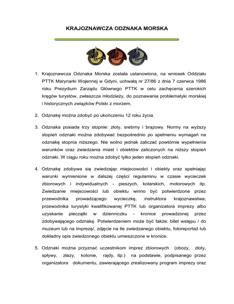 KRAJOZNAWCZA ODZNAKA MORSKA 1. Krajoznawcza Odznaka Morska została ustanowiona, na wniosek Oddziału PTTK Marynarki Wojennej w Gdyni, uchwałą nr 27/86 z dnia 7 czerwca 1986 roku Prezydium Zarządu Głównego PTTK w celu zachęcenia szerokich kręgów turystów, zwłaszcza młodzieży, do poznawania problematyki morskiej i historycznych związków Polski z morzem. 2. Odznakę można zdobyć po ukończeniu 12 roku życia. 3. Odznaka posiada trzy stopnie: złoty, srebrny i brązowy. Normy na wyższy stopień odznaki można zdobywać bezpośrednio po spełnieniu wymagań na odznakę stopnia niższego. Nie wolno jednak zaliczać powtórnie wypełnienia warunków oraz zwiedzania miast i obiektów zaliczonych na niższy stopień odznaki. W ciągu roku można zdobyć tylko jeden stopień odznaki. 4. Odznakę zdobywa się zwiedzając miejscowości i obiekty oraz spełniając warunki wymienione w dalszej części regulaminu w czasie wycieczek zbiorowych i indywidualnych - pieszych, kolarskich, motorowych itp. Zwiedzanie miejscowości lub obiektu winno być potwierdzone przez przewodnika prowadzącego wycieczkę, instruktora krajoznawstwa, przewodnika turystyki kwalifikowanej PTTK lub organizatora imprezy albo uzyskanie pieczątki w dzienniczku - kronice prowadzonej przez zdobywającego odznakę. Potwierdzeniem może być także: bilet wstępu / do muzeum lub na imprezę/, zdjęcie na tle zwiedzanego obiektu, fotoreportaż lub dokładny opis zwiedzonego obiektu umieszczone w kronice. 5. Odznaki można przyznać uczestnikom imprez zbiorowych spływy, złazy, kolonie, rajdy, itp.) (obozy, zloty, na podstawie, podpisanego przez organizatora dokumentu, zawierającego zrealizowany program imprezy oraz wykaz jej uczestników (jeśli realizując program uczestnicy spełnili warunki wymagane do przyznania odznaki. 6. Kolejność zwiedzanych miejscowości i obiektów oraz uczestnictwo w uroczystościach i imprezach o charakterze morskim jest dowolna. 7. Odznakę można zdobywać równolegle z innymi odznakami turystycznymi i krajoznawczymi. 8. W celu zdobycia Krajoznawczej Odznaki Morskiej należy: 1) w stopniu brązowym - zwiedzić 12 miejscowości i obiektów na terenie co najmniej jednego województwa nadmorskiego; 2) w stopniu srebrnym - zwiedzić 24 miejscowości i obiekty na terenie co najmniej dwóch województw nadmorskich, 3) w stopniu złotym - zwiedzić 48 miejscowości i obiekty na terenie trzech województw nadmorskich. 9. Nie wolno pominąć obiektów żadnej z czterech grup wymienionych w punkcie 11 regulaminu. Należy, poza tym wypełnić następujące warunki: 1) odbyć rejs statkiem pasażerskim, statkiem wycieczkowym (białej floty), jachtem, okrętem itp. (dla wszystkich stopni odznaki); 2) zwiedzić jedno z wymienionych: Gdańsk, Gdynia, Sopot, Elbląg, Hel, Darłowo, Kołobrzeg, Szczecin, Świnoujście (dla stopnia srebrnego i złotego); 3) wziąć udział jako uczestnik lub widz w jednej uroczystości z „ceremoniałem morskim”, organizowanych z okazji „Dnia Morza"; wizyt obcych statków w polskich portach; wodowania statku lub „chrzcie morskim", „neptunaliach" itp. (dla stopnia złotego). 10. Odznaki na podstawie przedłożonego do weryfikacji „Dzienniczka - kroniki" przyznają: 1) w stopniu złotym - Komisja Krajoznawcza Zarządu Oddziału PTTK Marynarki Wojennej w Gdyni oraz Regionalna Pracownia Krajoznawcza PTTK w Gdańsku; 2) w stopniu srebrnym i brązowym - Komisje Krajoznawcze Zarządów Oddziałów PTTK powiatów nadmorskich. 11. Wykaz grup oraz obiektów krajoznawczych: I grupa - Gospodarka morska i żegluga: 1) porty (handlowe, rybackie, wojenne, jachtowe), przystanie pasażerskie, handlowe i jachtowe, bazy kontenerowe i promowe np. Gdańsk, Gdynia, Sopot, Elbląg, Krynica Morska, Kołobrzeg, Darłowo, Hel, Łeba, Ustka, Puck, Jastarnia, Szczecin, Trzebież); 2) stocznie i zakłady produkujące dla gospodarki morskiej; 3) latarnie morskie (Krynica Morska, Gdańsk Port Północny, Gdańsk-Nowy Port, Hel, Szwedzka Góra, Jastarnia, Władysławowo, Rozewie, Stilo, Czołpino, Ustka, Jarosławiec, Darłowo, Gąski, Kołobrzeg, Niechorze, Kikut, Świnoujście); 4) statki, okręty (np. Dar Pomorza, Sołdek, ORP Błyskawica); 5) szkoły morskie, instytuty naukowe i badawcze np.: Akademia Morska i Akademia Marynarki Wojennej w Gdyni, Akademia Morska w Szczecinie, itp. II grupa - Historyczne związki polski z morzem: 1) dawne porty Rzeczpospolitej i historyczne porty Pomorza (Gdańsk port nad Motławą, Elbląg, Puck, Władysławowo, Ustka, Darłowo, Mrzeżyno, Kamień Pomorski, Wolin, Szczecin); 2) twierdze morskie i elementy fortyfikacji (np. Twierdza Wisłoujście, mury obronne, bramy wodne, bastiony Gdańska, zamek w Darłowie, zamek Książąt Pomorskich w Szczecinie, grodziska np. w Sopocie i inne fortyfikacje miast nadmorskich; 3) zabytkowe urządzenia portowe, spichrze, żurawie, bramy wodne; 4) zabytki architektury miast nadmorskich, np.: a) Gdańsk: Bazylika Mariacka, Muzeum Bursztynu w Katowni i Wieży Więziennej, Dwór Artusa, Dom Uphagena, Ratusz Starego Miasta, Muzeum Etnograficzne w Spichlerzu Opackim; b) Gdynia: śródmieście /dom A. Abrahama, budynki: ZUS na ul. 10 lutego 24, Banku Polskiego przy ul. 10 lutego 20, dom wójta Radtkego przy ul. 10 lutego 2, Dom Żeglarza Polskiego przy al. J.P II 3, Zespół Hal Targowych przy ul. Wójta Radtkego/, Oksywie /kościół p.w. M. Archanioła/; c) Sopot: Dworek Sierakowskich; d) Hel: zabudowa rybacka, kościół; e) Jastarnia: kościół, kapliczka świętej Rozalii; f) Puck: gotycki kościół parafialny, neogotycki ratusz; g) Darłowo: ratusz, Brama Kamienna, Kościół Mariacki, spichlerz i młyn wodny; h) Kołobrzeg: kościół gotycki, kolegiata gotycka, Baszta Prochowa; Akademia Rycerska, ratusz; i) Kamień Pomorski: katedra, Brama Wolińska; j) Nowe Warpno: ratusz; k) Wolin: kościół św. Mikołaja; l) Szczecin: bazylika archikatedralna, kościół św. Jana Ewangelisty, kościół św. Piotra i Paw