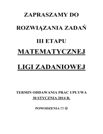 ZAPRASZAMY DO ROZWIĄZANIA ZADAŃ III ETAPU MATEMATYCZNEJ LIGI ZADANIOWEJ TERMIN ODDAWANIA PRAC UPŁYWA 30 STYCZNIA 2014 R. POWODZENIA !!! LIGA ZADANIOWA – KLASA IV ETAP III Zad. 1 Oblicz: 130 • (3642 - 3397) +156 : 2 = Zad. 2 Trzy maszynistki, pracując jednocześnie, przepisały 954 strony maszynopisu. Pierwsza pisała 16 stron dziennie, druga 18 stron, a trzecia 19. W ciągu ilu dni maszynistki skończyły pracę? Zad. 3 Pan Kowalski kupił 12 książek po 25 zł za sztukę i 28 długopisów po 700 groszy za sztukę. Ile zapłacił? Zad. 4 Wpisz brakujące liczby: …………… + 526 + 4894= 5420 529 - ……………= 891 -891 (28 + 357) • 6420 = ………… • 6420 + 357 • 6420 BOGNA KAŹMIERCZAK LIGA ZADANIOWA – KLASA V ETAP III Zad. 1 Narysuj romb, a następnie podziel go na 4 części tak, aby można było z nich ułożyć prostokąt, w którym jeden z boków jest 2 razy krótszy od przekątnej rombu. Zad. 2 11, 12, 13. Wskaż wśród tych liczb liczby pierwsze. Ile dzielników ma druga potęga wskazanych liczb pierwszych? Podaj te dzielniki. Zad. 3 Pani Marcinkowska w styczniu otrzymała premię 230zł, w lutym o 50 zł mniejszą, a w marcu 2 razy większą jak w lutym. Jaka była średnia premia pani Marcinkowskiej. Jaką łączna premię dostała pani Marcinkowska w okresie od stycznia do marca? Zad. 4 Czworokąt ma dwie pary równych kątów. Jeden z jego kątów jest o 30° większy od drugiego. Jakie miary mają kąty wewnętrzne tego czworokąta? IZABELA CZARNECKA LIGA ZADANIOWA - KLASA VI ETAP III Zad. 1 W najbliższym sklepie kartonik soku kosztuje 3,95 zł, a na giełdzie towarowej 3,5 zł. Ile co najmniej kartoników soku trzeba kupić, aby opłaciło się pojechać na giełdę, jeżeli bilet tramwajowy w obie strony kosztuje 4,80 zł? Zad. 2 Lodówka ma wymiary podstawy 60 cm x 6 dm i wysokość 1,5 m. Ile cm2 podłogi zajmuje lodówka? Jaką objętość ma lodówka? Oblicz objętość wnętrza lodówki. Ścianki mają grubość 3,5 cm, a drzwi 13 cm. Zad. 3 Długość przekątnej AC rombu jest równa 12 cm, a przekątna BD jest równa 2 przekątnej AC. Oblicz pole rombu ABCD. 3 Zad. 4 Rower Karola kosztował 2200 zł. Adam kupił rower po cenie promocyjnej i zapłaciło 12 % mniej niż Karol. Ile zapłacił Adam za swój rower? O ile więcej za swój rower zapłacił Karol niż Adam? ALINA FOJUTOWSKA LIGA ZADANIOWA – KLASA I ETAP III Zad. 1 W trójkątach równoramiennych ABC i DEF podstawy AB i DE mają tę samą długość 6 cm, a miary kątów wynoszą odpowiednio |CAB| = 50° i |DFE| = 80°. Czy trójkąty ABC i DEF są przystające? Odpowiedź uzasadnij. Zad. 2 W trójkątach równoramiennych KLM i RST podstawy KL i RS mają tę samą długość 5 cm, a miary kątów wynoszą odpowiednio |MKL| = 80° i |RTS| = 20°. Czy trójkąty KLM i RST są przystające? Odpowiedź uzasadnij. Zad. 3 Wykorzystując wybraną cechę przystawania trójkątów, uzasadnij, że długości przekątnych w trapezie równoramiennym są równe Zad. 4 Oblicz długość średnicy koła, którego pole jest równe 1,44 dm2. JOLANTA NIKLAS LIGA ZADANIOWA – KLASA III ETAP III Zad. 1 Dach wieży ma kształt ostrosłupa prawidłowego sześciokątnego. Oblicz pole powierzchni dachu, wiedząc, że bok podstawy dachu ma długość 8 3 m, a wysokość dachu jest równa 16m. Ile m2 blachy potrzeba na pokrycie tego dachu, jeżeli na zakładki należy doliczyć 5% powierzchni dachu? Zad. 2 Dla jakiej wartości parametru a pierwiastek równania 2(x+a) = a+1 jest większy od ½. Zad. 3 Oblicz pole równoległoboku, którego dłuższa przekątna ma długość 10cm i dzieli kąt ostry równoległoboku na kąty 450 i 300. Zad. 4 Oblicz pole pierścienia wyznaczonego przez okrąg wpisany i okrąg opisany na trójkącie równobocznym o boku 3 cm. JOLANTA JĄDER