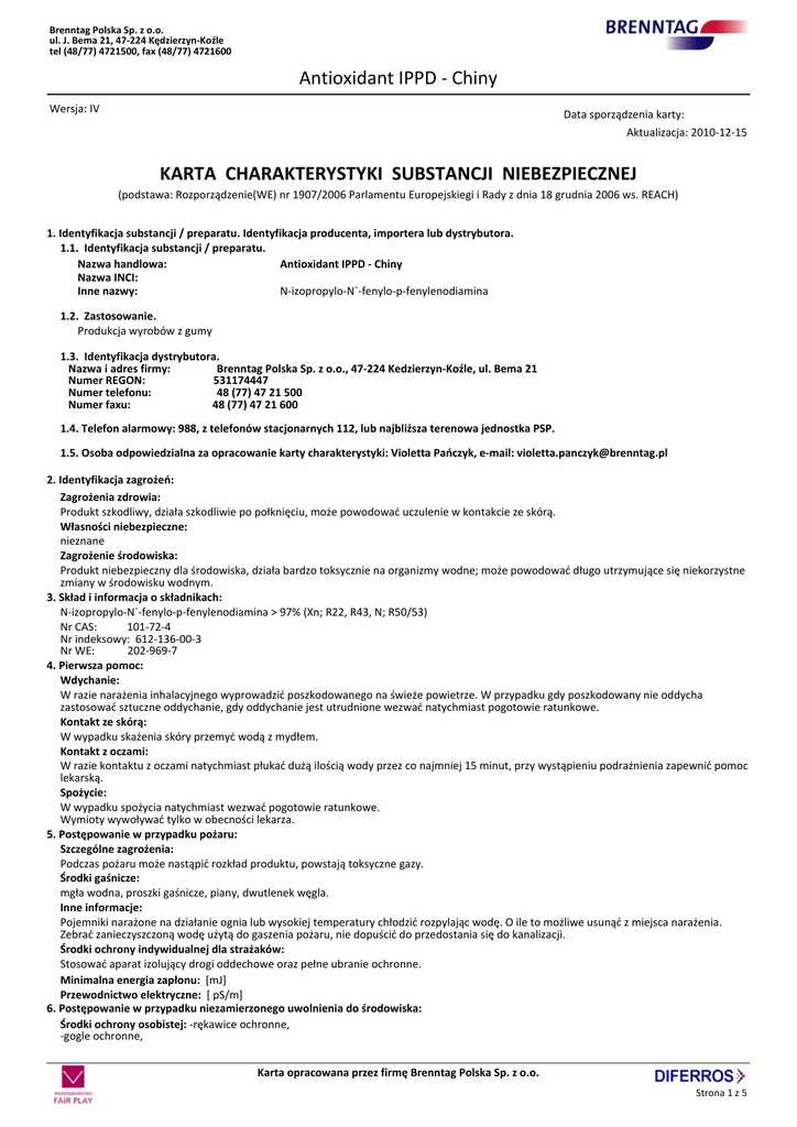 Brenntag Polska Sp. z o.o. ul. J. Bema 21, 47-224 Kędzierzyn-Koźle tel (48/77) 4721500, fax (48/77) 4721600 Antioxidant IPPD - Chiny Wersja: IV Data sporządzenia karty: __________ Aktualizacja: 2010-12-15 KARTA CHARAKTERYSTYKI SUBSTANCJI NIEBEZPIECZNEJ (podstawa: Rozporządzenie(WE) nr 1907/2006 Parlamentu Europejskiegi i Rady z dnia 18 grudnia 2006 ws. REACH) 1. Identyfikacja substancji / preparatu. Identyfikacja producenta, importera lub dystrybutora. 1.1. Identyfikacja substancji / preparatu. Nazwa handlowa: Antioxidant IPPD - Chiny Nazwa INCI: Inne nazwy: N-izopropylo-N`-fenylo-p-fenylenodiamina 1.2. Zastosowanie. Produkcja wyrobów z gumy 1.3. Identyfikacja dystrybutora. Nazwa i adres firmy: Brenntag Polska Sp. z o.o., 47-224 Kedzierzyn-Koźle, ul. Bema 21 Numer REGON: 531174447 Numer telefonu: 48 (77) 47 21 500 Numer faxu: 48 (77) 47 21 600 1.4. Telefon alarmowy: 988, z telefonów stacjonarnych 112, lub najbliższa terenowa jednostka PSP. 1.5. Osoba odpowiedzialna za opracowanie karty charakterystyki: Violetta Pańczyk, e-mail: [email protected] 2. Identyfikacja zagrożeń: Zagrożenia zdrowia: Produkt szkodliwy, działa szkodliwie po połknięciu, może powodować uczulenie w kontakcie ze skórą. Własności niebezpieczne: nieznane Zagrożenie środowiska: Produkt niebezpieczny dla środowiska, działa bardzo toksycznie na organizmy wodne; może powodować długo utrzymujące się niekorzystne zmiany w środowisku wodnym. 3. Skład i informacja o składnikach: N-izopropylo-N`-fenylo-p-fenylenodiamina > 97% (Xn; R22, R43, N; R50/53) Nr CAS: 101-72-4 Nr indeksowy: 612-136-00-3 Nr WE: 202-969-7 4. Pierwsza pomoc: Wdychanie: W razie narażenia inhalacyjnego wyprowadzić poszkodowanego na świeże powietrze. W przypadku gdy poszkodowany nie oddycha zastosować sztuczne oddychanie, gdy oddychanie jest utrudnione wezwać natychmiast pogotowie ratunkowe. Kontakt ze skórą: W wypadku skażenia skóry przemyć wodą z mydłem. Kontakt z oczami: W razie kontaktu z oczami natychmiast płukać dużą ilością wody przez co najmniej 15 minut, przy wystąpieniu podrażnienia zapewnić pomoc lekarską. Spożycie: W wypadku spożycia natychmiast wezwać pogotowie ratunkowe. Wymioty wywoływać tylko w obecności lekarza. 5. Postępowanie w przypadku pożaru: Szczególne zagrożenia: Podczas pożaru może nastąpić rozkład produktu, powstają toksyczne gazy. Środki gaśnicze: mgła wodna, proszki gaśnicze, piany, dwutlenek węgla. Inne informacje: Pojemniki narażone na działanie ognia lub wysokiej temperatury chłodzić rozpylając wodę. O ile to możliwe usunąć z miejsca narażenia. Zebrać zanieczyszczoną wodę użytą do gaszenia pożaru, nie dopuścić do przedostania się do kanalizacji. Środki ochrony indywidualnej dla strażaków: Stosować aparat izolujący drogi oddechowe oraz pełne ubranie ochronne. Minimalna energia zapłonu: [mJ] Przewodnictwo elektryczne: [ pS/m] 6. Postępowanie w przypadku niezamierzonego uwolnienia do środowiska: Środki ochrony osobistej: -rękawice ochronne, -gogle ochronne, Karta opracowana przez firmę Brenntag Polska Sp. z o.o. Strona 1 z 5 Brenntag Polska Sp. z o.o. ul. J. Bema 21, 47-224 Kędzierzyn-Koźle tel (48/77) 4721500, fax (48/77) 4721600 Antioxidant IPPD - Chiny -ubranie robocze. Postępowanie przy wycieku lub wysypie substancji: Zapobiec rozprzestrzenianiu się lub dostaniu do kanalizacji, rowów, rzek; unikać rozpylania produktu w powietrzu, nie wdychać pyłu; zabezpieczyć uszkodzone opakowania; rozsypany produkt zebrać mechanicznie do zamykanego pojemnika i przekazać do zniszczenia. 7. Postępowanie z substancją / preparatem i magazynowanie: Magazynowanie: Przechowywać w suchym i chłodnym, dobrze wentylowanym pomieszczeniu w szczelnie zamkniętych opakowaniach. Zabezpieczyć przed bezpośrednim nasłonecznieniem, przechowywać z dala od silnych utleniaczy. Nie stawiać pojemników jeden na drugim. Postępowanie z substancją lub preparatem: Unikać wdychania pyłu/oparów. Unikać kontaktu z oczami, skórą oraz ubraniem. Podczas transportu unikać silnego wstrząsania. 8. Kontrola narażenia i środki ochrony indywidualnej: Stosowane środki ochrony osobistej powinny spełniać wymogi Rozporządzenia Ministra Gospodarki z dnia 21 grudnia 2005 r. w sprawie zasadniczych wymagań dla środków ochrony indywidualnej (Dz.U. Nr 259, poz. 2173). Ochrona dróg oddechowych: przy niewystarczającej wentylacji stosować środki ochrony dróg oddechowych Ochrona oczu: gogle ochronne Ochrona rąk: rękawice ochronne odporne na chemikalia Techniczne środki ochronne: wentylacja wyciągowa w miejscu pracy Inne wyposażenie ochronne: ubranie robocze Kontrola zagrożenia: NDS, NDSCh - nie oznaczono (wg Rozporządzenia MPiPS z dn. 29 listopada 2002 ; Dz.U. Nr 217, poz. 1833 z późniejszymi zmianami)) Zalecenia dotyczące procedury monitoringu zawartości składników niebezpiecznych w powietrzu – metodyka pomiarów: -Rozporządzenie Ministra Zdrowia z dnia 20 kwietnia 2005 r. w sprawie badań i pomiarów czynników szkodliwych dla zdrowia w środowisku pracy (Dz.U. Nr 73, poz.645) -PN-89/Z-01001/06. Ochrona czystości powietrza. Nazwy, określenia i jednostki. Terminologia dotycząca badań jakości powietrza na stanowiskach pracy. -PN Z-04008-7:2002. Ochrona czystości powietrza. Pobieranie próbek. Zasady pobierania próbek powietrza w środowisku pracy i interpretacja wyników. -PN-EN-689: 2002. Powietrze na stanowiskach pracy – wytyczne oceny narażenia inhalacyjnego na czynniki chemiczne przez porównanie z wartościami dopuszczalnymi i strategia pomiarowa. Uwaga: Gdy stężenie substancji jest ustalone i znane, doboru środków ochrony indywidualnej należy dokonywać z uwzględnieniem stężenia substancji występującego na danym stanowisku pracy, czasu ekspozycji oraz czynności wykonywanych przez pracownika. W sytuacji awaryjnej, jeżeli stężenie substancji na stanowisku pracy nie jest znane, stosować środki ochrony in