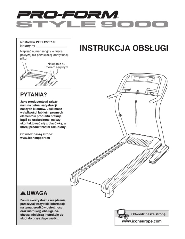 Nr Modelu PETL12707.0 Nr seryjny Napisać numer seryjny w linijce powyżej dla późniejszej identyfikacji pliku. INSTRUKCJA OBSŁUGI Nalepka z numerem seryjnym PYTANIA? Jako producentowi zależy nam na pełnej satysfakcji naszych klientów. Jeśli masz wątpliwości lub jeśli pewnych elementów produktu brakuje bądź są uszkodzone, należy skontaktować się z placówką, w której produkt został zakupiony. Odwiedź naszą stronę: www.iconsupport.eu UWAGA Zanim skorzystasz z urządzenia, przeczytaj wszystkie informacje na temat środków ostrożności oraz instrukcję obsługi. Zachowaj niniejszą instrukcję obsługi do przyszłego użytku. Odwiedź naszą stronę www.iconeurope.com SPIS TREŚCI UMIESZCZANIE NAKLEJEK OSTRZEGAWCZYCH . . . . . . . . . . . . . . . . . . . . . . . . . . . . . . . . . . . . . . . . . . . . . . .2 WAŻNE ŚRODKI OSTROŻNOŚCI . . . . . . . . . . . . . . . . . . . . . . . . . . . . . . . . . . . . . . . . . . . . . . . . . . . . . . . . . . . .3 PRZED ROZPOCZĘCIEM . . . . . . . . . . . . . . . . . . . . . . . . . . . . . . . . . . . . . . . . . . . . . . . . . . . . . . . . . . . . . . . . . . .5 MONTAŻ . . . . . . . . . . . . . . . . . . . . . . . . . . . . . . . . . . . . . . . . . . . . . . . . . . . . . . . . . . . . . . . . . . . . . . . . . . . . . . . .6 OBSŁUGA I REGULACJA . . . . . . . . . . . . . . . . . . . . . . . . . . . . . . . . . . . . . . . . . . . . . . . . . . . . . . . . . . . . . . . . . .13 JAK SKŁADAĆ I PRZENOSIĆ BIEŻNIĘ . . . . . . . . . . . . . . . . . . . . . . . . . . . . . . . . . . . . . . . . . . . . . . . . . . . . . . .20 ROZWIĄZYWANIE PROBLEMÓW . . . . . . . . . . . . . . . . . . . . . . . . . . . . . . . . . . . . . . . . . . . . . . . . . . . . . . . . . . .22 ZASADY PROWADZENIA ĆWICZEŃ . . . . . . . . . . . . . . . . . . . . . . . . . . . . . . . . . . . . . . . . . . . . . . . . . . . . . . . . .24 LISTA CZĘŚCI . . . . . . . . . . . . . . . . . . . . . . . . . . . . . . . . . . . . . . . . . . . . . . . . . . . . . . . . . . . . . . . . . . . . . . . . . . .26 RYSUNEK ROZŁOŻONEJ BIEŻNl . . . . . . . . . . . . . . . . . . . . . . . . . . . . . . . . . . . . . . . . . . . . . . . . . . . . . . . . . . . .28 ZAMAWIANIE CZĘŚCI ZAMIENNYCH . . . . . . . . . . . . . . . . . . . . . . . . . . . . . . . . . . . . . . . . . . . . . . .Tylna okładka INFORMACJE NA TEMAT RECYKLINGU . . . . . . . . . . . . . . . . . . . . . . . . . . . . . . . . . . . . . . . . . . . . .Tylna okładka UMIESZCZANIE NAKLEJEK OSTRZEGAWCZYCH English: Hungarian Pokazane tutaj naklejki ostrzegawcze zostały umieszczone we wskazanych miejscach. Jeśli naklejki brak lub jest nieczytelna, proszę zadzwonić pod numer telefonu podany na pierwszej stronie okładki niniejszego podręcznika i poprosić o darmową naklejkę zamienną. Umieścić naklejkę w pokazanym miejscu. Uwaga: Naklejki mogą być pokazane w zmienionej skali. Russian 252912 Polish Portuguese PROFORM jest zarejestrowanym znakiem towarowym firmy ICON IP, Inc. 2 Polish Portuguese WAŻNE ŚRODKI OSTROŻNOŚCI OSTRZEŻENIE: Aby zminimalizować ryzyko poważnych obrażeń, należy przeczytać o wszystkich ważnych środkach ostrożności oraz instrukcje niniejszego podręcznika jak też wszystkie ostrzeżenia umieszczone na Twojej bieżni przed użyciem bieżni. ICON nie ponosi odpowiedzialności za obrażenia ciała lub straty majątkowe spowodowane przez produkt lub przez jego użycie. 1. Przed rozpoczęciem jakiegokolwiek programu ćwiczeń skonsultuj się z lekarzem. Jest to szczególnie ważne dla osób powyżej 35 roku życia lub z historią problemów zdrowotnych. 11. Kabel zasilający (patrz strona 13) należy podłączyć do obwodu uziemionego. Do tego samego obwodu nie wolno podłączać innych urządzeń. 12. Jeśli potrzebny jest przedłużacz, należy stosować tylko przewód z uziemieniem, 1mm2 (średnica 14) nie dłuższy niż 1,5 metra (5 stóp). 2. Na właścicielu bieżni spoczywa obowiązek poinformowania wszystkich użytkowników tej bieżni o ostrzeżeniach i środkach ostrożności. 13. Należy trzymać kabel zasilający z dala od nagrzanych powierzchni. 3. Używaj bieżni wyąącznie w sposób opisany poniżej. 14. Nigdy nie poruszaj pasem, kiedy zasilanie bieżni jest odłączone. Nie używaj bieżni, jeśli kabel zasilający lub wtyczka są uszkodzone lub jeśli bieżnia działa nieprawidłowo. (Jeśli bieżnia nie działa prawidłowo patrz: ROZWIĄZYWANIE PROBLEMÓW na stronie 22). 4. Umieść bieżnię na równej powierzchni zachowując przynajmniej 2,4 m wolnego miejsca za nią i 0,6 m po bokach. Nie umieszczaj bieżni w miejscu, gdzie blokowane są otwory wentylacyjne. W celu uniknięcia uszkodzenia podłogi lub dywanu, pod bieżnią umieść matę. 15. Przed użyciem bieżni należy przeczytać, zrozumieć i przetestować procedurę zatrzymywania awaryjnego (zobacz JAK WŁĄCZYĆ ZASILANIE na stronie 15). 5. Trzymaj bieżnię w pomieszczeniu, z dala od kurzu i wilgoci. Nie umieszczaj bieżni w garażu, zadaszonym patio czy w pobliżu wody. 16. Nigdy nie uruchamiaj bieżni stojąc na pasie. W czasie korzystania z bieżni zawsze trzymaj się poręczy. 6. Nie używaj bieżni w pomieszczeniach, gdzie stosuje się produkty w aerozolu lub tlen. 7. Nie dopuszczaj do kontaktu z bieżnią dzieci w wieku poniżej 12 lat i zwierząt domowych. 17. Bieżnia może osiągać duże prędkości. Zmieniaj prędkość stopniowo, aby uniknąć szarpnięć. 8. Z bieżni mogą korzystać osoby o masie do 130 kg. 18. Nigdy nie zostawiaj pracującej bieżni bez nadzoru. Zawsze wyjmuj kluczyk i przewód zasilania z gniazdka, kiedy bieżnia nie jest używana. 9. Na bieżni może przebywać tylko jedna osoba. 10. W czasie korzystania z bieżni, należy mieć na sobie odpowiednie ubranie sportowe. Nie należy wkładać luźnych ubrań, które mogłyby wkręcić się w mechanizm bieżni. Sportowe ubrania zaleca się zarówno dla kobiet, jak i mężczyzn. Zawsze należy mieć 