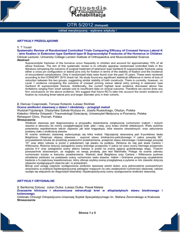 OTR 5/2012 (listopad) /układ merytoryczny - wybrane artykuły / ARTYKUŁY PRZEGLĄDOWE 1. T Yousri Systematic Review of Randomized Controlled Trials Comparing Efficacy of Crossed Versus Lateral K - wire fixation in Extension type Gartland type III Supracondylar Fractures of the Humerus in Children Clinical Lecturer, University College London Institute of Orthopaedics and Musculoskeletal Science Abstract Supracondylar fractures of the humerus occur frequently in children and account for approximately 70% of all elbow fractures. The aim of this systematic review is to critically appraise randomized controlled trials in the literature comparing the outcome of surgical treatment of extension type Gartland III supracondylar fractures using either a cross pin configuration or lateral pins only for fixation in terms of the stability of fixation and the incidence of encountered complications. Only 4 randomized trials were found over the past 10 years. These were reviewed according to the CONSORT 2010 check list. No study found any significant statistical difference in terms of loss of reduction between the two groups, suggesting similar stability of both constructs. There is currently, however, no Level 1 evidence comparing the outcome of crossed pinning versus lateral entry pinning in extension type Gartland III supracondylar fracture. Additionally, the current highest level evidence discussed above has limitations ranging from small sample size to insufficient data on clinical outcome. Therefore we cannot draw any firm conclusions on the above evidence. We suggest that future RCTs take into account the recent evidence on fixation by including three lateral pins and larger diameter pins in their cohorts. 2. Dariusz Czaprowski, Tomasz Kotwicki, Łukasz Stoliński Ocena wiotkości stawowej u dzieci i młodzieży – przegląd metod Wydział Fizjoterapii, Olsztyńska Szkoła Wyższa im. Józefa Rusieckiego, Olsztyn, Polska Katedra i Klinika Ortopedii i Traumatologii Dziecięcej, Uniwersytet Medyczny w Poznaniu, Polska Rehasport Clinic, Poznań, Polska Streszczenie Wiotkość stawowa jest diagnozowana w przypadku stwierdzenia zwiększonej ruchomości małych i dużych stawów w stosunku do normy uwzględniającej wiek, płeć i rasę, przy braku chorób układowych. Wielu autorów potwierdza współistnienie takich objawów jak bóle kręgosłupa, bóle stawów obwodowych, oraz zaburzenia postawy ciała z wiotkością stawów. W ocenie wiotkości stawowej wykorzystuje się kilka metod. Najczęściej stosowaną jest 9-punktowa skala Beightona. Obejmuje objawy stawowe - wyprost stawu śródręczno-paliczkowego V palca powyżej 90°, przywiedzenie kciuka do przedniej powierzchni przedramienia, przeprost stawu łokciowego i kolanowego powyżej 10° oraz skłon tułowia w przód z położeniem rąk płasko na podłożu. Zbliżona do niej jest skala Cartera i Wilkinsona. Różnica dotyczy zastąpienia oceny biernego przeprostu V palca na rzecz oceny biernego przeprostu palców II-V oraz zastąpienia oceny skłonu tułowia w przód na oceną zgięcia grzbietowego stopy. Trzecim powszechnie stosowanym, ze względu na swoją prostotę, jest test Marshalla. Polega na ocenie zakresu ruchomości kciuka w kierunku przedramienia. Wartość skali Beightona oraz Cartera i Wilkinsona podnosi określenie wiotkości na podstawie oceny ruchomości wielu stawów. Hakim i Grahame proponują uzupełnienie badania o 5-częściowy kwestionariusz, który oferuje szybką ocenę przeglądową a pytania w nim zawarte dotyczą objawów występujących obecnie jak i w przeszłości. Biorąc pod uwagę częstość występowania wiotkości stawowej wśród dzieci, przy jednocześnie powszechnym stosowaniu w praktyce fizjoterapeutycznej zabiegów mających na celu zwiększenie ruchomości stawowej, celowe wydaje się włączenie do diagnostyki lekarskiej i fizjoterapeutycznej oceny występowania wiotkości stawowej. ARTYKUŁY ORYGINALNE 3. Bartłomiej Dobosz Julian Dutka Łukasz Dutka Paweł Maleta Znaczenie kliniczne i ekonomiczne retransfuzji krwi w alloplastykach stawu biodrowego i kolanowego. Oddziału Chirurgii Ortopedyczno-Urazowej Szpital Specjalistycznego im. Stefana Żeromskiego w Krakowie Streszczenie Strona 1 z 5 OTR 5/2012 (listopad) /układ merytoryczny - wybrane artykuły / Wzrastające zapotrzebowanie na preparaty krwi zmusza do racjonalnej gospodarki i oszczędzania krwi w dużych operacjach ortopedycznych. Celem badania jest ocena możliwości oszczędzania krwi poprzez zastosowanie retransfuzji w endoprotezoplastykach stawu biodrowego i kolanowego i wynikających z tego korzyści ekonomicznych. Materiał i metody Badanie miało charakter prospektywny, kohortowy i było oparte na dwóch grupach pacjentów. Grupę I stanowiło 50 pacjentów, u których wykonano retransfuzję krwi oraz dodatkowo, w niektórych przypadkach uzupełniano ubytek allogennym KKCz. Grupę II – kontrolną, stanowiło 50 pacjentów, którym przetaczano wyłącznie allogenne KKCz. Zastosowanie retransfuzji pozwoliło odzyskać w grupie I po alloplastyce biodra średnio 364,5 ml (± 52,7) krwi, a po alloplastyce kolana 403,8 ml (± 110,7) krwi. Wykazano że w grupie Iw porównaniu do grupy II zapotrzebowanie na dodatkowe przetoczenia KKCz w przypadku alloplastyki biodra było mniejszeo 45%, a w alloplastyce kolana było mniejsze o 42%. Krew odzyskana do retransfuzji posiada dużą wartość biologiczną ze względu na istotną zawartość elementów morfotycznych, hemoglobiny oraz obecność własnego osocza. W ocenie ekonomicznej oszczędność w grupie I stanowiła około 5000 PLN. Metoda retransfuzji krwi z drenażu pooperacyjnego jest prosta, bezpieczna i daje istotne korzyści kliniczne i ekonomiczne. 4. I Ibrahim A novel method of diagnosing autonomic dysfunction in Carpal tunnel syndrome: measuring skin capacitance University College London Institute of Orthopaedics and Musculoskeletal Science, Royal National Orthopaedic Hospital, Sta