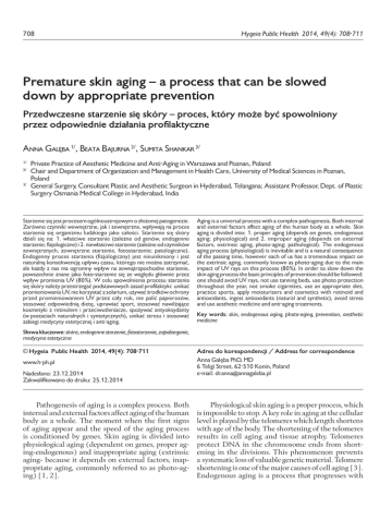 Hygeia Public Health 2014, 49(4): 708-711 708 Premature skin aging – a process that can be slowed down by appropriate prevention Przedwczesne starzenie się skóry – proces, który może być spowolniony przez odpowiednie działania profilaktyczne Anna Galęba 1/, Beata Bajurna 2/, Sumita Shankar 3/ Private Practice of Aesthetic Medicine and Anti-Aging in Warszawa and Poznan, Poland Chair and Department of Organization and Management in Health Care, University of Medical Sciences in Poznan, Poland 3/ General Surgery, Consultant Plastic and Aesthetic Surgeon in Hyderabad, Telangana; Assistant Professor, Dept. of Plastic Surgery Osmania Medical College in Hyderabad, India 1/ 2/ Starzenie się jest procesem ogólnoustrojowym o złożonej patogenezie. Zarówno czynniki wewnętrzne, jak i zewnętrzne, wpływają na proces starzenia się organizmu ludzkiego jako całości. Starzenie się skóry dzieli się na: 1. właściwe starzenie (zależne od genów, endogenne starzenie; fizjologiczne) i 2. niewłaściwe starzenie (zależne od czynników zewnętrznych, zewnętrzne starzenie, fotostarzenie; patologiczne). Endogenny proces starzenia (fizjologiczny) jest nieunikniony i jest naturalną konsekwencją upływu czasu, którego nie można zatrzymać, ale każdy z nas ma ogromny wpływ na zewnątrzpochodne starzenie, powszechnie znane jako foto-starzenie się ze względu głównie przez wpływ promienia UV (80%). W celu spowolnienia procesu starzenia się skóry należy przestrzegać podstawowych zasad profilaktyki: unikać promieniowania UV, nie korzystać z solarium, używać środków ochrony przed promieniowaniem UV przez cały rok, nie palić papierosów, stosować odpowiednią dietę, uprawiać sport, stosować nawilżające kosmetyki z retinolem i przeciwutleniacze, spożywać antyoksydanty (w postaciach naturalnych i syntetycznych), unikać stresu i stosować zabiegi medycyny estetycznej i anti-aging. Aging is a universal process with a complex pathogenesis. Both internal and external factors affect aging of the human body as a whole. Skin aging is divided into: 1. proper aging (depends on genes, endogenous aging; physiological) and 2. improper aging (depends on external factors, extrinsic aging, photo-aging; pathological). The endogenous aging process (physiological) is inevitable and is a natural consequence of the passing time, however each of us has a tremendous impact on the extrinsic aging, commonly known as photo-aging due to the main impact of UV rays on this process (80%). In order to slow down the skin aging process the basic principles of prevention should be followed: one should avoid UV rays, not use tanning beds, use photo protection throughout the year, not smoke cigarettes, use an appropriate diet, practice sports, apply moisturizers and cosmetics with retinoid and antioxidants, ingest antioxidants (natural and synthetic), avoid stress and use aesthetic medicine and anti-aging treatments. Key words: skin, endogenous aging, photo-aging, prevention, aesthetic medicine Słowa kluczowe: skóra, endogenne starzenie, fotostarzenie, zapobieganie, medycyna estetyczna © Hygeia Public Health 2014, 49(4): 708-711 Adres do korespondencji / Address for correspondence www.h-ph.pl Anna Galęba PhD, MD 6 Teligi Street, 62-510 Konin, Poland e-mail: [email protected] Nadesłano: 23.12.2014 Zakwalifikowano do druku: 25.12.2014 Pathogenesis of aging is a complex process. Both internal and external factors affect aging of the human body as a whole. The moment when the first signs of aging appear and the speed of the aging process is conditioned by genes. Skin aging is divided into physiological aging (dependent on genes, proper aging-endogenous) and inappropriate aging (extrinsic aging- because it depends on external factors, inappropriate aging, commonly referred to as photo-aging) [1, 2]. Physiological skin aging is a proper process, which is impossible to stop. A key role in aging at the cellular level is played by the telomeres which length shortens with age of the body. The shortening of the telomeres results in cell aging and tissue atrophy. Telomeres protect DNA in the chromosome ends from shortening in the divisions. This phenomenon prevents a systematic loss of valuable genetic material. Telomere shortening is one of the major causes of cell aging [3]. Endogenous aging is a process that progresses with Galęba A, et al. Premature skin aging – a process that can be slowed down by appropriate prevention time, during which there occur unavoidable changes. However, the appearance of the skin is definitely better and healthier than during the improper aging. In the course of endogenous aging, facial skin is smooth and without any discoloration, with slightly sharpened facial mimic lines, however with a retained geometry. The skin which is about the same age but with no overt exposure to UV rays will always look younger and healthier than the skin subjected to photo-aging processes [4]. The extrinsic aging, which is improper, is always a premature process, independent of genes and affecting mainly the skin. This is a process which can be slowed down by adequate prevention [2]. The speed of aging is affected by many external factors such as climate, work, poor nutrition, smoking, drugs, alcohol and even excessive amounts of coffee, but the most significant is the exposure to UV rays. These factors above all contribute to 80% of skin aging of the face and other exposed body parts (such as the neckline, arms, neck, hands) [4-6]. Among the skin changes, apparent as a result of long-term exposure to UV rays, we can mention: a disorder of keratinization, pigmental changes, vascular changes, dry skin, wrinkles or furrows [1, 2]. In women the aging of skin is additionally dependent on menopause [7, 8] or hormonal factors, related to the disappearance of ovarian functions. During this process there is a decrease in the secretion of estrogen (to be exact 17 beta-estradiol), which contributes to c