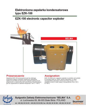 Elektroniczna zapalarka kondensatorowa typu EZK-100 EZK-100 electronic capacitor exploder BELMA Przeznaczenie Assignation Zapalarka EZK-100 przeznaczona jest do zdalnego inicjowania zap³onu zespo³ów zapalczych zapalników elektrycznych ERG lub górniczych zespo³ów elektrycznych po³¹czonych w elektryczn¹ sieæ wybuchow¹. Przystosowana jest do u¿ytkowania w zakresie temperatur -30°C ÷ +50°C. EZK-100 electronic capacitor exploder is portable unit suitable to remotely ignite an „ERG” electric detonators, or other mining/military detonators which form firing circuits. It is adapted to work in wide range of temperatures, from -30°C to +50°C. Bydgoskie Zak³ady Elektromechaniczne “BELMA” S.A. ul. £ochowska 69, 86-005 Bia³e B³ota POLAND tel. +48 (52) 36 36 201, +48 (52) 36 36 250; fax +48 (52) 36 36 203, +48 (52) 36 36 247 Dane techniczne sygnalizacja osi¹gniêcia gotowoœci wybuchowej zapalarki fire readiness indicator Technical data sygnalizacja sprawnoœci elektrycznej sieci wybuchowej firing circuit continuity indicator sygnalizacja ³adowania charging progress indicator masa wymiary zasilanie napiêcie wyjœciowe max -0,55 kg -102 x 155 x 36 mm -3 V -1250 V* *- napiêcie zale¿ne od temperatury pracy maksymalny czas osi¹gniêcia przez zapalarkê pe³nej gotowoœci wybuchowej - 8 s. maksymalne opornoœci sieci wybuchowej - dla 100 zapalników po³¹czonych szeregowo - 500 W, posiada: -obudowê zabezpieczaj¹c¹ przed przypadkowym odpaleniem sieci wybuchowej pod³¹czonej do zapalarki, -system samo-roz³adowania, -wskaŸnik sygnalizacji sprawnoœci elektrycznej sieci wybuchowej, -wskaŸnik sygnalizacji osi¹gniêcia gotowoœci wybuchowej zapalarki, -zaciski umo¿liwiaj¹ce proste i szybkie pod³¹czenie przewodów strza³owych. ukompletowanie: -zapalarka EZK-100, -dwie baterie typu LR14, -pokrowiec umo¿liwiaj¹cy mocowanie urz¹dzenia do oporz¹dzenia strzelaj¹cego zabezpieczaj¹cy przed przypadkowym wypadniêciem lub pozyskaniem przez osoby trzecie podczas wykonywania czynnoœci s³u¿bowych, -dwie magistrale z przewodem dwu¿y³owym (o d³ugoœci 100 m ka¿da). weight dimensions power supply charging voltage max -0,55 kg -102 x 155 x 36 mm -3 V -1250 V* *- depends on operating temperature maximum charging time - 8 s. maximum resistance, for electric detonators - for 100 detonators in series - 500 W, equipped with: -construction, preventing unintended firing, -self-discharge system, -firing circuit continuity indicator, -fire readiness indicator, -proper slots allowing simple and realiable connection of firing line wires. complete set consists of: -EZK-100 exploder, -2xLR14 batteries, -leather cover easy to anchor to waist belt, during on business activities, preventing unpredictable drops and third party to interfere, -two firing lines winded around the reels, 100 m long each. Dzia³anie Operation Po w³o¿eniu baterii i pod³¹czeniu zapalarki do obwodu elektrycznego, sygnalizowana jest ci¹g³oœæ linii strza³owej. Gromadzenie energii zdolnej do pobudzenia zapalników nastêpuje od momentu wciœniêcia przycisku „£” (³adowanie). Maksymalny czas osi¹gniêcia gotowoœci strza³owej zapalarki wynosi 8 sekund. Odpalenie zapalników dokonuje siê poprzez wciœniêcie przycisku „W”. Gotowoœæ strza³owa po zwolnieniu przycisku ³adowania wynosi 35 sekund. The continuity of firing circuit is indicated at once after batteries are in and wires are conected to proper slots signed as „Z”. Generation and accumulation of required energy occur while „£” button is pressed. Charging time amount to maximum 8 seconds. To fire, the „W” button must be pressed. Fire readiness - 35 sec after „£” button is released. Bydgoskie Zak³ady Elektromechaniczne “BELMA” S.A.