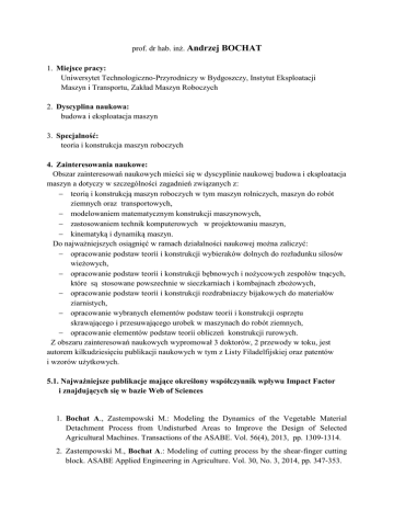 prof. dr hab. inż. Andrzej BOCHAT 1. Miejsce pracy: Uniwersytet Technologiczno-Przyrodniczy w Bydgoszczy, Instytut Eksploatacji Maszyn i Transportu, Zakład Maszyn Roboczych 2. Dyscyplina naukowa: budowa i eksploatacja maszyn 3. Specjalność: teoria i konstrukcja maszyn roboczych 4. Zainteresowania naukowe: Obszar zainteresowań naukowych mieści się w dyscyplinie naukowej budowa i eksploatacja maszyn a dotyczy w szczególności zagadnień związanych z: teorią i konstrukcją maszyn roboczych w tym maszyn rolniczych, maszyn do robót ziemnych oraz transportowych, modelowaniem matematycznym konstrukcji maszynowych, zastosowaniem technik komputerowych w projektowaniu maszyn, kinematyką i dynamiką maszyn. Do najważniejszych osiągnięć w ramach działalności naukowej można zaliczyć: opracowanie podstaw teorii i konstrukcji wybieraków dolnych do rozładunku silosów wieżowych, opracowanie podstaw teorii i konstrukcji bębnowych i nożycowych zespołów tnących, które są stosowane powszechnie w sieczkarniach i kombajnach zbożowych, opracowanie podstaw teorii i konstrukcji rozdrabniaczy bijakowych do materiałów ziarnistych, opracowanie wybranych elementów podstaw teorii i konstrukcji osprzętu skrawającego i przesuwającego urobek w maszynach do robót ziemnych, opracowanie elementów podstaw teorii obliczeń konstrukcji rurowych. Z obszaru zainteresowań naukowych wypromował 3 doktorów, 2 przewody w toku, jest autorem kilkudziesięciu publikacji naukowych w tym z Listy Filadelfijskiej oraz patentów i wzorów użytkowych. 5.1. Najważniejsze publikacje mające określony współczynnik wpływu Impact Factor i znajdujących się w bazie Web of Sciences 1. Bochat A., Zastempowski M.: Modeling the Dynamics of the Vegetable Material Detachment Process from Undisturbed Areas to Improve the Design of Selected Agricultural Machines. Transactions of the ASABE. Vol. 56(4), 2013, pp. 1309-1314. 2. Zastempowski M., Bochat A.: Modeling of cutting process by the shear-finger cutting block. ASABE Applied Engineering in Agriculture. Vol. 30, No. 3, 2014, pp. 347-353. 3. Zastempowski M., Bochat A.: Mathematical model ling of elastic deflection of a tubular cross-section. Polish Maritime Research No.2 (86), Vol. 22, 2015, pp. 93-100. 4. Bochat A., Wesołowski L., Zastempowski M.: A comparative study of new and traditional design of hammer mill. Transactions of the ASABE. Vol 58(3), 2015, pp. 110. 5.2. Najważniejsze artykuły opublikowane w czasopismach znajdujących się, w wykazie MNiSzW 1. Bochat A., Błaszczyk M.: Stalk elastic strain modeling applying mathematical approach. Journal of Research and Applications in Agricultural Engineering, Vol.52(1), 2007, s. 21-26. 2. Bochat A.: Modelling of the separating proces sof fibrous vegetable material. Journal of Research and Applications in Agricultural Engineering. Vol.47 (4), 2003. s. 5–9. 3. Bochat A.: Identyfication of quasi-static cutting force of triticale-straws for designing use scissor and finger cutting sets. Journal of Polish CIMAC. Vol. 4, No. 3, 2009, s. 17–22. 4. Bochat A., Zastempowski M.: Selected simulation analysis for use designing of shearfinger cutting sections. Journal of Research and Applications in Agricultural Engineering. Vol. 56(1), 2011, s. 6-10. 5. Bochat A., Zastempowski M.: Modeling of the cutting process by means of drum-type cutting system. Journal of POLISH CIMAC Vol. 6, No3, s. 9-14. 6. Bochat A., Zastempowski M.: Kinematics of drum movement of the cutting of a straw cutter. Journal of Polish CIMAC, Volume 7, No 3, 2012, s.11-16. 7. Zastempowski M., Bochat A.: Selected aspects of the designing an energy efficient constructions of scissor-finger cutting unit. Journal of Research and Applications in Agricultural Engineering Vol. 57 (4), 2012, s. 212-216. 8. Bochat A., Zastempowski M.: Modeling the process of cutting with drum cutting unit. Journal of Research and Applications in Agricultural Engineering 2/2013. 9. Zastempowski M., Bochat A.: Impact of the operating parameters a drum cutting unit on unevenness of chaff,s length. Journal of Research and Applications in Agricultural Engineering 2/2013. 5.3. Uzyskane patenty 1. Bochat A.: Bębnowy zespół tnący. Wzór użytkowy W. 115202 z dnia 26.06.2007 r. Urząd Patentowy RP. 2. Zastempowski M., Bochat A.: Nożycowo-palcowy zespół tnący do maszyn żniwnych. Wzór użytkowy W. 120954 z dnia 23.04.2014 r. Urząd Patentowy RP. 3. Zastempowski M., Bochat A.: Nożycowo-palcowy zespół tnący do maszyn żniwnych. Wzór użytkowy, prawo ochronne nr 67617 z dnia 11.02.2015 r. 5.4. Publikacje książkowe i monografie 1. Praca zbiorowa-monografia pod redakcją Prof. J. Flizikowskiego (Bieliński M., Bochat A., Bogusz M., Chwarścianek F., Flizikowski J., Jankowska M., Kalwaj J., Mroziński A.): Maszyny środowiska rolno-spożywczego. Wyd. ATR w Bydgoszczy, Bydgoszcz, 2002, ss. 240. 2. Maszyny i narzędzia rolnicze. Praca zbiorowa po redakcją E. Jarmocika (współautorzy: Bochat A., Borowski S., Dulcet E., Kaszkowiak J., Ziętara W.). Wydawnictwo Uczelniane UTP, Bydgoszcz, 2006, s.1-277. 3. Bochat A. (współautor) książki: Zarys inżynierii systemów bioagrotechnicznych, Część 3. Modelowanie, pod redakcją prof. Leszka Powierży. Politechnika Warszawska, Warszawa, 2007, s. 41-59. 4. Bochat A.: Teoria i konstrukcja zespołów tnących maszyn rolniczych. Monografia. Wyd. Uniwersytetu Technologiczno-Przyrodniczego w Bydgoszczy, Bydgoszcz, 2010, ss. 98.