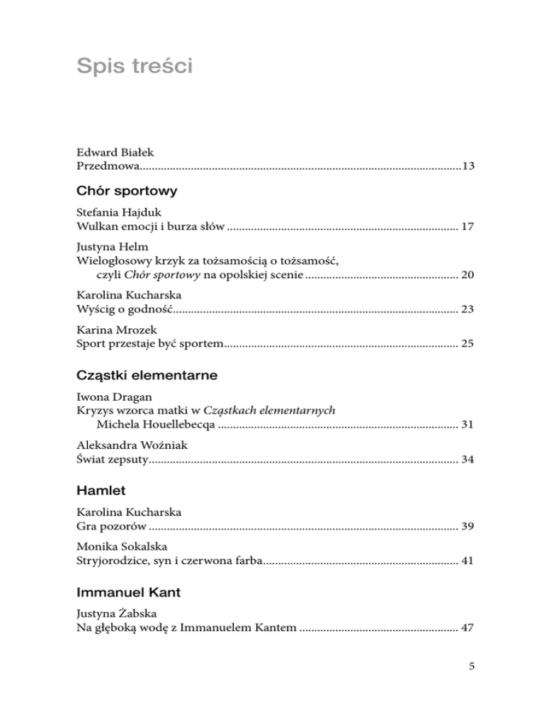 Spis treści Edward Białek Przedmowa...........................................................................................................13 Chór sportowy Stefania Hajduk Wulkan emocji i burza słów ............................................................................. 17 Justyna Helm Wielogłosowy krzyk za tożsamością o tożsamość, czyli Chór sportowy na opolskiej scenie ................................................... 20 Karolina Kucharska Wyścig o godność............................................................................................... 23 Karina Mrozek Sport przestaje być sportem.............................................................................. 25 Cząstki elementarne Iwona Dragan Kryzys wzorca matki w Cząstkach elementarnych Michela Houellebecqa ................................................................................ 31 Aleksandra Woźniak Świat zepsuty....................................................................................................... 34 Hamlet Karolina Kucharska Gra pozorów ....................................................................................................... 39 Monika Sokalska Stryjorodzice, syn i czerwona farba................................................................. 41 Immanuel Kant Justyna Żabska Na głęboką wodę z Immanuelem Kantem ..................................................... 47 5 Iwona, księżniczka Burgunda Klaudia Wojtyczka Totalitarny Kopciuszek ...................................................................................... 55 Jedem das Seine – eine Volksoperette (Każdemu podług zasług – operetka ludowa) Konrad Bizoń Śmierć, sztuka, życie .......................................................................................... 59 Kamienie na szaniec – zakazane piosenki Arkadiusz Gacka Miłość w obliczu okrucieństwa wojny ............................................................ 65 Kaspar Natalia Bartczak Uzależnienie słowem ......................................................................................... 71 Malwina Nastaj „Jak można mówieniem doprowadzić kogoś do mówienia”, czyli Kaspar na deskach Teatru Współczesnego ..................................... 73 Kazimierz i Karolina Nicolas Antochewicz Matrix zagrany na scenie .................................................................................. 79 Elżbieta Barabosz Czy jeszcze rozumiemy, czym dla nas powinna być miłość?....................... 82 Natalia Bukartyk Kazimierz i Karolina, czyli miłość w centrum handlowym ......................... 85 Katarzyna Ciszewska Miszmasz na scenie............................................................................................ 88 Aleksandra Cymerman Każdy inteligent jest pesymistą ........................................................................ 91 Iwona Dragan Mijając się obojętnie... ....................................................................................... 97 Jędrzej Dul Powierzchowna miłość ...................................................................................... 99 6 Katarzyna Frala Kazimierz i Karolina, czyli o kryzysie naszych czasów ............................... 102 Stefania Hajduk Lody, krzyż i trupy ........................................................................................... 105 Justyna Helm Kazimierz i Karolina, czyli galeria handlowa z miłością w tle ................... 108 Anna Jankowska Być czy mieć? – awans społeczny czy wierność wartościom? ................... 111 Marika Kaczmarek Schadzki w centrum handlowym .................................................................. 114 Małgorzata Kapuśniak Konsumpcyjna miłość, czyli nic nowego w XXI wieku ............................. 117 Ewa Kawka O słabościach więzi międzyludzkich............................................................. 120 Olga Kicińska Kazimierz i Karolina, czyli miłość w czasach popkultury .......................... 123 Monika Konefon Kalka współczesnej rzeczywistości ................................................................ 126 Ewa Kowalska W świecie egoistów .......................................................................................... 129 Aleksandra Krawczyk Miłość czy jej udawanie? ................................................................................. 133 Anna Kudyba Miejsce spotkań, miejsce doznań .................................................................. 136 Katarzyna Kulisz Zaślepienie ........................................................................................................ 139 Małgorzata Mikołajek Pusty konsumpcjonizm versus powierzchowna religijność ...................... 142 Malwina Nastaj Walka o tożsamość narodową czy przeciwko niej? – Kazimierz i Karolina w Teatrze Polskim ............................................. 144 Angelika Pieścik Bo w dzisiejszych czasach nie chodzi o miłość, tylko o pieniądze, czyli Kazimierz i Karolina w reżyserii Jana Klaty.................................. 147 7 Damian Samborski Bo jak się okazuje, miłość też może być towarem ....................................... 151 Monika Sokalska „Każdy inteligentny człowiek jest pesymistą” .............................................. 154 Piotr Stronciwilk Kazimierz i Karolina, czyli o jednostce miażdżonej przez (z pozoru) finansowe zawirowania............................................... 157 Marta Szczepańska Słodycz otoczki i gorzki smak wnętrza człowieka zagubionego między miłością a pieniędzmi ....................... 161 Iwona Szturemska Poturbowana piramida wartości .................................................................... 164 Joanna Ufniak Galeria handlowa – symbol lepszego świata ................................................ 166 Milena Wdowiak To nie ludzie są źli ...............................................
