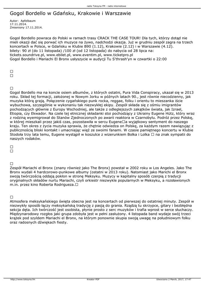 radio Toksyna FM - radio internetowe Gogol Bordello w Gdańsku, Krakowie i Warszawie Autor: Apfelbaum 17.11.2014. Zmieniony 17.11.2014. Gogol Bordello powraca do Polski w ramach trasy CRACK THE CASE TOUR! Dla tych, którzy dotąd nie mieli okazji dać się porwać ich muzyce na żywo, nadchodzi okazja. Już w grudniu zespół zagra na trzech koncertach w Polsce, w Gdańsku w Klubie B90 (1.12), Krakowie (2.12) i w Warszawie (4.12). bilety: 90 zł (do 11 listopada) /100 zł (od 12 listopada) do nabycia od 28 lipca na: tickets.soundrive.pl, www.ebilet.pl, www.eventim.pl, www.ticketpro.pl Gogol Bordello i Mariachi El Bronx usłyszycie w audycji Tu S'thrash'yn w czwartki o 22:00 Gogol Bordello ma na koncie osiem albumów, z których ostatni, Pura Vida Conspiracy, ukazał się w 2013 roku. Skład tej formacji, założonej w Nowym Jorku w późnych latach 90., jest równie niecodzienny, jak muzyka którą grają. Połączenie cygańskiego punk rocka, reggae, folku i orientu to mieszanka iście wybuchowa, szczególnie w wykonaniu tak niezwykłej ekipy. Zespół składa się z ośmiu imigrantów pochodzących głównie z Europy Wschodniej, ale także z odleglejszych zakątków świata, jak Izrael, Etiopia, czy Ekwador. Na czele tej etnicznej składanki stoi pochodzący z Ukrainy Eugene Hütz, który wraz z rodziną wyemigrował do Stanów Zjednoczonych po awarii reaktora w Czarnobylu. Podróż przez Polskę, w której mieszkali przez jakiś czas, pozostawiła w sercu Eugenea wyjątkowy sentyment do naszego kraju. Ten okres z życia muzyka sprawia, że chętnie odwiedza on Polskę, za każdym razem nawiązując z publicznością bliski kontakt i umacniając więź ze swoimi fanami. W czasie pamiętnego koncertu w Klubie Stodoła trzy lata temu, Eugene wystąpił w koszulce z wizerunkiem Bolka i Lolka na znak sympatii do naszych rodaków. Zespół Mariachi el Bronx (znany również jako The Bronx) powstał w 2002 roku w Los Angeles. Jako The Bronx wydali 4 hardcorowo-punkowe albumy (ostatni w 2013 roku). Natomiast jako Marichi el Bronx swoją twórczością oddają pokłon w stronę Meksyku. Muzycy w kapitalny sposób czerpią z tradycji oryginalnych składów nurtu Mariachi, czyli orkiestr niezwykle popularnych w Meksyku, a rozsławionych m.in. przez kino Roberta Rodrigueza. Atmosfera meksykańskiego święta obecna jest na koncertach od pierwszej do ostatniej minuty. Zespół w niezwykły sposób łączy meksykańską tradycję z pasją do grania. Rządzą tu skrzypce, gitary i bezbłędna sekcja dęta. Ich twórczość jest osobista, płynie prosto z serc muzyków i trafia wprost w serce słuchaczy. Międzynarodowy rozgłos jaki grupa zdobyła jest w pełni zasłużony. 4 listopada band wydaje swój trzeci krążek pod szyldem Mariachi el Bronx, na którym ponownie skupia swoją uwagę na południowym folku oraz radosnych dźwiękach fiesty. http://www.toksyna.fm Kreator PDF Utworzono 2 March, 2017, 17:47