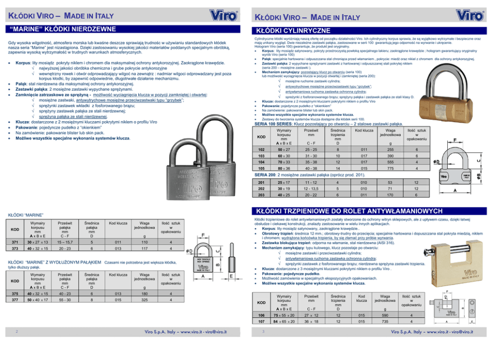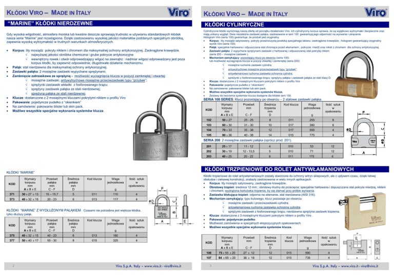 KŁÓDKI VIRO – MADE IN ITALY KŁÓDKI VIRO – MADE IN ITALY “MARINE” KŁÓDKI NIERDZEWNE KŁÓDKI CYLINRYCZNE Gdy wysoka wilgotność, atmosfera morska lub kwaśne deszcze sprawiają trudnośc w używianiu standardowych kłódek nasza seria “Marine” jest nizastąpiona. Dzięki zastosowaniu wysokiej jakości materiałów poddanych specjalnym obróbką, zapewnia wysoką wytrzymałość w trudnych warunkach atmosferycznych. Korpus: lity mosiądz pokryty niklem i chromem dla maksymalnej ochrony antykorozyjnej. Zaokrąglone krawędzie. najwyższej jakości obróbka chemiczna i grube pokrycie antykorozyjne wewnętrzny rowek i otwór odprowadzający wilgoć na zewnątrz : nadmiar wilgoci odprowadzany jest poza korpus kłodki, by zapewnić odpowiednie, długotrwałe działanie mechanizmu. Pałąk: stal nierdzewna dla maksymalnej ochrony antykorozyjnej. Zastawki pałąka: 2 mosiężne zastawki wypychane sprężynami. Zamknięcie zatrzaskowe ze sprężyną - możliwość wyciagnięcia klucza w pozycji zamkniętej i otwartej: mosiężne zastwaki, antywytrychowe mosiężne przeciwzastwaki typu “grzybek”; sprężynki zastawek wkładki z fosforowanego brązu; sprężyny zastawek pałąka ze stali nierdzewnej; sprężyna pałąka ze stali nierdzewnej. Klucze: dostarczone z 2 mosiężnymi kluczami pokrytymi niklem o profilu Viro Pakowanie: pojedyncze pudełko z “okienkiem” Na zamówienie: pakowanie blister lub skin pack. Możliwe wszystkie specjalne wykonania systemów klucza. Cylindryczne kłódki wyróżniają naszą ofertę od początku działalności Viro. Ich cylindryczny korpus sprawia, że są wyjątkowo wytrzymałe i bezpieczne oraz mają unikany wygląd. Dwie niezależne zastawki pałąka, zastosowane w serii 100 gwarantują jego odporność na wyrwanie i ukręcenie. Hologram Viro (seria 100) gwarantuje, że produkt jest oryginalny. Korpus: lity mosiądz satynowany, pokryty przeźroczystą powłoką specjalnego lakieru; zaokrąglone krawędzie ; hologram gwarantujący oryginalny wyrób Viro (seria 100) Pałąk: specjalnie hartowana i odpuszczana stal chroniąca przed włamaniem , pokrycie: miedź oraz nikiel z chromem dla ochrony antykorozyjnej. Zastawki pałąka: 2 wypychane sprężynami zastawki z hartowanej i odpuszczanej stali pokrytej niklem (seria 200 – mosiężne zastawki ). Mechanizm zamykający: pozostający klucz po otwarciu (seria 100) lub możliwość wyciągnięcia klucza w pozycji otwartej i zamkniętej (seria 200): mosiężne ruchome zastawki cylindra; antywytrychowe mosiężne przeciwzastawki typu “grzybek”; antywłamaniowa ruchoma zastawka ochronna cylindra; spreżynki z fosforanowanego brązu; sprężyny pałąka i zastawek pałąka ze stali klasy D. Klucze: dostarczone z 2 mosiężnymi kluczami pokrytymi niklem o profilu Viro Pakowanie: pojedyncze pudełko z “okienkiem” Na zamówienie: pakowanie blister lub skin pack. Możliwe wszystkie specjalne wykonania systemów klucza. Zestawy do tworzenia systemów klucza dostępne dla kłódek serii 100. SERIA 100 SERIES: Klucz pozostający po otwarciu – 2 stalowe zastawki pałąka. Wymairy korpusu mm AxBxE Prześwit mm Kod klucza C-F Średnica trzpienia mm D 102 50 X 27 25 - 25 8 011 255 6 103 60 X 30 31 - 30 10 017 390 6 104 70 X 33 35 - 38 12 017 555 4 105 80 X 36 40 - 38 14 015 775 4 53 12 KOD Waga jednostkowa Ilość sztuk w opakowaniu g SERIA 200: 2 mosiężne zastawki pałąka (oprócz prod. 201). Wymairy korpusu mm AxBxE Prześwit pałąka mm C-F Średnica pałąka mm D Kod klucza Waga jednostkowa Ilość sztuk w opakowaniu g 371 30 X 27 X 13 15 – 15,7 5 011 110 4 373 40 X 32 X 15 20 - 23 6 013 117 4 KŁÓDKI “MARINE” Z WYDŁUŻONYM PAŁĄKIEM Czasami nie potrzebna jest większa kłódka, tylko dłuższy pałąk. KOD Wymairy korpusu mm AxBxE Prześwit pałąka mm C-F Średnica pałąka mm D Kod klucza Waga jednostkowa Ilość sztuk w opakowaniu g 375 40 X 32 X 15 40 - 23 6 013 180 4 377 50 X 40 X 17 55 - 30 8 015 325 4 2 25 X 17 11 - 12 4 010 202 30 X 19 12 - 13,5 5 010 71 12 203 40 X 25 20 - 22 6 011 170 6 KŁÓDKI TRZPIENIOWE DO ROLET ANTYWŁAMANIOWYCH KŁÓDKI “MARINE” KOD 201 Kłódki trzpieniowe do rolet antywłamaniowych zostały stworzone do ochrony witryn sklepowych, ale z upływem czasu, dzięki łatwej obsłudze i ciekawej konstrukcji, znalazły zastosowanie w wielu innych aplikacjach. Korpus: lity mosiądz satynowany, zaokrąglone krawędzie.. Obrotowy trzpień: średnica 12 mm.; obrotowy-trudny do przecięcia; specjalnie hartowana i dopuszczana stal pokryta miedzią, niklem i chromem; wydrążona końcówka trzpienia, by się złamać przy próbie wyrwania. Zastawka blokująca trzpień: odporna na włamanie, stal nierdzewna (AISI 316). Mechanizm zamykający: typu kulowego, klucz pozostaje po otwarciu: mosiężne zastawki i przeciwzastawki cylindra; antywłamaniowa ruchoma zastawka ochronna cylindra; sprężynki zastawek z fosforowanego brązu; nierdzewna sprężyna zastawki trzpienia. Klucze: dostarczone z 3 mosiężnymi kluczami pokrytymi niklem o profilu Viro . Pakowanie: pojedyncze pudełko. Możliwość zamówienia w specjalnych ekspozycyjnych opakowaniach. Możliwe wszystkie specjalne wykonania systemów klucza. KOD Wymairy korpusu mm AxBxE Prześwit mm C-F Średnica trzpienia mm D Kod klucza Waga jednostkowa Ilość sztuk w opakowaniu g 106 75 X 55 X 20 27 X 12 12 015 590 4 107 84 X 20 36 X 18 12 015 735 4 3 X 65 KŁÓDKI VIRO – MADE IN ITALY KŁÓDKI VIRO – MADE IN ITALY KŁÓDKI MOSIĘŻNE PAŁĄKOWE PANZER - KŁÓDKI ANTYWŁAMANIOWE Korpus: jeden kawałek odlewanego, litego mosiądzu pokryty stalową obudową. Główna obudowa : grubość 3 mm ( produkty 4116, 4117 4126), 2,5 mm ( produkty 4115, 4125), hartowana i odpuszczana stal pokryta miedzią oraz niklem i chromem. Obudowa boczna: grubość 1,5 mm ( produkty 4116, 4117, 4126), 1 mm (produkty 4115, 4125), hartowana i odpuszczana stal pokryta miedzią oraz niklem i chromem. Zabezpieczona wkładka: 7 zastawek 