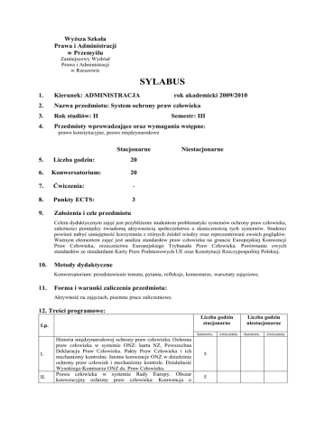 WyŜsza Szkoła Prawa i Administracji w Przemyślu Zamiejscowy Wydział Prawa i Administracji w Rzeszowie SYLABUS 1. Kierunek: ADMINISTRACJA rok akademicki 2009/2010 2. Nazwa przedmiotu: System ochrony praw człowieka 3. Rok studiów: II 4. Przedmioty wprowadzające oraz wymagania wstępne: Semestr: III prawo konstytucyjne, prawo międzynarodowe Stacjonarne 5. Liczba godzin: 20 6. Konwersatorium: 20 7. Ćwiczenia: - 8. Punkty ECTS: 3 9. ZałoŜenia i cele przedmiotu Niestacjonarne Celem dydaktycznym zajęć jest przybliŜenie studentom problematyki systemów ochrony praw człowieka, zaleŜności pomiędzy świadomą aktywnością społeczeństwa a skutecznością tych systemów. Studenci powinni nabyć umiejętność korzystania z róŜnych źródeł wiedzy oraz reprezentowani swoich poglądów. WaŜnym elementem zajęć jest analiza standardów praw człowieka na gruncie Europejskiej Konwencji Praw Człowieka, orzecznictwa Europejskiego Trybunału Praw Człowieka. Porównanie owych standardów ze standardami Karty Praw Podstawowych UE oraz Konstytucji Rzeczypospolitej Polskiej. 10. Metody dydaktyczne Konwersatorium: przedstawienie tematu, pytania, refleksje, komentarze, warsztaty zajęciowe. 11. Forma i warunki zaliczenia przedmiotu: Aktywność na zajęciach, pisemne prace zaliczeniowe. 12. Treści programowe: Liczba godzin stacjonarne Lp. konwers. I. II. Historia międzynarodowej ochrony praw człowieka. Ochrona praw człowieka w systemie ONZ: karta NZ, Powszechna Deklaracja Praw Człowieka. Pakty Praw Człowieka i ich mechanizmy kontrolne. Istotne konwencje ONZ w dziedzinie ochrony praw człowiek i mechanizmy kontrole. Działalność Wysokiego Komisarza ONZ ds. Praw Człowieka. Prawa człowieka w systemie Rady Europy. Obszar konwencyjny ochrony praw człowieka: Konwencja o 5 5 ćwiczenia Liczba godzin niestacjonarne konwers. ćwiczenia III. IV. 12. Ochronie Praw Człowieka i Podstawowych Wolności i protokoły dodatkowe, Europejska Karta Społeczna, Konwencja o zapobieganiu Torturom oraz Nieludzkiemu lub PoniŜającemu Traktowaniu albo Karaniu, Konwencja Ramowa o Ochronie Mniejszości Narodowych. Mechanizm kontrolny EKPC i jego modyfikacje. Europejski Trybunał Praw Człowieka. Znaczenie orzecznictwa ETPC. Mechanizmy kontrolne pozostałego obszaru konwencyjnego. System ochrony praw człowieka w Unii Europejskiej. Postanowienia Traktatu o Unii Europejskiej dotyczące respektowania praw człowieka. Ochrona sądowa Europejskiego Trybunału Praw Człowieka. Karta Praw Podstawowych UE. Rzecznik Praw Obywatelskich UE. Prawa człowieka w krajowym systemie prawnym. Działalność Rzecznika Praw Obywatelskich i Trybunału Konstytucyjnego. Rola organizacji pozarządowych. 5 5 Literatura podstawowa: Banaszak B. System ochrony praw człowieka, Kraków 2005 Hołda J., Z. Hołda, D. Ostrowska, J. A. Rybczyńska, Prawa człowieka. Zarys wykładu, Warszawa 2008. R. Kuźniar, Prawa człowieka – prawa, instytucje, stosunki międzynarodowe, Warszawa 2006. 13. Literatura uzupełniająca: Kuźniar R., Prawa człowieka, Warszawa 2004. Łopatka A., Międzynarodowe prawo praw człowieka, Warszawa 1998. Malinowska L., Prawa człowieka i ich ochrona międzynarodowa, Warszawa 2004. Motyka K., Prawa człowieka. Wybór źródeł, Lublin 2004. Wiśniewski L. (red.), Ochrona praw człowieka w świecie, Poznań 2000. L. Leszczyński, B. LiŜewski, Ochrona praw człowieka w Europie. szkic zagadnień podstawowych, Lublin 2008. M.A.Nowicki, Wokół Konwencji Europejskiej, Warszawa 2007. M.A.Nowicki, Europejski Trybunał Praw Człowieka. Orzecznictwo 2004, 2005, 2006, 2007. 14. Nazwisko osoby prowadzącej zajęcia na studiach stacjonarnych: - konwersatorium: dr Dorota Ferenc-Kopeć