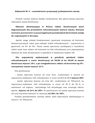 Załącznik Nr 4 – uzasadnienie propozycji podwyższenia marży. Projekt ustawy zawiera bardzo niekorzystne dla aptek zmiany sposobu naliczania marży detalicznej. Obecnie obowiązująca w Polsce tabela detalicznych marż degresywnych dla produktów refundowanych zawiera marże, których wartości procentowe w poszczególnych przedziałach kwotowych należą do najniższych w Europie. Apteki mogą jednak funkcjonować, ponieważ otrzymują od hurtowni farmaceutycznych rabat przy zakupie leków refundowanych – najczęściej w granicach od 3% do 8%. Suma marży aptecznej wynikającej z urzędowej tabeli marż oraz rabatu od hurtowni na leki refundowane jest przynajmniej zbliżona do marż detalicznych w aptekach w większości krajów UE. Dla najczęściej wydawanych w polskich aptekach leków refundowanych o cenie detalicznej od 30,00 zł do 50,00 zł marża detaliczna wynosi 16%, a po uwzględnieniu rabatu od hurtowni np. 5% rzeczywista marża wynosi 21%. Dla porównania: − marża apteczna liczona od ceny hurt. realizowana w Austrii na najczęściej wydawane leki refundowane w cenie od 30 € do 60 € wynosi 28% − marża apteczna liczona od ceny det. realizowana we Włoszech na najczęściej wydawane leki refundowane w cenie od 25 € do 50 €, w zależności od regionu (miejskiego lub wiejskiego) oraz rocznego obrotu apteki, wynosi od 21% do 25%. W przeliczeniu na marżę apteczną liczoną od ceny hurtowej wartości te wynoszą od 28% do 35%. Poniżej przedstawione zostały tabele marż aptecznych obowiązujące w Austrii i we Włoszech: Tabela marż na leki ref undow ane w Austrii: Tabela marż na leki ref undow ane w e Włoszech: Ze względu na proponowaną stałą marżę hurtową obniżoną do wartości 5% oraz stałą marżę detaliczną nie będzie możliwe otrzymanie przez aptekę rabatu od hurtowni na leki refundowane. Dodatkowo rzeczywista marża apteczna będzie jeszcze znacznie niższa, niż zawarta w proponowanej tabeli, ponieważ według projektu ustawy marża apteczna będzie naliczana nie od ceny hurtowej produktów refundowanych, tylko od limitów ustalonych dla poszczególnych grup produktów refundowanych. Ponieważ wartości tych limitów są w większości przypadków znacznie niższe, niż ceny hurtowe, spowoduje to poważne zmniejszenie i tak już bardzo niskiej marży aptecznej. Tego typu system naliczania marż aptecznych nie jest stosowany w żadnym kraju Unii Europejskiej. Według symulacji przeprowadzonych przez IMS straty średniej apteki w Polsce spowodowane wejściem w życie systemu naliczania marż aptecznych zawartego w projekcie ustawy refundacyjnej mogą wynosić około 5 tysięcy złotych miesięcznie, co daje kwotę około 60 tysięcy złotych rocznie. Ponieważ według wyliczeń IMS od 30% do 40% aptek w Polsce funkcjonuje na granicy płynności finansowej, wejście w życie takiego systemu naliczania marż aptecznych spowoduje w krótkim czasie likwidację od 30% do 40% aptek! Najbardziej prawdopodobne jest też, że większość z likwidowanych aptek będą stanowić niezależne apteki rodzinne na terenach wiejskich oraz w mniejszych miastach. Ponadto apteki niezależne, które dzisiaj znajdują się w dobrej kondycji finansowej, zostaną bardzo poważnie osłabione. Będą one zmuszone do obniżenia kosztów poprzez m.in. redukcję personelu fachowego oraz zmniejszenie zapasów magazynowych, co również wpłynie na pogorszenie dostępności pacjentów do leków. Badania wyspecjalizowanych firm zajmujących się rynkiem farmaceutycznym w Polsce potwierdzają jednoznacznie, że propozycje zawarte w projekcie opiniowanej ustawy drastycznie obniżą realną wysokość marży detalicznej. Analiza wpływu proponowanych zmian na rynek leków nadciśnieniowych refundowanych ze środków publicznych, wykonana Miliony przez firmę IMS, prowadzi do następujących wniosków: 2 000 Obecna sytuacja Sytuacja po zmianach 1 800 1 731 1 600 1 731 1 400 1 200 1 142 1 000 1 034 800 600 697 589 400 200 0 Refundacja NFZ w spółpłacenie Pacjenta Total Detal Refundacja NFZ współpłaceni e Pacjenta Total Detal APTEKA – wpływ zmian na realizowaną marżę detaliczną Do analizy wybrano z panelu IMS „średnią” aptekę. Wybrane zostały apteki: sieciowe z obrotem 130-180 tys. zł/miesięcznie oraz niezależne z obrotem 110-160 tys. zł/miesięcznie. Założone przedziały wartości obrotu spełniło 95 aptek sieciowych i 258 aptek niezależnych. Wszystkie te apteki przesyłały dane w całym analizowanym okresie. W wyniku wprowadzenia proponowanych zmian: 1) hurtownie farmaceutyczne wprost nie odczują tej zmiany, ponieważ już obecnie ich efektywna marża nie wynosi 8,91%, a raczej bliższa jest 5%; 2) koszty związane z omawianą zmianą poniosą apteki oraz producenci leków; 3) apteki: marża od limitu, a szczególnie zakaz rabatowania, wpłynie negatywnie na kwotę marży aptecznej. Tabela marż zaproponowana w projekcie ustawy wskazuje, że przy urzędowej marży detalicznej liczonej od limitu detaliści stracą w ten sposób ok. 600 mln PLN. Sami autorzy projektu obliczyli, że planowany spadek marży hurtowej na produkty refundowane do poziomu 5 % spowoduje utratę przychodów w wysokości 450 mln złotych dla hurtu farmaceutycznego. Natomiast obniżenie cen oraz zmiana sposobu naliczania marży detalicznej dla uczestników obrotu detalicznego – aptekarzy spowoduje zmniejszenie przychodów w wysokości 180 mln złotych w skali roku. Autorzy projektu nie uwzględnili również spadku dochodów aptek poprzez utratę rabatów otrzymywanych dotychczas z hurtowni (ok. 575 mln zł). Daje to łączna kwotę utraty przychodów aptek w wysokości ok. 755 mln zł. W konsekwencji odbije się to na wpływach do budżetu państwa z tytułu zmniejszenia wpływów w podatkach dochodowych (ok. 144 mln zł). Projektowana przez MZ tabela marż wskazuje na dyskryminującą postawę MZ wobec aptekarzy. Chodzi o marże dla leków powyżej 100 złotych, dla kt