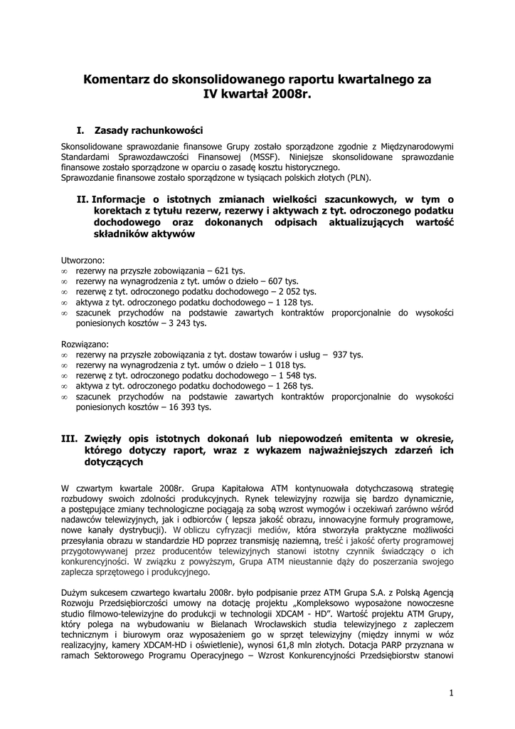 Komentarz do skonsolidowanego raportu kwartalnego za IV kwartał 2008r. I. Zasady rachunkowości Skonsolidowane sprawozdanie finansowe Grupy zostało sporządzone zgodnie z Międzynarodowymi Standardami Sprawozdawczości Finansowej (MSSF). Niniejsze skonsolidowane sprawozdanie finansowe zostało sporządzone w oparciu o zasadę kosztu historycznego. Sprawozdanie finansowe zostało sporządzone w tysiącach polskich złotych (PLN). II. Informacje o istotnych zmianach wielkości szacunkowych, w tym o korektach z tytułu rezerw, rezerwy i aktywach z tyt. odroczonego podatku dochodowego oraz dokonanych odpisach aktualizujących wartość składników aktywów Utworzono: • rezerwy na przyszłe zobowiązania – 621 tys. • rezerwy na wynagrodzenia z tyt. umów o dzieło – 607 tys. • rezerwę z tyt. odroczonego podatku dochodowego – 2 052 tys. • aktywa z tyt. odroczonego podatku dochodowego – 1 128 tys. • szacunek przychodów na podstawie zawartych kontraktów proporcjonalnie do wysokości poniesionych kosztów – 3 243 tys. Rozwiązano: • rezerwy na przyszłe zobowiązania z tyt. dostaw towarów i usług – 937 tys. • rezerwy na wynagrodzenia z tyt. umów o dzieło – 1 018 tys. • rezerwę z tyt. odroczonego podatku dochodowego – 1 548 tys. • aktywa z tyt. odroczonego podatku dochodowego – 1 268 tys. • szacunek przychodów na podstawie zawartych kontraktów proporcjonalnie do wysokości poniesionych kosztów – 16 393 tys. III. Zwięzły opis istotnych dokonań lub niepowodzeń emitenta w okresie, którego dotyczy raport, wraz z wykazem najważniejszych zdarzeń ich dotyczących W czwartym kwartale 2008r. Grupa Kapitałowa ATM kontynuowała dotychczasową strategię rozbudowy swoich zdolności produkcyjnych. Rynek telewizyjny rozwija się bardzo dynamicznie, a postępujące zmiany technologiczne pociągają za sobą wzrost wymogów i oczekiwań zarówno wśród nadawców telewizyjnych, jak i odbiorców ( lepsza jakość obrazu, innowacyjne formuły programowe, nowe kanały dystrybucji). W obliczu cyfryzacji mediów, która stworzyła praktyczne możliwości przesyłania obrazu w standardzie HD poprzez transmisję naziemną, treść i jakość oferty programowej przygotowywanej przez producentów telewizyjnych stanowi istotny czynnik świadczący o ich konkurencyjności. W związku z powyższym, Grupa ATM nieustannie dąży do poszerzania swojego zaplecza sprzętowego i produkcyjnego. Dużym sukcesem czwartego kwartału 2008r. było podpisanie przez ATM Grupa S.A. z Polską Agencją Rozwoju Przedsiębiorczości umowy na dotację projektu „Kompleksowo wyposażone nowoczesne studio filmowo-telewizyjne do produkcji w technologii XDCAM - HD”. Wartość projektu ATM Grupy, który polega na wybudowaniu w Bielanach Wrocławskich studia telewizyjnego z zapleczem technicznym i biurowym oraz wyposażeniem go w sprzęt telewizyjny (między innymi w wóz realizacyjny, kamery XDCAM-HD i oświetlenie), wynosi 61,8 mln złotych. Dotacja PARP przyznana w ramach Sektorowego Programu Operacyjnego – Wzrost Konkurencyjności Przedsiębiorstw stanowi 1 50% całej kwoty i opiewa na prawie 31 mln złotych. Zdecydowana większość projektu została zrealizowana. Pierwsze nagrania w nowym studio miały miejsce już w sierpniu ubiegłego roku, a rozpoczęcie użytkowania kompleksu biurowego w Bielanach Wrocławskich nastąpiło w listopadzie. Spółka dysponuje już także specjalistycznym wozem produkcyjnym pozwalającym na realizację programów w technologii wysokiej rozdzielczości High Definition. Wóz HD to inwestycja, która stwarza możliwości kreacji pionierskich produkcji telewizyjnych czy filmowych oraz doskonałej współpracy z nadawcami telewizyjnymi, a także umożliwia spółce samodzielne podejmowanie największych przedsięwzięć, takich jak: koncerty, transmisje imprez sportowych oraz inne wydarzenia plenerowe. Wzbogacenie bazy sprzętowej o wóz HD to wejście w etap, dzięki któremu ATM Grupa S.A. będzie w stanie realizować kolejne, innowacyjne projekty na najwyższym światowym poziomie. Nowy wóz, o wartości ok. 21 mln zł, trafił do spółki w połowie lutego br. Dzięki dotacji ATM Grupa S.A. będzie mogła zwiększyć ilość środków przeznaczonych na kolejne inwestycje, a także na realizację następnych produkcji w jeszcze lepszej jakości, przy wykorzystaniu najnowszych technologii telewizyjnych. Kwota dotacji zostanie przekazana przez PARP pod warunkiem zakończenia i prawidłowego rozliczenia projektu, co prawdopodobnie nastąpi już w drugim kwartale 2009 roku. Warto tu podkreślić, że Grupa Kapitałowa ATM jest jedynym polskim producentem telewizyjnym (nie będącym jednocześnie nadawcą programu telewizyjnego) dysponującym własnym, nowoczesnym i kompletnym zapleczem produkcyjnym. Fakt ten znacznie podnosi konkurencyjność Grupy Kapitałowej ATM wobec pozostałych spółek producenckich programów telewizyjnych w Polsce oraz ma znaczący wpływ na wielkość uzyskiwanych przychodów i pozycję spółki na rynku. W zakresie produkcji telewizyjnych IV kwartał 2008r. upłynął przede wszystkim na kontynuacji znanych i lubianych przez widzów produkcji, takich jak: „Pierwsza Miłość”, „Świat według Kiepskich”, „Złotopolscy”, „ Ranczo”, „Kłamczuch”. Z nowych dużych projektów, które zrealizowane zostały w analizowanym okresie wymienić należy program „Fabryka Gwiazd”, który emitowany był na antenie Telewizji Polsat od połowy września do grudnia 2008 (produkcja we współpracy ze spółką Endemol). Najważniejsze wydarzenia IV kwartału 2008r. zostały ujęte poniżej w porządku chronologicznym: 1. Zawarcie 01.10.2008r. pomiędzy ATM Grupa S.A. oraz Telewizją Polsat S.A. umowy produkcyjnej na realizację 24 odcinków serialu animowanego „Saloon Gier”. 2. Zawarcie 14.10.2008r. pomiędzy Studio A oraz Telewizją Polską S.A. umowy produkcyjnej na realizację czwartej serii serialu „Ranczo”