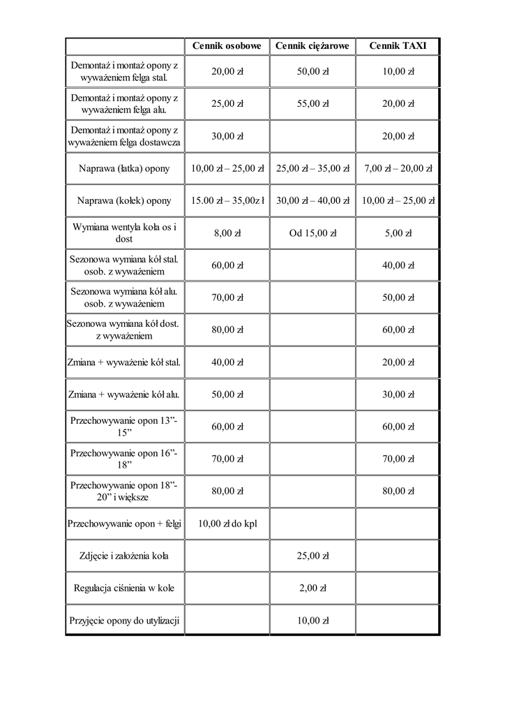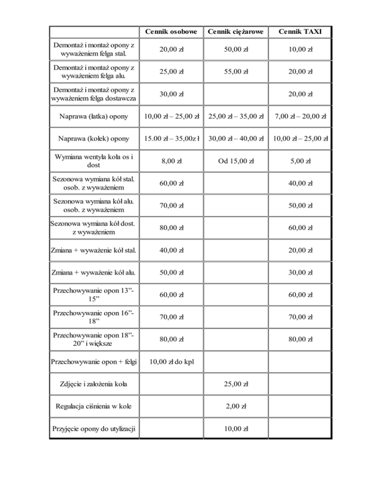 Cennik osobowe Cennik ciężarowe Cennik TAXI Demontaż i montaż opony z wyważeniem felga stal. 20,00 zł 50,00 zł 10,00 zł Demontaż i montaż opony z wyważeniem felga alu. 25,00 zł 55,00 zł 20,00 zł Demontaż i montaż opony z wyważeniem felga dostawcza 30,00 zł Naprawa (łatka) opony 10,00 zł – 25,00 zł 25,00 zł – 35,00 zł 7,00 zł – 20,00 zł Naprawa (kołek) opony 15.00 zł – 35,00z ł 30,00 zł – 40,00 zł 10,00 zł – 25,00 zł Wymiana wentyla koła os i dost 8,00 zł Od 15,00 zł 5,00 zł Sezonowa wymiana kół stal. osob. z wyważeniem 60,00 zł 40,00 zł Sezonowa wymiana kół alu. osob. z wyważeniem 70,00 zł 50,00 zł Sezonowa wymiana kół dost. z wyważeniem 80,00 zł 60,00 zł Zmiana + wyważenie kół stal. 40,00 zł 20,00 zł Zmiana + wyważenie kół alu. 50,00 zł 30,00 zł Przechowywanie opon 13”15” 60,00 zł 60,00 zł Przechowywanie opon 16”18” 70,00 zł 70,00 zł Przechowywanie opon 18”20” i większe 80,00 zł 80,00 zł Przechowywanie opon + felgi 10,00 zł do kpl 20,00 zł Zdjęcie i założenia koła 25,00 zł Regulacja ciśnienia w kole 2,00 zł Przyjęcie opony do utylizacji 10,00 zł