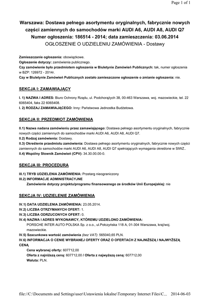 Page 1 of 1 Warszawa: Dostawa pełnego asortymentu oryginalnych, fabrycznie nowych części zamiennych do samochodów marki AUDI A6, AUDI A8, AUDI Q7 Numer ogłoszenia: 186514 - 2014; data zamieszczenia: 03.06.2014 OGŁOSZENIE O UDZIELENIU ZAMÓWIENIA - Dostawy Zamieszczanie ogłoszenia: obowiązkowe. Ogłoszenie dotyczy: zamówienia publicznego. Czy zamówienie było przedmiotem ogłoszenia w Biuletynie Zamówień Publicznych: tak, numer ogłoszenia w BZP: 126972 - 2014r. Czy w Biuletynie Zamówień Publicznych zostało zamieszczone ogłoszenie o zmianie ogłoszenia: nie. SEKCJA I: ZAMAWIAJĄCY I. 1) NAZWA I ADRES: Biuro Ochrony Rządu, ul. PodchorąŜych 38, 00-463 Warszawa, woj. mazowieckie, tel. 22 6065404, faks 22 6065408. I. 2) RODZAJ ZAMAWIAJĄCEGO: Inny: Państwowa Jednostka BudŜetowa. SEKCJA II: PRZEDMIOT ZAMÓWIENIA II.1) Nazwa nadana zamówieniu przez zamawiającego: Dostawa pełnego asortymentu oryginalnych, fabrycznie nowych części zamiennych do samochodów marki AUDI A6, AUDI A8, AUDI Q7. II.2) Rodzaj zamówienia: Dostawy. II.3) Określenie przedmiotu zamówienia: Dostawa pełnego asortymentu oryginalnych, fabrycznie nowych części zamiennych do samochodów marki AUDI A6, AUDI A8, AUDI Q7 spełniających wymagania określone w SIWZ.. II.4) Wspólny Słownik Zamówień (CPV): 34.30.00.00-0. SEKCJA III: PROCEDURA III.1) TRYB UDZIELENIA ZAMÓWIENIA: Przetarg nieograniczony III.2) INFORMACJE ADMINISTRACYJNE Zamówienie dotyczy projektu/programu finansowanego ze środków Unii Europejskiej: nie SEKCJA IV: UDZIELENIE ZAMÓWIENIA IV.1) DATA UDZIELENIA ZAMÓWIENIA: 23.05.2014. IV.2) LICZBA OTRZYMANYCH OFERT: 1. IV.3) LICZBA ODRZUCONYCH OFERT: 0. IV.4) NAZWA I ADRES WYKONAWCY, KTÓREMU UDZIELONO ZAMÓWIENIA: PORSCHE INTER AUTO POLSKA Sp. z o.o., ul.Połczyńska 118 A, 01-304 Warszawa, kraj/woj. mazowieckie. IV.5) Szacunkowa wartość zamówienia (bez VAT): 565040,65 PLN. IV.6) INFORMACJA O CENIE WYBRANEJ OFERTY ORAZ O OFERTACH Z NAJNIśSZĄ I NAJWYśSZĄ CENĄ Cena wybranej oferty: 607712,00 Oferta z najniŜszą ceną: 607712,00 / Oferta z najwyŜszą ceną: 607712,00 Waluta: PLN. file://C:\Documents and Settings\user\Ustawienia lokalne\Temporary Internet Files\C... 2014-06-03