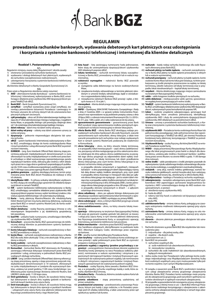 REGULAMIN prowadzenia rachunków bankowych, wydawania debetowych kart płatniczych oraz udostępniania i korzystania z systemów bankowości telefonicznej i internetowej dla klientów detalicznych Rozdział 1. Postanowienia ogólne § 1. Regulamin niniejszy, zwany dalej „Regulaminem”, określa zasady: 1) otwierania i prowadzenia rachunków bankowych, 2) wydawania i obsługi debetowych kart płatniczych, wydawanych do rachunków oszczędnościowo-rozliczeniowych, 3) udostępniania i korzystania z systemów bankowości telefonicznej i internetowej, dla klientów detalicznych w Banku Gospodarki Żywnościowej S.A. § 2. Przez użyte w Regulaminie określenia należy rozumieć: 1) AKD – alternatywne kanały dystrybucji – systemy bankowości telefonicznej i internetowej, wykorzystywane w Banku BGŻ, umożliwiające składanie przez użytkownika AKD dyspozycji/zleceń poprzez TeleBGŻ lub eBGŻ, 2) Bank BGŻ – Bank Gospodarki Żywnościowej S.A., 3) certyfikat – certyfikat wystawiany przez urząd certyfikacji, stanowiący potwierdzenie tożsamości Posiadacza i zawierający informacje używane do ochrony danych lub do ustanawiania bezpiecznych połączeń sieciowych, 4) cykl prowizyjny – okres od 28 dnia kalendarzowego każdego miesiąca do 27 dnia kalendarzowego miesiąca następnego, z wyjątkiem konta Maax, w przypadku którego cykl prowizyjny obejmuje okres od 1 do ostatniego dnia kalendarzowego każdego miesiąca, 5) dzień roboczy – dzień inny niż dzień wolny od pracy, 6) dzień wolny od pracy – sobotę oraz dzień ustawowo uznany za wolny od pracy, 7) dyspozycja – polecenie niepowodujące obciążenia lub uznania rachunku, 8) eBGŻ – system bankowości internetowej wykorzystywany w Banku BGŻ, umożliwiający dostęp do konta osobistego/konta Maax i innych produktów i usług oferowanych przez Bank BGŻ za pośrednictwem Internetu, 9) EURIBOR – (ang. Euro Interbank Offered Rate) dzienną stopę procentową pożyczek międzybankowych denominowanych w euro, oferowanych na rynku międzybankowym w strefie euro przez banki wchodzące w skład wyznaczonego reprezentatywnego panelu największych banków strefy, obliczaną jako średnia z ofert składanych przez nie w ciągu dnia w godzinach poprzedzających publikację (do 10:45 czasu środkowoeuropejskiego), publikowaną o godzinie 11:00 tego czasu przez agencję Reuters (kod EURIBOR), 10) godzina graniczna – godzinę określającą końcowy termin przyjmowania przez Bank BGŻ zleceń Posiadacza do realizacji w dniu ich złożenia, 11) identyfikator AKD – 9-cyfrowy unikalny identyfikator użytkownika AKD, służący do weryfikacji jego uprawnień do składania dyspozycji/zleceń w ramach TeleBGŻ, 12) IVR – system bankowości telefonicznej wykorzystywany w Banku BGŻ, umożliwiający samodzielne składanie przez użytkownika AKD dyspozycji/zleceń poprzez tonowy wybór kombinacji znaków z klawiatury aparatu telefonicznego i ich automatyczną realizację, 13) Karta – kartę płatniczą Maestro/Maestro dla młodzieży/kartę Debit MasterCard lub inną kartę płatniczą debetową, wydawaną przez Bank BGŻ w ramach systemu MasterCard, do konta osobistego/konta Maax, 14) klient detaliczny – osobę fizyczną zawierającą Umowę w celu niezwiązanym bezpośrednio z jej działalnością gospodarczą lub zawodową, 15) kod PIN – unikalne hasło numeryczne, umożliwiające identyfikację użytkownika AKD w TeleBGŻ, 16) konsultant – pracownika Banku BGŻ upoważnionego do telefonicznej obsługi klientów za pośrednictwem systemu bankowości telefonicznej, 17) konto lokacyjne Eskalacja – rachunek oszczędnościowy w Banku BGŻ prowadzony w złotych, 18) konto Maax – rachunek oszczędnościowo-rozliczeniowy w Banku BGŻ dla osób, które ukończyły 13 lat, a nie ukończyły 18 lat, prowadzony w złotych, 19) konto osobiste – rachunek oszczędnościowo-rozliczeniowy w Banku BGŻ prowadzony w złotych, 20) Komunikat – komunikat Banku BGŻ skierowany do Posiadaczy, zawierający informacje dotyczące świadczonych przez Bank BGŻ produktów i usług, umieszczany w jednostkach Banku BGŻ prowadzących obsługę rachunków, 21) LIBOR – (ang. London Interbank Offered Rate) dzienną referencyjną stopę procentową, opartą o stopy procentowe pożyczek międzybankowych denominowanych w 10 walutach, oferowanych na rynku międzybankowym w Londynie dla wyznaczonych banków, ustalaną tuż przed godziną 11:00 czasu londyńskiego i publikowaną przez wyznaczonego dostawcę (obecnie Reuters, kod LIBOR01) około godz. 11:30 tego czasu, 22) limit gotówkowy – kwotę w złotych, do wysokości której mogą być dokonywane w danym dniu wypłaty gotówki w bankomatach lub kasach banków przy użyciu Karty, 23) limit transakcyjny – kwotę w złotych, do wysokości której mogą być dokonywane w danym dniu operacje w punktach handlowo – usługowych przy użyciu Karty oraz płatności dokonywane bez fizycznego przedstawienia Karty z logo MasterCard, 24) lista haseł – listę zawierającą numeryczne hasła jednorazowe, które służą do uwierzytelniania dyspozycji/zleceń użytkownika AKD składanych poprzez eBGŻ, 25) lokata terminowa – rachunek terminowej lokaty oszczędnościowej w Banku BGŻ, prowadzony w złotych lub w walucie wymienialnej, 26) należności wymagalne – należności Banku BGŻ powstałe w wyniku: a) wystąpienia salda debetowego na koncie osobistym/koncie Maax, b) niespłacenia kredytu odnawialnego w terminie płatności określonym w umowie kredytu odnawialnego, bądź w oświadczeniu o wypowiedzeniu takiej umowy, c) niezapłacenia należnych Bankowi BGŻ prowizji i opłat, o których mowa w § 10 w pkt 1, 27) nierezydent – klienta detalicznego mającego miejsce zamieszkania za granicą, 28) MiFID – Dyrektywę 2004/39/WE Parlamentu Europejskiego i Rady z dnia 21 kwietnia 2004 r. w sprawie rynków instrumentów finansowych oraz wprowadzone na jej podstawie przepisy ustawy z dnia 2