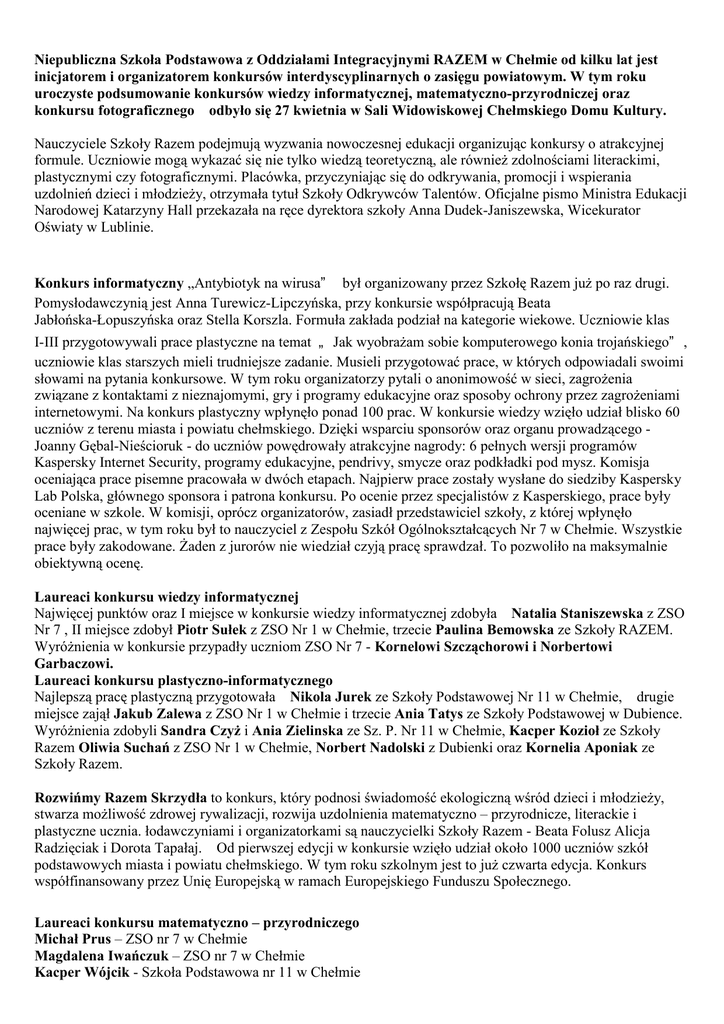 Niepubliczna Szkoła Podstawowa z Oddziałami Integracyjnymi RAZEM w Chełmie od kilku lat jest inicjatorem i organizatorem konkursów interdyscyplinarnych o zasięgu powiatowym. W tym roku uroczyste podsumowanie konkursów wiedzy informatycznej, matematyczno-przyrodniczej oraz konkursu fotograficznego odbyło się 27 kwietnia w Sali Widowiskowej Chełmskiego Domu Kultury. Nauczyciele Szkoły Razem podejmują wyzwania nowoczesnej edukacji organizując konkursy o atrakcyjnej formule. Uczniowie mogą wykazać się nie tylko wiedzą teoretyczną, ale równieŜ zdolnościami literackimi, plastycznymi czy fotograficznymi. Placówka, przyczyniając się do odkrywania, promocji i wspierania uzdolnień dzieci i młodzieŜy, otrzymała tytuł Szkoły Odkrywców Talentów. Oficjalne pismo Ministra Edukacji Narodowej Katarzyny Hall przekazała na ręce dyrektora szkoły Anna Dudek-Janiszewska, Wicekurator Oświaty w Lublinie. Konkurs informatyczny „Antybiotyk na wirusa” był organizowany przez Szkołę Razem juŜ po raz drugi. Pomysłodawczynią jest Anna Turewicz-Lipczyńska, przy konkursie współpracują Beata Jabłońska-Łopuszyńska oraz Stella Korszla. Formuła zakłada podział na kategorie wiekowe. Uczniowie klas I-III przygotowywali prace plastyczne na temat „ Jak wyobraŜam sobie komputerowego konia trojańskiego” , uczniowie klas starszych mieli trudniejsze zadanie. Musieli przygotować prace, w których odpowiadali swoimi słowami na pytania konkursowe. W tym roku organizatorzy pytali o anonimowość w sieci, zagroŜenia związane z kontaktami z nieznajomymi, gry i programy edukacyjne oraz sposoby ochrony przez zagroŜeniami internetowymi. Na konkurs plastyczny wpłynęło ponad 100 prac. W konkursie wiedzy wzięło udział blisko 60 uczniów z terenu miasta i powiatu chełmskiego. Dzięki wsparciu sponsorów oraz organu prowadzącego Joanny Gębal-Nieścioruk - do uczniów powędrowały atrakcyjne nagrody: 6 pełnych wersji programów Kaspersky Internet Security, programy edukacyjne, pendrivy, smycze oraz podkładki pod mysz. Komisja oceniająca prace pisemne pracowała w dwóch etapach. Najpierw prace zostały wysłane do siedziby Kaspersky Lab Polska, głównego sponsora i patrona konkursu. Po ocenie przez specjalistów z Kasperskiego, prace były oceniane w szkole. W komisji, oprócz organizatorów, zasiadł przedstawiciel szkoły, z której wpłynęło najwięcej prac, w tym roku był to nauczyciel z Zespołu Szkół Ogólnokształcących Nr 7 w Chełmie. Wszystkie prace były zakodowane. śaden z jurorów nie wiedział czyją pracę sprawdzał. To pozwoliło na maksymalnie obiektywną ocenę. Laureaci konkursu wiedzy informatycznej Najwięcej punktów oraz I miejsce w konkursie wiedzy informatycznej zdobyła Natalia Staniszewska z ZSO Nr 7 , II miejsce zdobył Piotr Sułek z ZSO Nr 1 w Chełmie, trzecie Paulina Bemowska ze Szkoły RAZEM. WyróŜnienia w konkursie przypadły uczniom ZSO Nr 7 - Kornelowi Szcząchorowi i Norbertowi Garbaczowi. Laureaci konkursu plastyczno-informatycznego Najlepszą pracę plastyczną przygotowała Nikola Jurek ze Szkoły Podstawowej Nr 11 w Chełmie, drugie miejsce zajął Jakub Zalewa z ZSO Nr 1 w Chełmie i trzecie Ania Tatys ze Szkoły Podstawowej w Dubience. WyróŜnienia zdobyli Sandra CzyŜ i Ania Zielinska ze Sz. P. Nr 11 w Chełmie, Kacper Kozioł ze Szkoły Razem Oliwia Suchań z ZSO Nr 1 w Chełmie, Norbert Nadolski z Dubienki oraz Kornelia Aponiak ze Szkoły Razem. Rozwińmy Razem Skrzydła to konkurs, który podnosi świadomość ekologiczną wśród dzieci i młodzieŜy, stwarza moŜliwość zdrowej rywalizacji, rozwija uzdolnienia matematyczno – przyrodnicze, literackie i plastyczne ucznia. łodawczyniami i organizatorkami są nauczycielki Szkoły Razem - Beata Folusz Alicja Radzięciak i Dorota Tapałaj. Od pierwszej edycji w konkursie wzięło udział około 1000 uczniów szkół podstawowych miasta i powiatu chełmskiego. W tym roku szkolnym jest to juŜ czwarta edycja. Konkurs współfinansowany przez Unię Europejską w ramach Europejskiego Funduszu Społecznego. Laureaci konkursu matematyczno – przyrodniczego Michał Prus – ZSO nr 7 w Chełmie Magdalena Iwańczuk – ZSO nr 7 w Chełmie Kacper Wójcik - Szkoła Podstawowa nr 11 w Chełmie Jan Pietrzak – Szkoła Podstawowa nr 1 w Chełmie Mateusz Łuszczyk - Szkoła Podstawowa nr 1 w Chełmie Łukasz Kusy - Szkoła Podstawowa nr 1 w Chełmie Adrian Kruczyński – Szkoła Podstawowa nr 11 w Chełmie Igor Danieluk - Szkoła Podstawowa nr 11 w Chełmie Aleksandra Kuźmińska - Niepubliczna Szkoła Podstawowa z Oddziałami Integracyjnymi „Razem” Chełmie Łukasz Małysz - Niepubliczna Szkoła Podstawowa z Oddziałami Integracyjnymi „Razem” w w Chełmie Super Matematyk Katarzyna Gacparska – ZSO nr 7 w Chełmie Milena Drewienkowska - ZSO nr 7 w Chełmie Adrian Jokisz – Szkoła Podstawowa nr 4 w Chełmie Michał Hetmańczuk - Szkoła Podstawowa nr 1 w Chełmie Katarzyna Wójtowicz - Szkoła Podstawowa nr 1 w Chełmie Kacper Wójcik - Szkoła Podstawowa nr 11 w Chełmie Monika Kasjan – ZSO nr 8 w Chełmie Klaudia Krzysztoń - ZSO nr 8 w Chełmie Michał Nowak – Zespół Szkół w Strupinie DuŜym Super Przyrodnik Michał Prus – ZSO nr 7 w Chełmie Mistrz Konkursu: Adrian Kruczyński – klasa III - Szkoła Podstawowa nr 11 w Chełmie Aleksandra Kuźmińska – klasa III - Niepubliczna Szkoła Podstawowa z Oddziałami Integracyjnymi „Razem ” w Chełmie Konkurs plastyczny Kategoria - klasy VI I miejsce – Arleta Szymczuk - Szkoła Podstawowa nr 11 w Chełmie II miejsce – Katarzyna Gacparska – ZSO nr 7 w Chełmie III miejsce – Katarzyna Nafalska – Zespół Szkół w Stawie Kategoria – klasy V I miejsce – Angelika Tywoniuk – Zespół Szkół w Stawie II miejsce – Paulina Karamać – Szkoła Podstawowa nr 11 w Chełmie III miejsce – Aleksandra Siarkowska – Szkoła Podstawowa nr 11 w Chełmie wyróŜnienie – Kamila Siatka – ZSO nr