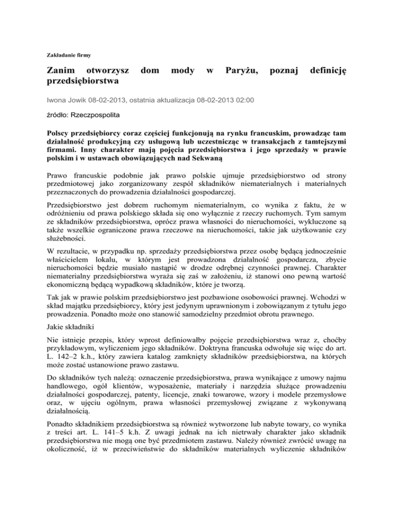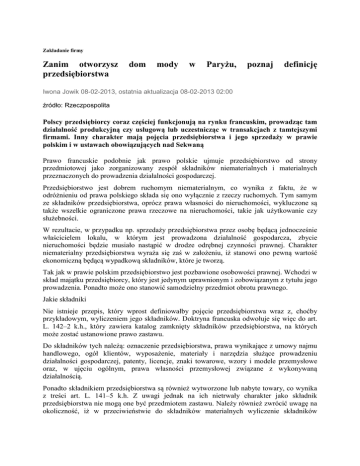 Zakładanie firmy Zanim otworzysz przedsiębiorstwa dom mody w Paryżu, poznaj definicję Iwona Jowik 08-02-2013, ostatnia aktualizacja 08-02-2013 02:00 źródło: Rzeczpospolita Polscy przedsiębiorcy coraz częściej funkcjonują na rynku francuskim, prowadząc tam działalność produkcyjną czy usługową lub uczestnicząc w transakcjach z tamtejszymi firmami. Inny charakter mają pojęcia przedsiębiorstwa i jego sprzedaży w prawie polskim i w ustawach obowiązujących nad Sekwaną Prawo francuskie podobnie jak prawo polskie ujmuje przedsiębiorstwo od strony przedmiotowej jako zorganizowany zespół składników niematerialnych i materialnych przeznaczonych do prowadzenia działalności gospodarczej. Przedsiębiorstwo jest dobrem ruchomym niematerialnym, co wynika z faktu, że w odróżnieniu od prawa polskiego składa się ono wyłącznie z rzeczy ruchomych. Tym samym ze składników przedsiębiorstwa, oprócz prawa własności do nieruchomości, wykluczone są także wszelkie ograniczone prawa rzeczowe na nieruchomości, takie jak użytkowanie czy służebności. W rezultacie, w przypadku np. sprzedaży przedsiębiorstwa przez osobę będącą jednocześnie właścicielem lokalu, w którym jest prowadzona działalność gospodarcza, zbycie nieruchomości będzie musiało nastąpić w drodze odrębnej czynności prawnej. Charakter niematerialny przedsiębiorstwa wyraża się zaś w założeniu, iż stanowi ono pewną wartość ekonomiczną będącą wypadkową składników, które je tworzą. Tak jak w prawie polskim przedsiębiorstwo jest pozbawione osobowości prawnej. Wchodzi w skład majątku przedsiębiorcy, który jest jedynym uprawnionym i zobowiązanym z tytułu jego prowadzenia. Ponadto może ono stanowić samodzielny przedmiot obrotu prawnego. Jakie składniki Nie istnieje przepis, który wprost definiowałby pojęcie przedsiębiorstwa wraz z, choćby przykładowym, wyliczeniem jego składników. Doktryna francuska odwołuje się więc do art. L. 142–2 k.h., który zawiera katalog zamknięty składników przedsiębiorstwa, na których może zostać ustanowione prawo zastawu. Do składników tych należą: oznaczenie przedsiębiorstwa, prawa wynikające z umowy najmu handlowego, ogół klientów, wyposażenie, materiały i narzędzia służące prowadzeniu działalności gospodarczej, patenty, licencje, znaki towarowe, wzory i modele przemysłowe oraz, w ujęciu ogólnym, prawa własności przemysłowej związane z wykonywaną działalnością. Ponadto składnikiem przedsiębiorstwa są również wytworzone lub nabyte towary, co wynika z treści art. L. 141–5 k.h. Z uwagi jednak na ich nietrwały charakter jako składnik przedsiębiorstwa nie mogą one być przedmiotem zastawu. Należy również zwrócić uwagę na okoliczność, iż w przeciwieństwie do składników materialnych wyliczenie składników niematerialnych wymienionych w kodeksie handlowym ma charakter jedynie przykładowy (katalog otwarty) oraz cechuje się dalece posuniętą różnorodnością. W każdym razie dla oceny, czy dany element wchodzi w skład przedsiębiorstwa, należy posługiwać się kryterium jego przeznaczenia. Otóż przedsiębiorstwo tworzą wyłącznie elementy służące realizacji zadań gospodarczych. Elementy niematerialne Wśród elementów niematerialnych składających się na przedsiębiorstwo należy wskazać na ogół klientów, oznaczenie przedsiębiorstwa, prawa z umowy najmu handlowego oraz inne prawa, zezwolenia itp. Odrębnie przedstawia się natomiast zagadnienie wierzytelności i długów związanych z działalnością przedsiębiorstwa. Przede wszystkim tzw. ogół klientów W prawie francuskim, co do zasady, to ogół klientów odgrywa pierwszorzędne znaczenie wśród składników przedsiębiorstwa. W doktrynie podkreśla się wręcz, że bez klientów nie można mówić o jego istnieniu. Postrzeganie przedsiębiorstwa przez pryzmat klientów wynika z faktu, że to właśnie oni stanowią czynnik wpływający w sposób zasadniczy na zyski przedsiębiorcy. Aby mówić o ogóle klientów jako składniku przedsiębiorstwa, powinni oni mieć charakter stały, pewny, rzeczywisty oraz osobisty, tzn. muszą być związani z dotychczasowym przedsiębiorcą. Nie jest zatem składnikiem przedsiębiorstwa klientela o charakterze wyłącznie potencjalnym, związana jedynie z lokalizacją przedsiębiorstwa. Tym samym sprzedaż kompletnego zespołu urządzeń umożliwiających z technicznego punktu widzenia prowadzenie działalności gospodarczej – niepołączone jednak z cesją ogółu klientów – nie będzie, co do zasady, uznane za sprzedaż przedsiębiorstwa i nie będzie podlegać przepisom kodeksu handlowego. Waga oznaczenia Kolejnym istotnym składnikiem przedsiębiorstwa jest jego nazwa, czyli takie oznaczenie słowne, które służy indywidualizacji oraz identyfikacji prowadzonej działalności gospodarczej, a tym samym, będąc znakiem rozpoznawczym, przyciąga klientelę. Korelatem nazwy przedsiębiorstwa jest jego szyld, rozumiany jako zewnętrzne oznaczenie przedsiębiorcy. Dla przedsiębiorstwa należącego do osoby fizycznej jako nazwę można obrać imię i nazwisko lub pseudonim przedsiębiorcy bądź też dowolne wymyślone określenie. W przypadku osób prawnych nazwami mogą być zarówno imiona i nazwiska wspólników, jak i wymyślone wyrażenie czy słowo. Nazwa przedsiębiorstwa zawierająca imię i nazwisko może być przedmiotem obrotu prawnego. W orzecznictwie podkreśla się, że w takiej sytuacji imię i nazwisko, które w rozumieniu prawa cywilnego jest dobrem niezbywalnym, zmienia swą naturę, co w efekcie pozwala na ich zbycie. Ograniczeniem, które jednak stąd wypływa, jest fakt, iż zbywca nie może już posługiwać się tą nazwą w celu prowadzenia konkurencyjnej działalności gospodarczej. Składnikiem przedsiębiorstwa są też prawa wynikające z umowy najmu handlowego, której przedmiotem jest nieruchomość przeznaczona do pro