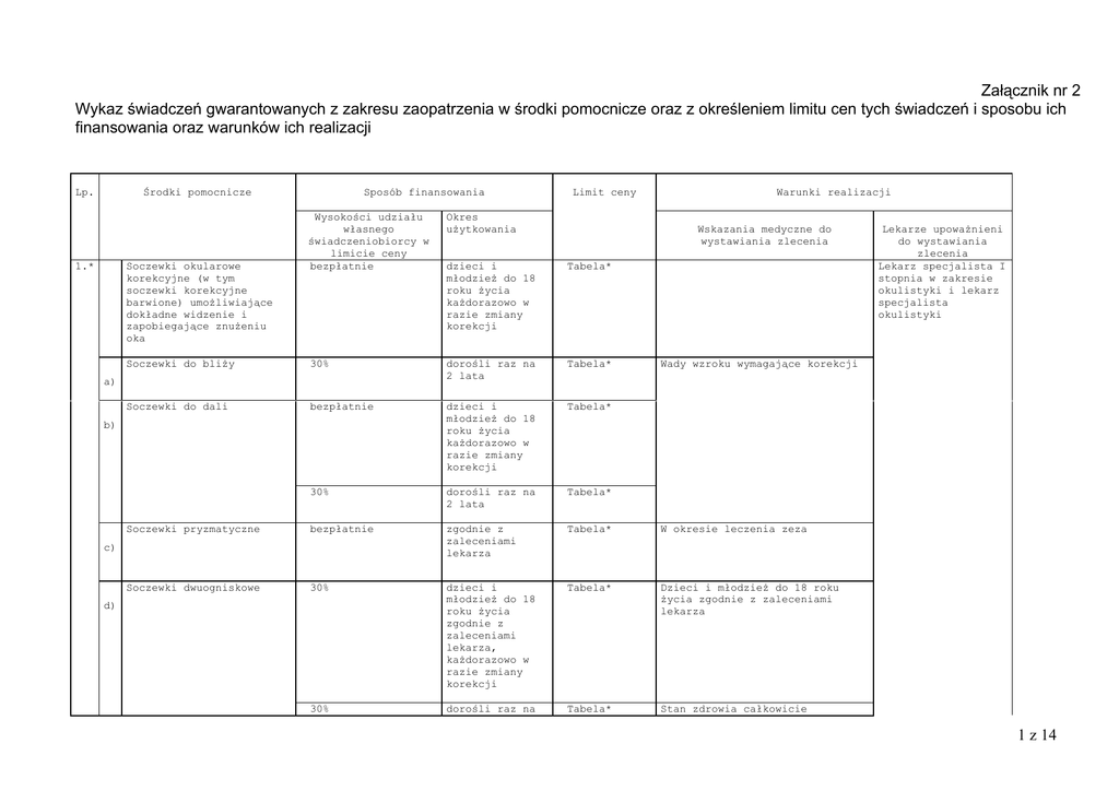 Załącznik nr 2 Wykaz świadczeń gwarantowanych z zakresu zaopatrzenia w środki pomocnicze oraz z określeniem limitu cen tych świadczeń i sposobu ich finansowania oraz warunków ich realizacji Lp. Środki pomocnicze 1.* Sposób finansowania Limit ceny Warunki realizacji Wysokości udziału własnego świadczeniobiorcy w limicie ceny bezpłatnie Okres użytkowania dzieci i młodzież do 18 roku życia każdorazowo w razie zmiany korekcji Tabela* Soczewki do bliży 30% dorośli raz na 2 lata Tabela* Soczewki do dali bezpłatnie dzieci i młodzież do 18 roku życia każdorazowo w razie zmiany korekcji Tabela* 30% dorośli raz na 2 lata Tabela* Soczewki pryzmatyczne bezpłatnie zgodnie z zaleceniami lekarza Tabela* W okresie leczenia zeza Soczewki dwuogniskowe 30% dzieci i młodzież do 18 roku życia zgodnie z zaleceniami lekarza, każdorazowo w razie zmiany korekcji Tabela* Dzieci i młodzież do 18 roku życia zgodnie z zaleceniami lekarza 30% dorośli raz na Tabela* Stan zdrowia całkowicie Soczewki okularowe korekcyjne (w tym soczewki korekcyjne barwione) umożliwiające dokładne widzenie i zapobiegające znużeniu oka a) b) c) d) Wskazania medyczne do wystawiania zlecenia Lekarze upoważnieni do wystawiania zlecenia Lekarz specjalista I stopnia w zakresie okulistyki i lekarz specjalista okulistyki Wady wzroku wymagające korekcji 1 z 14 2 lata 2. uniemożliwiający dokonywanie zmiany okularów Przy leczeniu stożka rogówki i przy dużej anizometropii (łącznie z afakią) Soczewki kontaktowe lecznicze twarde 30% raz na 2 lata miękkie 500 zł 150 zł 3. Obturatory dla dzieci bezpłatnie 4. Pomoce optyczne dla niedowidzących: raz na 2 lata jeden środek pomocniczy raz na 5 lat 10 zł lupa bezpłatnie lunety w tym monookulary bezpłatnie 1.400 zł okulary lornetkowe do bliży i dali bezpłatnie 1.000 zł okulary lupowe bezpłatnie 420 zł a) 80 zł Dzieci zezujące z niedowidzeniem jednego oka Umożliwienie osobom niedowidzącym obserwację jednooczna i dwuoczną przedmiotów bliskich i dalekich b) c) d) 5. Proteza oka wykonana indywidualnie dla dzieci i młodzieży proteza bezpłatnie dzieci i młodzież do 18 roku życia w okresie wzrostu 600 zł a) 700 zł epiproteza Proteza oka wykonana indywidualnie dla dorosłych proteza b) raz na 5 lat bezpłatnie 600 zł 700 zł epiproteza Aparat(y) słuchowy na przewodnictwo powietrza a) lub kostne przy jednostronnym lub Zapobieganie nieprawidłowemu rozwojowi oczodołu i asymetrii twarzy u dzieci, względy psychologiczne i kosmetyczne, uszkodzenia oczodołu, zniekształcenia powiek, worka spojówkowego i oczodołu bezpłatnie dzieci i młodzież do 18 roku życia lub do 26 roku życia w przypadku pobierania nauki raz na 5 lat aparat na przewodnictwo powietrza 1.500 zł Wady słuchu powodujące utrudnienia lub ograniczenie w nabywaniu języka i komunikowaniu się na drodze słuchowej Lekarz specjalista I stopnia w dziedzinie otolaryngologii lub lekarz specjalista laryngologii, lub 2 z 14 otolaryngologii, lub otorynolaryngologii, lub otorynolaryngologii dziecięcej obustronnym ubytku słuchu raz na 5 lat aparat na przewodnictwo powietrza 800 zł Wady słuchu powodujące ograniczenie w komunikowaniu się na drodze słuchowej, podwójne protezowanie dotyczy osób czynnych zawodowo raz na 5 lat aparat na przewodnictwo kostne 1.500 zł Wady słuchu powodujące utrudnienia lub ograniczenie w nabywaniu języka i komunikowaniu się na drodze słuchowej 30% dorośli raz na 5 lat aparat na przewodnictwo kostne 1.500 zł Wady słuchu powodujące ograniczenie w komunikowaniu się na drodze słuchowej, podwójne protezowanie dotyczy osób czynnych zawodowo bezpłatnie Dzieci i młodzież w okresie wzrostu każdorazowo zgodnie z zaleceniami lekarza 60 zł Wady słuchu powodujące utrudnienia lub ograniczenie w nabywaniu języka i komunikowaniu się na drodze słuchowej bezpłatnie dorośli raz na 5 lat 50 zł Wady słuchu powodujące ograniczenie w komunikowaniu się na drodze słuchowej 30% dorośli 6. bezpłatnie dzieci i młodzież do 18 roku życia lub do 26 roku życia w przypadku pobierania nauki b) 7. Wkładka uszna wykonana indywidualnie Zestawy infuzyjne (wkłucia) do osobistych pomp insulinowych do 10 sztuk bezpłatnie dzieci i młodzież do 18 roku życia zgodnie z zaleceniami lekarza raz na miesiąc 300 zł Dzieci i młodzież do 18 roku życia zgodnie z zaleceniami lekarza Lekarz specjalista I stopnia w zakresie pediatrii lub lekarz specjalista pediatrii Lekarz specjalista diabetologii bezpłatnie kobiety ciężarne zgodnie z zaleceniami lekarza raz na miesiąc 300 zł Kobiety ciężarne zgodnie z zaleceniami lekarza Lekarz specjalista diabetologii 3 z 14 8. Systemy wspomagające słyszenie (pętle induktofoniczne, system FM i na podczerwień) 50% raz na 10 lat 5.500 zł Wady słuchu powodujące utrudnienia lub ograniczenie w nabywaniu języka i naukę szkolna dzieciom i młodzieży do 18 roku życia lub do 26 roku życia w przypadku pobierania nauki 9. Cewniki zewnętrzne do 30 szt. lub zamiennie kieszonki do zbiórki moczu do 30 szt. 30% raz na miesiąc 120 zł Schorzenia wymagające stosowania cewników zewnętrznych, nietrzymanie moczu Lekarz specjalista I stopnia w zakresie położnictwa i ginekologii lub lekarz specjalista położnictwa i ginekologii Lekarz specjalista I stopnia w dziedzinie otolaryngologii lub lekarz specjalista laryngologii, lub otolaryngologii, lub otorynolaryngologii, lub otorynolaryngologii dziecięcej Lekarz specjalista urologii lub urologii dziecięcej Chirurg Lekarz ze specjalizacją I stopnia w zakresie neurologii lub lekarz specjalista neurologii, lub neurologii dziecięcej Lekarz podstawowej opieki zdrowotnej Felczer 10. Cewniki urologiczne do 6 sztuk 30% raz na miesiąc 23 zł Schorzenia wymagające cewnikowania pęcherza moczowego Lekarz specjalista urologii lub urologii dziecięcej Chirurg Lekarz ze specjalizacją I stopnia w zakresie neurologii lub lekarz specjalista neurologii, lub neurologii dziec