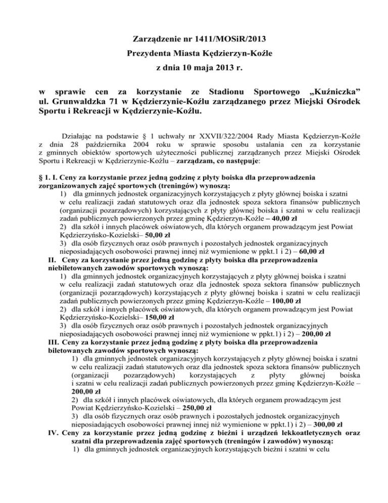 Zarządzenie nr 1411/MOSiR/2013 Prezydenta Miasta Kędzierzyn-Koźle z dnia 10 maja 2013 r. w sprawie cen za korzystanie ze Stadionu Sportowego „Kuźniczka” ul. Grunwaldzka 71 w Kędzierzynie-Koźlu zarządzanego przez Miejski Ośrodek Sportu i Rekreacji w Kędzierzynie-Koźlu. Działając na podstawie § 1 uchwały nr XXVII/322/2004 Rady Miasta Kędzierzyn-Koźle z dnia 28 października 2004 roku w sprawie sposobu ustalania cen za korzystanie z gminnych obiektów sportowych użyteczności publicznej zarządzanych przez Miejski Ośrodek Sportu i Rekreacji w Kędzierzynie-Koźlu – zarządzam, co następuje: § 1. I. Ceny za korzystanie przez jedną godzinę z płyty boiska dla przeprowadzenia zorganizowanych zajęć sportowych (treningów) wynoszą: 1) dla gminnych jednostek organizacyjnych korzystających z płyty głównej boiska i szatni w celu realizacji zadań statutowych oraz dla jednostek spoza sektora finansów publicznych (organizacji pozarządowych) korzystających z płyty głównej boiska i szatni w celu realizacji zadań publicznych powierzonych przez gminę Kędzierzyn-Koźle – 40,00 zł 2) dla szkół i innych placówek oświatowych, dla których organem prowadzącym jest Powiat Kędzierzyńsko-Kozielski– 50,00 zł 3) dla osób fizycznych oraz osób prawnych i pozostałych jednostek organizacyjnych nieposiadających osobowości prawnej innej niż wymienione w ppkt.1 i 2) – 60,00 zł II. Ceny za korzystanie przez jedną godzinę z płyty boiska dla przeprowadzenia niebiletowanych zawodów sportowych wynoszą: 1) dla gminnych jednostek organizacyjnych korzystających z płyty głównej boiska i szatni w celu realizacji zadań statutowych oraz dla jednostek spoza sektora finansów publicznych (organizacji pozarządowych) korzystających z płyty głównej boiska i szatni w celu realizacji zadań publicznych powierzonych przez gminę Kędzierzyn-Koźle – 100,00 zł 2) dla szkół i innych placówek oświatowych, dla których organem prowadzącym jest Powiat Kędzierzyńsko-Kozielski– 150,00 zł 3) dla osób fizycznych oraz osób prawnych i pozostałych jednostek organizacyjnych nieposiadających osobowości prawnej innej niż wymienione w ppkt.1) i 2) – 200,00 zł III. Ceny za korzystanie przez jedną godzinę z płyty boiska dla przeprowadzenia biletowanych zawodów sportowych wynoszą: 1) dla gminnych jednostek organizacyjnych korzystających z płyty głównej boiska i szatni w celu realizacji zadań statutowych oraz dla jednostek spoza sektora finansów publicznych (organizacji pozarządowych) korzystających z płyty głównej boiska i szatni w celu realizacji zadań publicznych powierzonych przez gminę Kędzierzyn-Koźle – 200,00 zł 2) dla szkół i innych placówek oświatowych, dla których organem prowadzącym jest Powiat Kędzierzyńsko-Kozielski – 250,00 zł 3) dla osób fizycznych oraz osób prawnych i pozostałych jednostek organizacyjnych nieposiadających osobowości prawnej innej niż wymienione w ppkt.1) i 2) – 300,00 zł IV. Ceny za korzystanie przez jedną godzinę z bieżni i urządzeń lekkoatletycznych oraz szatni dla przeprowadzenia zajęć sportowych (treningów i zawodów) wynoszą: 1) dla gminnych jednostek organizacyjnych korzystających bieżni i szatni w celu 2 realizacji zadań statutowych oraz dla jednostek spoza sektora finansów publicznych (organizacji pozarządowych) korzystających z płyty głównej boiska i szatni w celu realizacji zadań publicznych powierzonych przez gminę Kędzierzyn-Koźle – 10,00 zł 2) dla szkół i innych placówek oświatowych, dla których organem prowadzącym jest Powiat Kędzierzyńsko-Kozielski– 20,00 zł 3) dla osób prawnych i pozostałych jednostek organizacyjnych nieposiadających osobowości prawnej innej niż wymienione w ppkt.1) i 2) – 30,00 zł V. Ceny za udostępnienie na jeden dzień całości lub części stadionu na organizację zawodów lekkoatletycznych wynoszą: 1) dla gminnych jednostek organizacyjnych korzystających z całości lub części stadionu w celu realizacji zadań statutowych oraz dla jednostek spoza sektora finansów publicznych (organizacji pozarządowych) korzystających z płyty głównej boiska i szatni w celu realizacji zadań publicznych powierzonych przez gminę Kędzierzyn-Koźle: - przy udostępnieniu całości lub części stadionu do 8 godzin - 500,00 zł - przy udostępnieniu całości lub części stadionu ponad 8 godzin - 700,00 zł 2) dla szkół i innych placówek oświatowych, dla których organem prowadzącym jest Powiat Kędzierzyńsko-Kozielski: - przy udostępnieniu całości lub części stadionu do 8 godzin - 600,00 zł - przy udostępnieniu całości lub części stadionu ponad 8 godzin - 800,00 zł 3) dla osób fizycznych oraz osób prawnych i pozostałych jednostek organizacyjnych nieposiadających osobowości prawnej innej niż wymienione w ppkt.1) i 2): - przy udostępnieniu całości lub części stadionu do 8 godzin - 800,00 zł - przy udostępnieniu całości lub części stadionu ponad 8 godzin - 1000,00 zł VI. Ceny za wynajem jednego boiska do siatkówki plażowej, boiska do koszykówki ulicznej, boiska do mini piłki nożnej na jedną godzinę dla grup zorganizowanych wynoszą: 1) dla gminnych jednostek organizacyjnych korzystających z boiska w celu realizacji zadań statutowych oraz dla jednostek spoza sektora finansów publicznych (organizacji pozarządowych) korzystających z płyty głównej boiska i szatni w celu realizacji zadań publicznych powierzonych przez gminę Kędzierzyn-Koźle - 6,00 zł 2) dla szkół i innych placówek oświatowych, dla których organem prowadzącym jest Powiat Kędzierzyńsko-Kozielski - 8,00 zł 3) dla osób fizycznych oraz osób prawnych i pozostałych jednostek organizacyjnych nieposiadających osobowości prawnej innej niż wymienione w ppkt.1) i 2) - 10,00 zł § 2. Cena za udostępnienie przez jedną godzinę sali konferencyjnej wynosi - 20,00 zł § 3. I. Cena za korzystanie