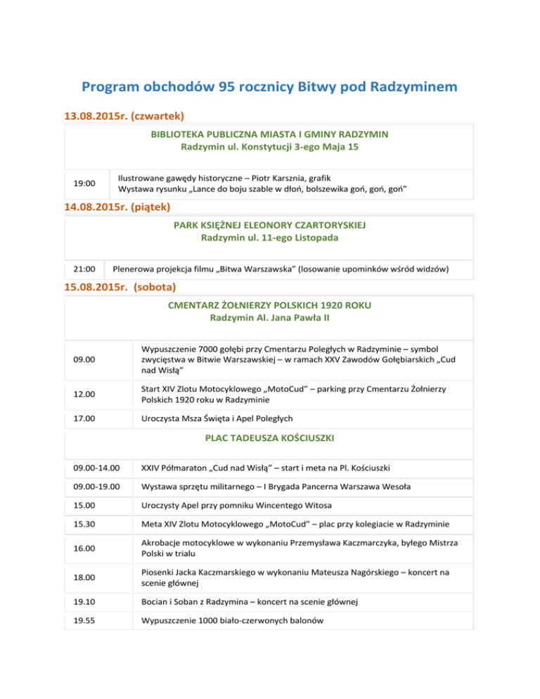 Program obchodów 95 rocznicy Bitwy pod Radzyminem 13.08.2015r. (czwartek) BIBLIOTEKA PUBLICZNA MIASTA I GMINY RADZYMIN Radzymin ul. Konstytucji 3-ego Maja 15 19:00 Ilustrowane gawędy historyczne – Piotr Karsznia, grafik Wystawa rysunku „Lance do boju szable w dłoń, bolszewika goń, goń, goń” 14.08.2015r. (piątek) PARK KSIĘŻNEJ ELEONORY CZARTORYSKIEJ Radzymin ul. 11-ego Listopada 21:00 Plenerowa projekcja filmu „Bitwa Warszawska” (losowanie upominków wśród widzów) 15.08.2015r. (sobota) CMENTARZ ŻOŁNIERZY POLSKICH 1920 ROKU Radzymin Al. Jana Pawła II 09.00 Wypuszczenie 7000 gołębi przy Cmentarzu Poległych w Radzyminie – symbol zwycięstwa w Bitwie Warszawskiej – w ramach XXV Zawodów Gołębiarskich „Cud nad Wisłą” 12.00 Start XIV Zlotu Motocyklowego „MotoCud” – parking przy Cmentarzu Żołnierzy Polskich 1920 roku w Radzyminie 17.00 Uroczysta Msza Święta i Apel Poległych PLAC TADEUSZA KOŚCIUSZKI 09.00-14.00 XXIV Półmaraton „Cud nad Wisłą” – start i meta na Pl. Kościuszki 09.00-19.00 Wystawa sprzętu militarnego – I Brygada Pancerna Warszawa Wesoła 15.00 Uroczysty Apel przy pomniku Wincentego Witosa 15.30 Meta XIV Zlotu Motocyklowego „MotoCud” – plac przy kolegiacie w Radzyminie 16.00 Akrobacje motocyklowe w wykonaniu Przemysława Kaczmarczyka, byłego Mistrza Polski w trialu 18.00 Piosenki Jacka Kaczmarskiego w wykonaniu Mateusza Nagórskiego – koncert na scenie głównej 19.10 Bocian i Soban z Radzymina – koncert na scenie głównej 19.55 Wypuszczenie 1000 biało-czerwonych balonów 20.00 Koncert Kamila Bednarka z zespołem – scena główna 21.30 Video-mapping pt. „Bitwa pod Radzyminem” – projekcja historyczna na budynku UMiG Radzymin 21.45 Pokaz sztucznych ogni 22.00 Koncert zespołu Bala Band ZESPÓŁ SZKÓŁ IM. KS. ELEONORY CZARTORYSKIEJ Radzymin ul. Konopnickiej 24 14.00-19.00 Wyścig kolarski „Cud nad Wisłą” Biuro zawodów – Radzymin ul. Konopnickiej 24 STREFA RODZINNA SCENA W PARKU IM. KSIEŻNEJ ELEONORY CZARTORYSKIEJ 12.00-12.15 Powitanie 12.15-13.15 Teatr TAK – bajka kostiumowa dla dzieci „Nadchodzi Pipi” 13.15-13.45 Dziecięcy show z konkursami cz.1 13.45-15.00 Koncert Radzymińskiej Orkiestry Dętej 15.00-16.00 Dziecięcy show z konkursami cz.2 16.00-17.30 Gry i zabawy dla rodzin z dziećmi z Grupą ProArte 17.30-18.30 Zabawa taneczna dla dzieci - DJ W programie:  spotkanie z Policją – pogawędka na temat bezpieczeństwa  spotkanie ze Strażą Pożarną – konkursy z nagrodami  pogadanka na temat pierwszej pomocy – spotkanie z ratownikiem medycznym  malowanie buziek i konkurs na najpiękniejszy makijaż  „Maluj z mamą, maluj z tatą” – konkurs plastyczny na temat Bitwy Warszawskiej  pogadanka historyczna i konkurs wiedzy historycznej dla dzieci – Jan Wnuk Prowadzenie: Małgorzata Puzio Imprezy towarzyszące 8.08.2015r. (sobota) 10.00 Turniej Plażowej Piłki Siatkowej – RKS „Mazur” Radzymin 10.00 Start Rajdu Rowerowego szlakiem Bohaterów Bitwy o Radzymin, kpt. Stefana Pogonowskiego i mjr Stefana Waltera – plac przed kościołem 14.00 XIII Mazowieckiego Konkursu Sygnalistów i Muzyki Myśliwskiej i XI Krajowy Konkurs Zespołów Rodzinnych Muzyki Myśliwskiej – ROKiS (przesłuchanie) 9.08.2015r. (niedziela) 07.00 XXI Zawody Wędkarskie „Cud nad Wisłą” - stawy hodowlane w Ossowie 10.00 XII Turniej Piłki Nożnej – RKS „Mazur” Radzymin 10.00 Turniej Plażowej Piłki Siatkowej – RKS „Mazur” Radzymin 11.30 Msza Hubertowska z udziałem uczestników Mazowieckiego Konkursu Sygnalistów i Muzyki Myśliwskiej - Kolegiata Radzymińska 14.00 Finał XIII Mazowieckiego Konkursu Sygnalistów i Muzyki Myśliwskiej - ROKiS 15.08.2015r. (sobota) 10.00 XXVI Ogólnopolski Turniej Brydżowy „Cud nad Wisłą” im. Jacka Połulicha - Radzymiński Ośrodek Kultury i Sportu 09.00 I Radzymiński Festiwal Kuchni Regionalnej - pl. T. Kościuszki