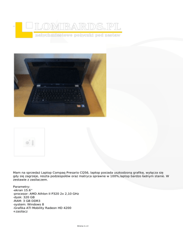 Mam na sprzedaż Laptop Compaq Presario CQ56, laptop posiada uszkodzoną grafikę, wyłącza się gdy się zagrzeje, reszta podzespołów oraz matryca sprawne w 100%,laptop bardzo ładnym stanie. W zestawie z zasilaczem. Parametry: -ekran 15.6'' -procesor: AMD Athlon II P320 2x 2,10 GHz -dysk: 320 GB -RAM: 3 GB DDR3 -system: Windows 8 -Grafika ATI Mobility Radeon HD 4200 +zasilacz Strona 1 z 2 Żory ul.Męczenników Oświęcimskich 44 LOMBARDS.PL W razie pytań jesteśmy do Państwa dyspozycji od poniedziałku do piątku w godzinach od 8 do 18 w soboty od 8 do 14 Zapraszamy na pozostałe nasze oferty Posiadamy duży wybór sprzętu i biżuterii w najniższych cenach !!! NIE PRZEPŁACAJ !!! Strona 2 z 2