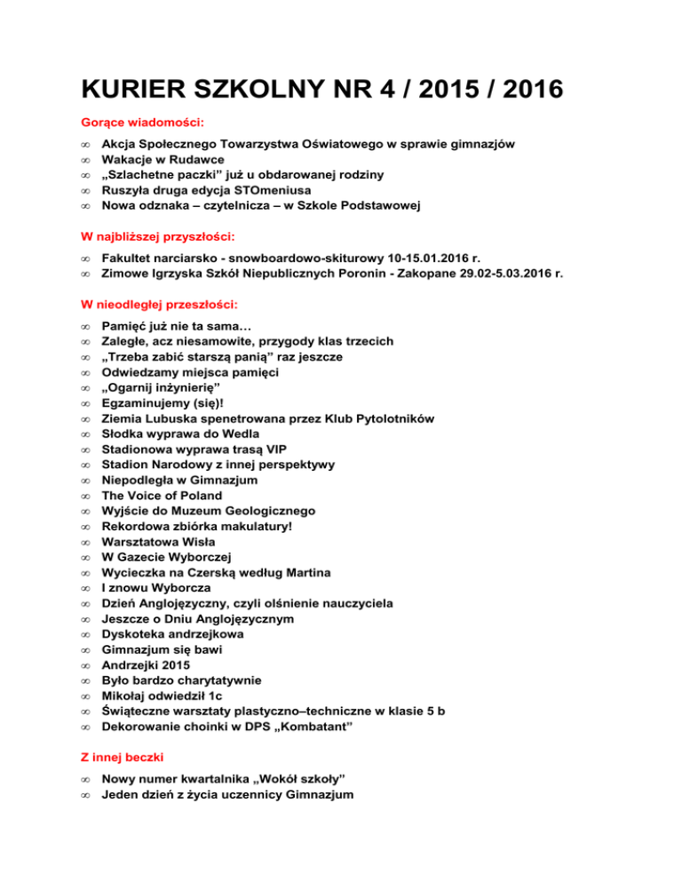 KURIER SZKOLNY NR 4 / 2015 / 2016 Gorące wiadomości: • • • • • Akcja Społecznego Towarzystwa Oświatowego w sprawie gimnazjów Wakacje w Rudawce „Szlachetne paczki” już u obdarowanej rodziny Ruszyła druga edycja STOmeniusa Nowa odznaka – czytelnicza – w Szkole Podstawowej W najbliższej przyszłości: • • Fakultet narciarsko - snowboardowo-skiturowy 10-15.01.2016 r. Zimowe Igrzyska Szkół Niepublicznych Poronin - Zakopane 29.02-5.03.2016 r. W nieodległej przeszłości: • • • • • • • • • • • • • • • • • • • • • • • • • • • Pamięć już nie ta sama… Zaległe, acz niesamowite, przygody klas trzecich „Trzeba zabić starszą panią” raz jeszcze Odwiedzamy miejsca pamięci „Ogarnij inżynierię” Egzaminujemy (się)! Ziemia Lubuska spenetrowana przez Klub Pytolotników Słodka wyprawa do Wedla Stadionowa wyprawa trasą VIP Stadion Narodowy z innej perspektywy Niepodległa w Gimnazjum The Voice of Poland Wyjście do Muzeum Geologicznego Rekordowa zbiórka makulatury! Warsztatowa Wisła W Gazecie Wyborczej Wycieczka na Czerską według Martina I znowu Wyborcza Dzień Anglojęzyczny, czyli olśnienie nauczyciela Jeszcze o Dniu Anglojęzycznym Dyskoteka andrzejkowa Gimnazjum się bawi Andrzejki 2015 Było bardzo charytatywnie Mikołaj odwiedził 1c Świąteczne warsztaty plastyczno–techniczne w klasie 5 b Dekorowanie choinki w DPS „Kombatant” Z innej beczki • • Nowy numer kwartalnika „Wokół szkoły” Jeden dzień z życia uczennicy Gimnazjum • Zbiórka baterii w Szkole nadal trwa Gorące wiadomości: Akcja Społecznego Towarzystwa Oświatowego w sprawie gimnazjów Zapowiadane przez rząd „wygaszenie”, czyli likwidacja gimnazjów budzi znaczne kontrowersje w społeczeństwie (głosowanie widzów w debacie telewizyjnej 16.12. zakończyło się wynikiem 51% : 49% na niekorzyść zwolenników tej zmiany) i duże poruszenie w środowisku oświatowym. Podczas dyskusji, która odbyła się w końcu listopada podczas dorocznego spotkania prezesów kół i dyrektorów szkół STO, zdecydowanie dominowało przekonanie, że należy stanąć w obronie gimnazjów. W związku z tym Zarząd Główny Społecznego Towarzystwa Oświatowego przygotował list otwarty, adresowany do naczelnych organów władz państwowych, z którego treścią można zapoznać się pod adresem: www.stoplikwidacjigimnazjow.pl. Tamże można złożyć podpis pod petycją STO w tej sprawie. Zdając sobie sprawę, że również wśród odbiorców niniejszego „Kuriera” znajdują się zarówno zwolennicy, jak przeciwnicy zapowiadanej reformy, a każde z tych skrajnych stanowisk może być wsparte rzeczowymi argumentami, zachęcam do odwiedzenia mojego bloga, znajdującego się pod adresem www.wokolszkoly.edu.pl, gdzie we wpisie pt. „Zamiast wygaszać, lepiej rozpalić!” zamieściłem propozycję „trzeciej drogi” postępowania. Uważam bowiem, że naprawdę szkoda dorobku 15 lat funkcjonowania gimnazjów, a przyłączenie dwóch roczników do szkoły podstawowej to pomysł zaiste fatalny. Z drugiej strony jednak trzyletnie liceum ogólnokształcące jest tylko karykaturą swojego czteroletniego pierwowzoru. Istnieje wszakże rozwiązanie, które pozwoliłoby „mieć jabłko i zjeść jabłko”. Szkicuję je w najnowszym wpisie na swoim blogu, zbierając przy okazji argumenty „za” i „przeciw” gimnazjom. Zapraszam do lektury. Jarosław Pytlak Wakacje w Rudawce Dla wszystkich, którzy z dużym wyprzedzeniem planują wakacyjne wojaże swoich dzieci, przekazujemy informację na temat planowanych terminów przyszłorocznych „Wakacji w Rudawce”. W przeciwieństwie do minionego sezonu nie ma żadnych przeszkód organizacyjnych (obiekt ma „papiery” do 2020 roku), więc możemy już teraz przyjmować wstępne rezerwacje miejsc. Zapraszamy zatem: • gimnazjalistów i uczniów kończących szóstą klasę szkoły podstawowej na turnus historyczno-krajoznawczy od 26 czerwca do 3 lipca, • uczniów szkoły podstawowej na turnusy w terminach – do wyboru – 3-10 lub 10-17 lipca, przyrodniczo-krajoznawcze, • nauczycieli (z rodzinami) od 17 do 23 lipca. Uwaga! W nadchodzącym sezonie pragniemy również zaprosić do Rudawki rodziny naszych uczniów. W okresie od 23 lipca do 7 sierpnia jest możliwość skorzystania z Bazy Terenowej w Rudawce na kilkudniowy prywatny pobyt rodzinny. Zapewniamy miejsca noclegowe (w cenie 14 zł./os./noc) oraz możliwość samodzielnego gotowania lub wykupienia wyżywienia w barze „Pod Słowikiem”. Rezerwacje będą przyjmowane do wyczerpania limitu miejsc (16 uczestników w każdym turnusie) lub wolnych pokoi (w Bazie mogą przebywać równocześnie max. 3 rodziny). Zgłoszenia prosimy kierować pocztą elektroniczną na adres [email protected]. Uwaga! Uczestnicy przyszłorocznych „Wakacji” będą proszeni o zabranie ze sobą własnego egzemplarza „Przewodnika po okolicy Rudawki”, który wydaliśmy w tym roku. Z pierwszego nakładu pozostało jeszcze sześć egzemplarzy, które przeznaczamy dla posiadaczy odznak rudawkowych. Cena specjalna dla „czerwonego” rudawkowicza wynosi zaledwie 1 zł. (słownie: jeden). Dla „niebieskiego” – 5 zł., zaś dla „zielonego” – 10 złotych. Książki w tych cenach można zakupić u Pana Dyrektora, a oferta obowiązuje do wyczerpania zapasu. Cena regularna wynosi 19 zł. Nauczycielski zespół sympatyków Rudawki „Szlachetne paczki” już u obdarowanej rodziny Dokładnie 13 paczek zawieźliśmy Pytolotem 12 grudnia do Błonia, do lokalnego centrum akcji „Szlachetna paczka”. Użycie furgonetki było o tyle wskazane, że w tej trzynastce znalazły się, między innymi, kanapa oraz pralka. W fotelu pilota usiadła w Pytolocie pani Marzena Derejko, zaś uczniów i rodziców reprezentował w drugim samochodzie Mateusz Szczepański z klasy 5a wraz z tatą. Pani Marzena całą drogę dzieliła się ze mną zachwytem nad 