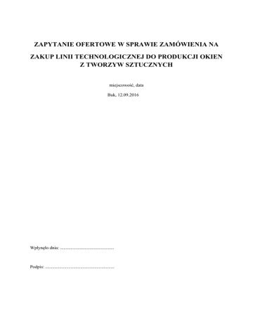 ZAPYTANIE OFERTOWE W SPRAWIE ZAMÓWIENIA NA ZAKUP LINII TECHNOLOGICZNEJ DO PRODUKCJI OKIEN Z TWORZYW SZTUCZNYCH miejscowość, data Buk, 12.09.2016 Wpłynęło dnia: .............................................. Podpis: ........................................................... 1. Nazwa i adres Zamawiającego. Bros s.j. Andrzej Górczak , Jarosław Siekańskański Producent Okien i dzrwi PCV i Alu 64-320 Buk, ul. Przemysłowa 8a NIP 777-24-37-775 2. Tryb udzielania zamówienia. Zamówienie będzie udzielane w trybie postępowania ofertowego. Zamawiający dopuszcza możliwość przeprowadzenia negocjacji. 3. Opis przedmiotu zamówienia. Przedmiotem zamówienia jest zakup linii technologicznej do produkcji stolarki okiennej z tworzyw sztucznych, na którą to linię technologiczną składają się następujące urządzenia: 1. Automat do podfrezowywania końcówek uciętych profili 1 szt. automatyczny cykl pracy sterowanie oparte na PLC dociski pneumatyczne obrabianych profili cztery niezależne wysokoobrotowe agregaty frezujące agregaty umieszczone na prowadnicach liniowych minimum sześciostopniowa regulacja wysokości agregatów frezowanie ram i skrzydeł okiennych szerokość profili do 125 mm wysokość profili do 100 mm 2. Automat do wiercenia pod klamkę i frezowania pod zasuwnicę 1 szt. hydropneumatyczny posuw głowicy trójwrzecionowej (także przez stal) pneumatyczny posuw głowicy jednowrzecionowej podwójny poziomy docisk pneumatyczny silnik trójfazowy 1,1 kW 1400 obr/min - otwory pod klamkę silnik trójfazowy 0,5 kW 2800 obr/min - otwory pod zasuwnice 2 wiertła HSS 10x85x105mm 1 frez HSSE 10x25x100mm 1 wiertło HSS 12x47x105mm urządzenie centrujące dla okuć z klamką środkową ograniczniki manualne dla okuć ze stałą wysokością klamki 3. Linia zgrzewająco – czyszcząca 1 szt. Zgrzewarka czterogłowicowa pozioma maksymalny wymiar zgrzewu 3200 x 2800 mm podwójny napęd osi za pomocą listew zębatych automatyczne połączenie i przekazywanie danych z oczyszczarką sterowanie za pomocą komputera PC stalowe blaty robocze niezależny panel sterowania z komputerem klasy PC zawierającym: monitor LCD, wyjście USB, klawiaturę, mysz, Windows lub równoważny karta sieciowa 10/100 Mb wysokość profila 50-180mm szerokość profila 30-140mm pobranie materiału 6mm wylewka 2 mm podgrzewane noże radiowy skaner kodów kreskowych stacja odtransportowująca zgrzewki pośrednia stacja chłodzenia Dwuosiowa oczyszczarka naroży CNC 2 osie napędzane numerycznie napęd realizowany za pomocą silników magnetycznych szybkie i proste programowanie wsparte grafiką sterowanie za pomocą komputera PC niezależny panel sterowania z komputerem klasy PC zawierającym: nowoczesny, płaski, kolorowy monitor LCD, klawiatura, mysz, CD ROM, USB, karta sieciowa 10/100 Mb, system operacyjny Windows lub równoważny wysokość profila: 40-180mm szererokość profila: 50-130mm zestaw agregatów obróbczych na obydwu maszynach: - do oczyszczania powierzchni płaskich z rowkiem - do oczyszczania powierzchni płaskich bez rowka - do oczyszczania skosów i zaokrągleń - do oczyszczania pod uszczelkę ( frez obrotowy) - tarcza do oczyszczania konturu zewnętrznego Automatyczna stacja obracająca zgrzewki transportuje i obraca zgrzewki w połączeniu z oczyszczarką zawiera: - szkielet metalowy wyłożony profilami szczotkowymi - napędzany elektrycznie wózek transportujący zgrzewki - chwytak przeciągający zgrzewki - takt pracy zakodowany w procesorze czyszczarki do naroży wymiary zgrzewki: min 400x400mm, max 2600x2600mm programowanie profili 4. Automatyczna piła do listew przyszybowych z przymiarem elektronicznym 1 szt. pokrętło z cyfrowym wskażnikiem analogowym do regulacji położenia listwy pneumatyczny docisk materiału komplet tarcz z frezami podcinającymi (2x250mm, 2x150mm) 2 silniki trójfazowe z regulacją prędkości obrotowej - każdy 0,75 kW ręczna regulacja wysokości położenia stołu roboczego cena zawiera podkładki uniwersalne - stosowane tylko z symulatorem Przymiar elektroniczny - pobieranie danych z teleskopu, z klawiatury oraz sieci możliwość używania korekt względnych (np. 1%) lub bezwględnych (np. 1mm) podział na wózki możliwość wprowadzania wymiarów z klawiatury automatycznie ustawiany ogranicznik długości cięcia (zderzak) prowadnica z rolkami dł. 3000mm szer. 200mm teleskop pomiarowy z nadajnikiem radiowym (z przedłużeniem 1000mm) - 2500mm 4. Termin realizacji zamówienia. IV kwartał 2016 roku 5. Miejsce dostawy: Buk ul. Przemysłowa 8a 6. Zamówienia częściowe. Zamawiający nie dopuszcza składania ofert częściowych 7. Informacja o ofercie wariantowej. Zamawiający nie dopuszcza składania ofert wariantowych 8. Opis warunków udziału w postępowaniu oraz sposobu dokonywania oceny spełnienia tych warunków. 8.1 W postępowaniu mogą wziąć udział Wykonawcy, którzy spełniają następujące warunki: a. posiadają uprawnienia do wykonywania działalności lub czynności w zakresie odpowiadającym przedmiotowi zamówienia b. posiadają niezbędną wiedzę i doświadczenie oraz dysponują potencjałem technicznym i osobami zdolnymi do wykonania zamówienia. 8.2 Ocena spełnienia warunków udziału w niniejszym postępowaniu dokonana zostanie na zasadzie spełnia / nie spełnia w oparciu o informacje zawarte w dokumentach i oświadczeniach złożonych przez Wykonawców 9. Wykaz oświadczeń i dokumentów, jakie mają dostarczyć wykonawcy w celu potwierdzenia spełnienia warunków udziału w postępowaniu. W celu spełnienia wymogu podanego w punkcie 8.1a: Aktualny odpis z właściwego rejestru albo aktualne zaświadczenie o wpisie do ewidencji działalności gospodarczej, jeżeli odrębne przepisy wymagają wpisu do rejestru lub zgłoszenia do ewidencji działalności gospodarczej, wystawiony nie wcześniej niż 6 miesięcy przed upływem terminu składania ofert. W celu spełnienia wymogu podanego w punkcie 8.1b: Lista realizacji id